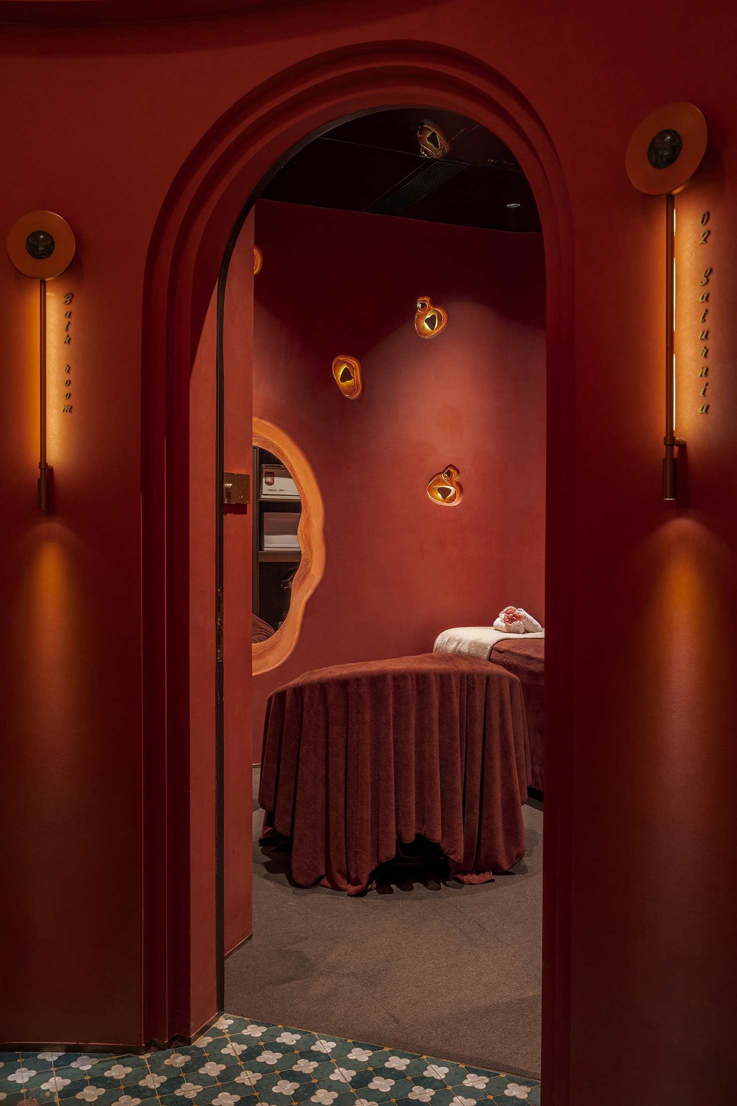 雪瑞尔品牌源于意大利,旨在为客人提供意式风情的轻松疗愈体验。空间设计灵感源于古罗马建筑和火山温泉的奇妙映射,经典的拱券、穹顶与温泉的轻松、柔美相融合。门头设计以液态大理石打造出蜿蜒的泉溪,引人入内,主体功能有展示接待、检测、休息、中庭与 5 个以意大利温泉命名的房间。中庭灵感来自罗马万神殿,穹顶下方是一方涌泉不断的古典水景,传递品牌精神。芳疗室水疗室的设计表达温泉水汽的蒸腾向上,细节展现不同温泉特色。
