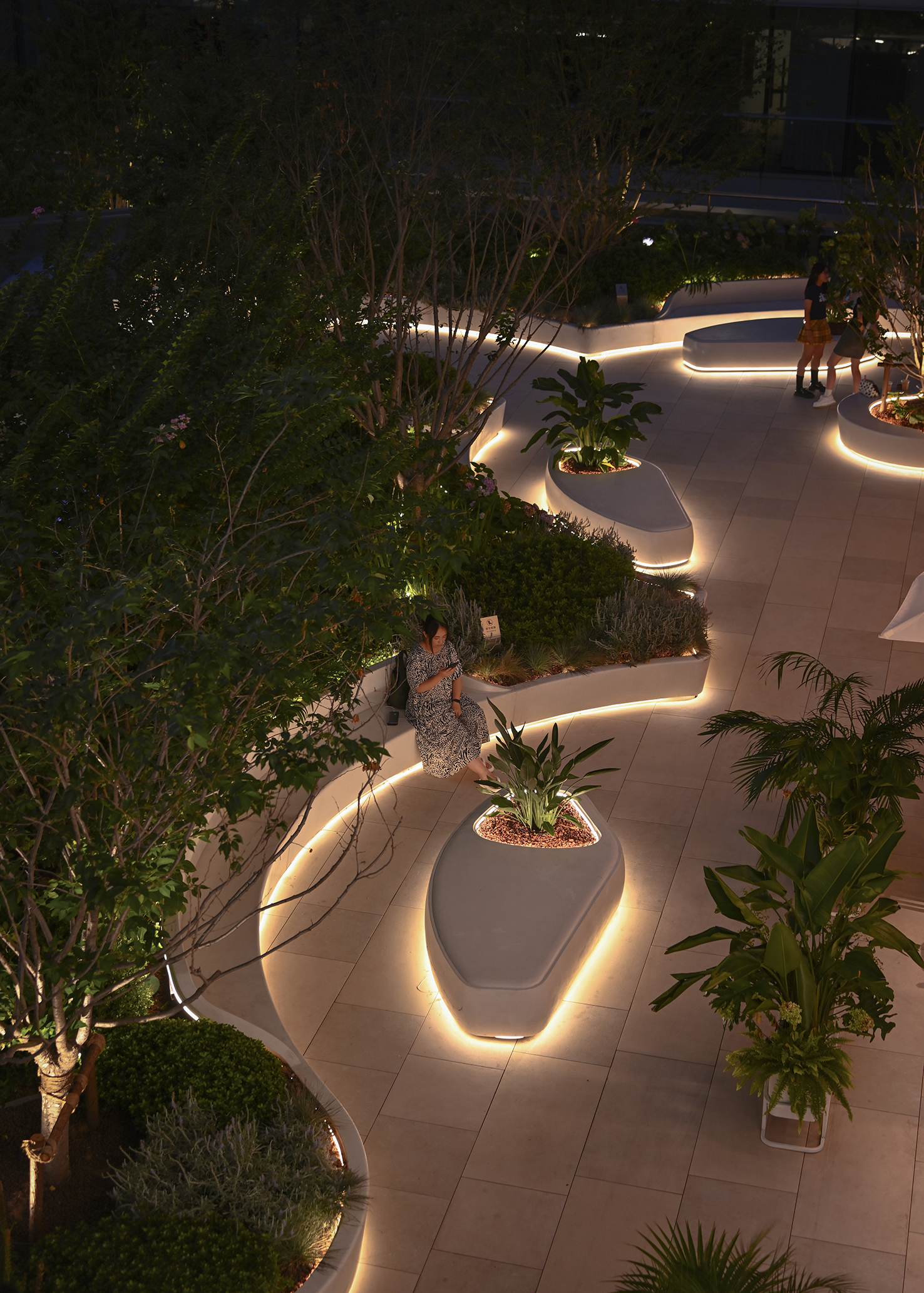 青岛万象城二期屋顶花园改造设计目标是把客流量最少,最生硬、暴晒的屋顶“沙漠”转变为独具魅力的“呼吸”卖场。作为一个不断激发商业活力个性事件发生的容器,用云的颜色、形态构筑场地骨架,白色为主调,其松弛自由的形态与商业建筑硬朗线条反差强烈,从而成视觉焦点。白色为主色调,简洁大方,能够反射周围的光线,营造出明亮而宽敞的空间感。植组团构错落有致,刻意营造空间被自然包裹的尺度和叶片触手可及的体验,在营造视觉丰富性的同时,也赋予商业良好的观赏面,还为顾客提供了亲近自然的体验。