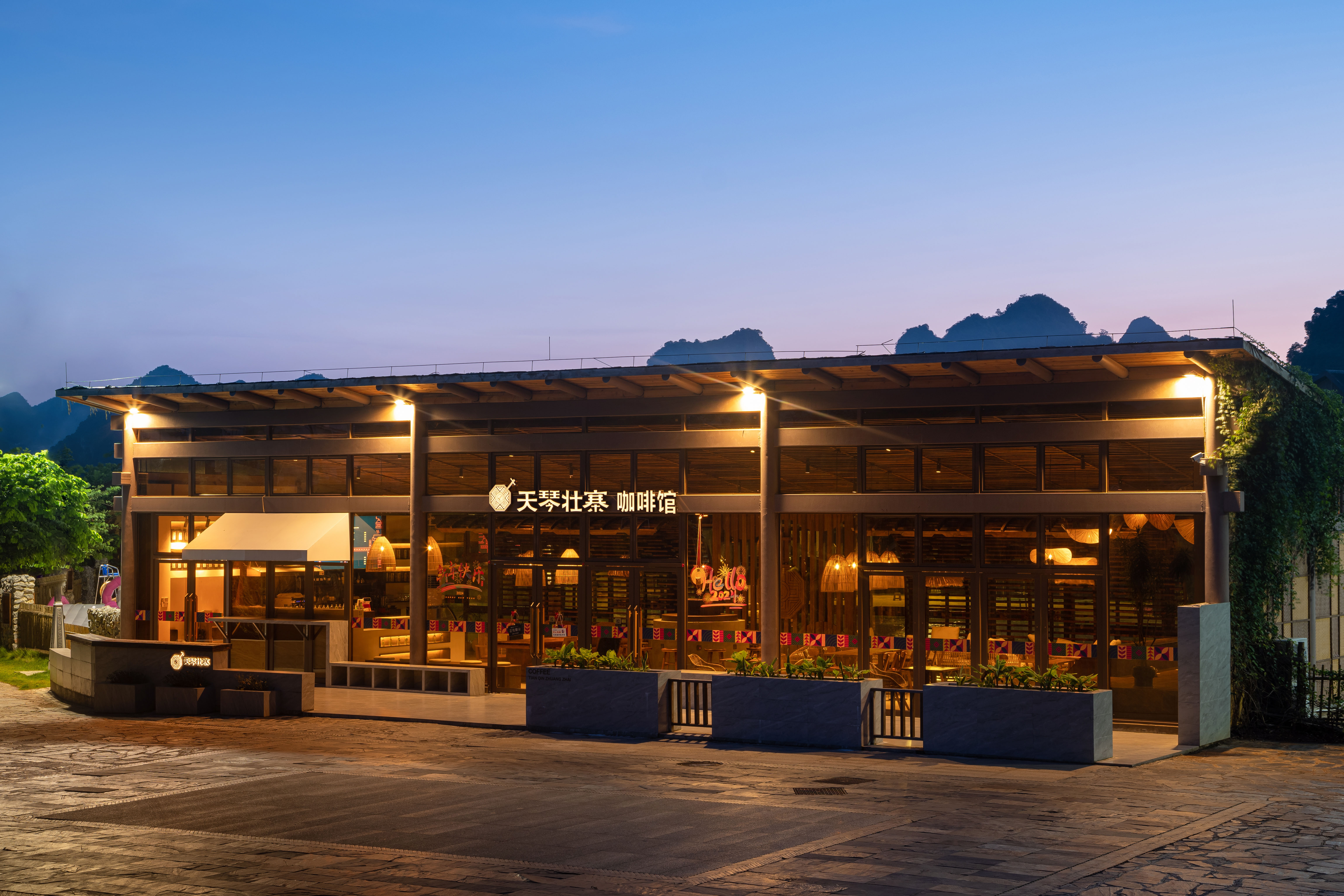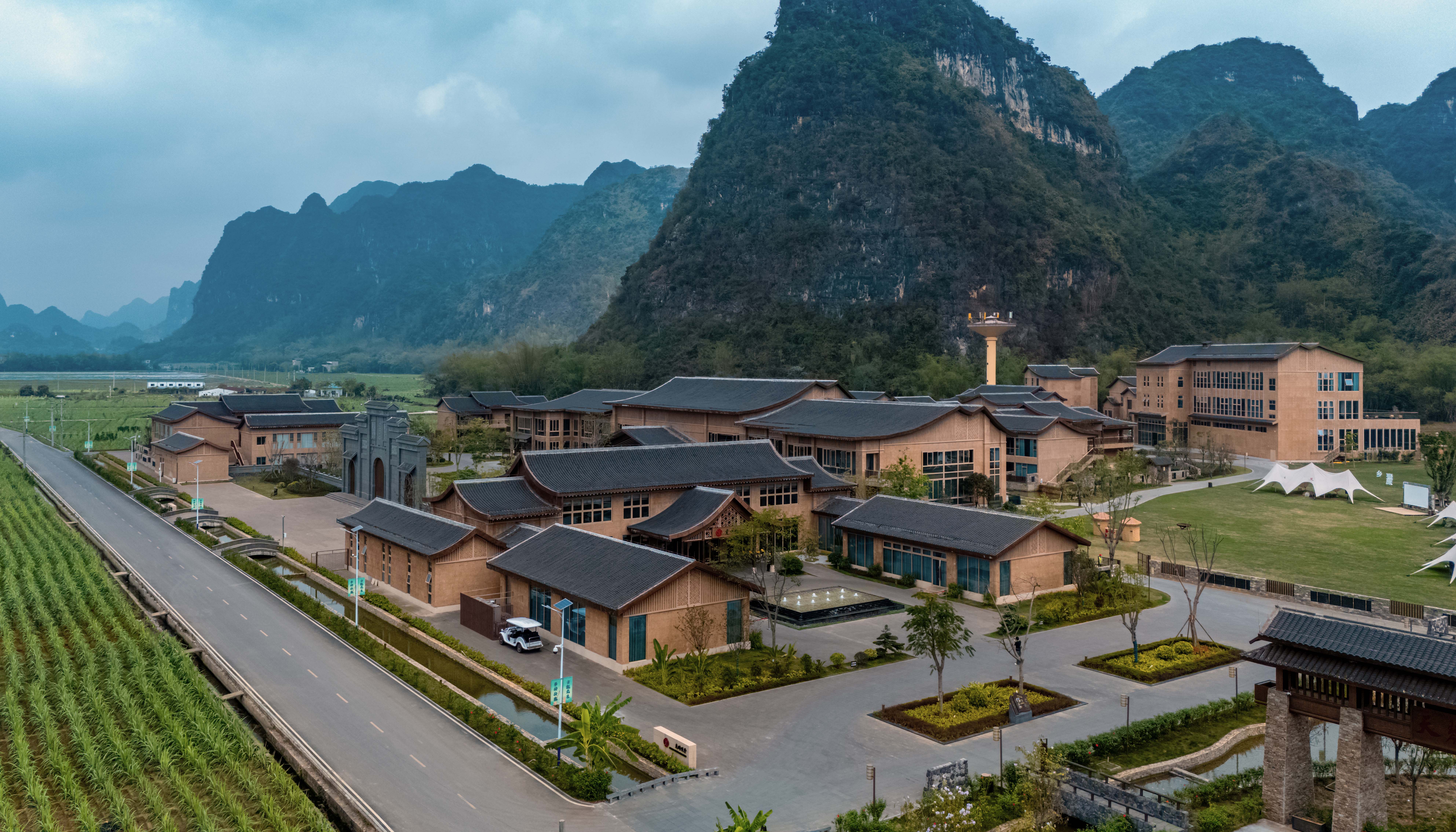 将杆栏式建筑、人字坡小青瓦、夯土墙等地域符号转化为建筑肌理,结合当地的天琴、壮锦、农耕等非物质文化融入功能区域设计。借鉴“框景”、“借景”、“对景”手法,还原了广西杆栏式建筑魅力,使传统的壮族文化重放异彩。