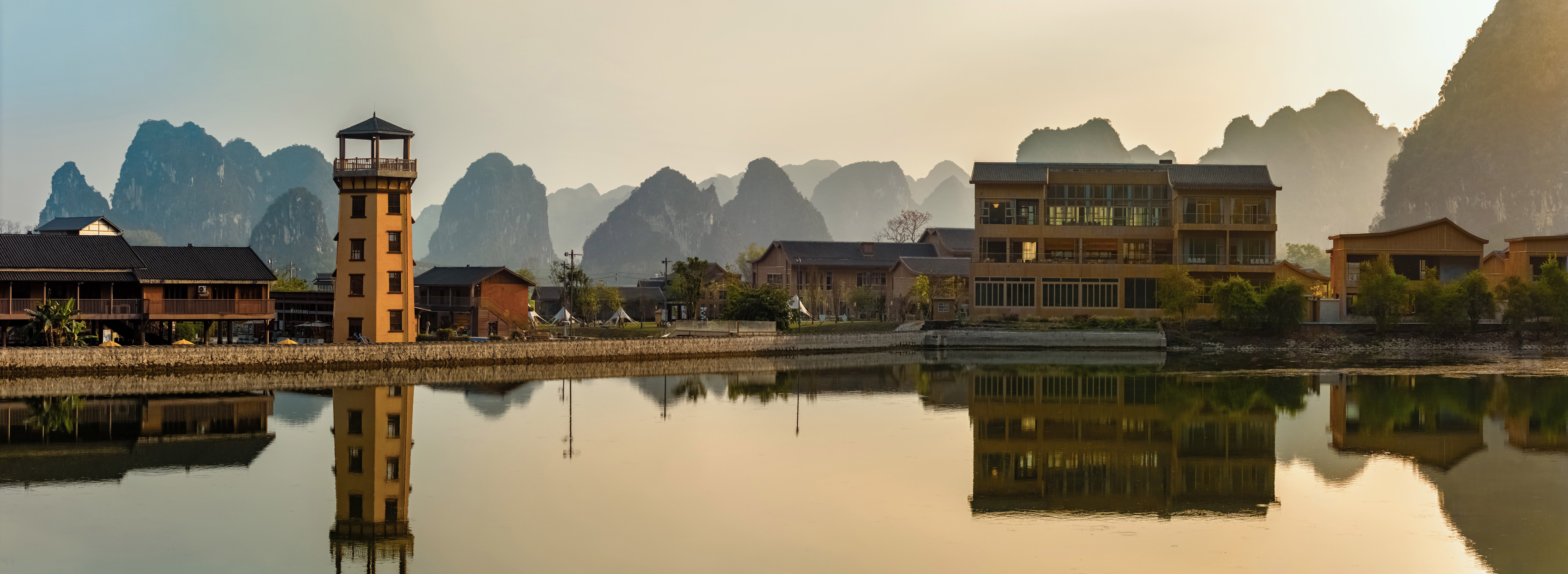 项目立足于喀斯特地貌山水间,定位为农文旅高端度假酒店。以山水入画,将周围的山峦、水库、蔗海纳入空间。设置有公共服务区、住宿区、民俗文化区。