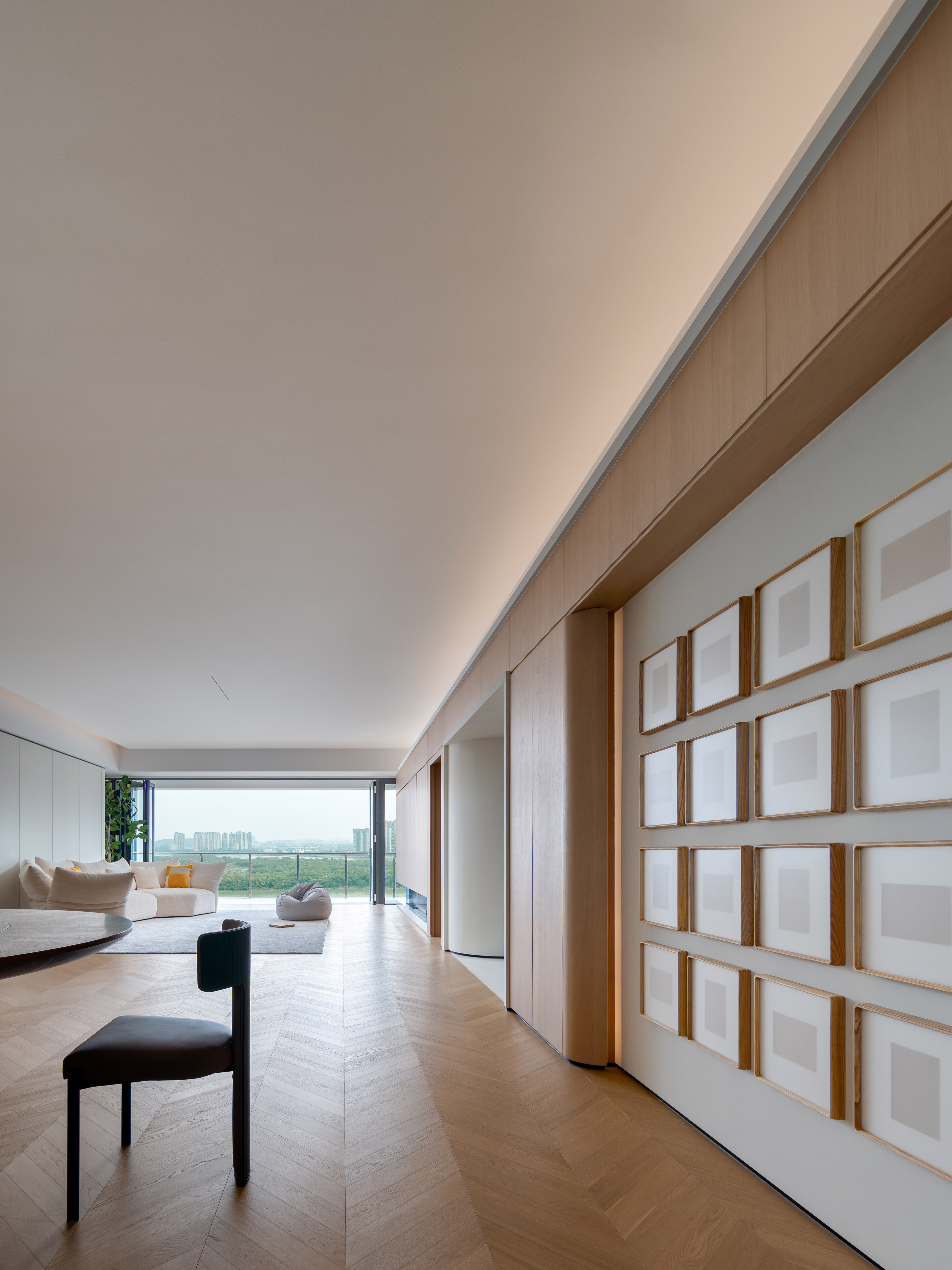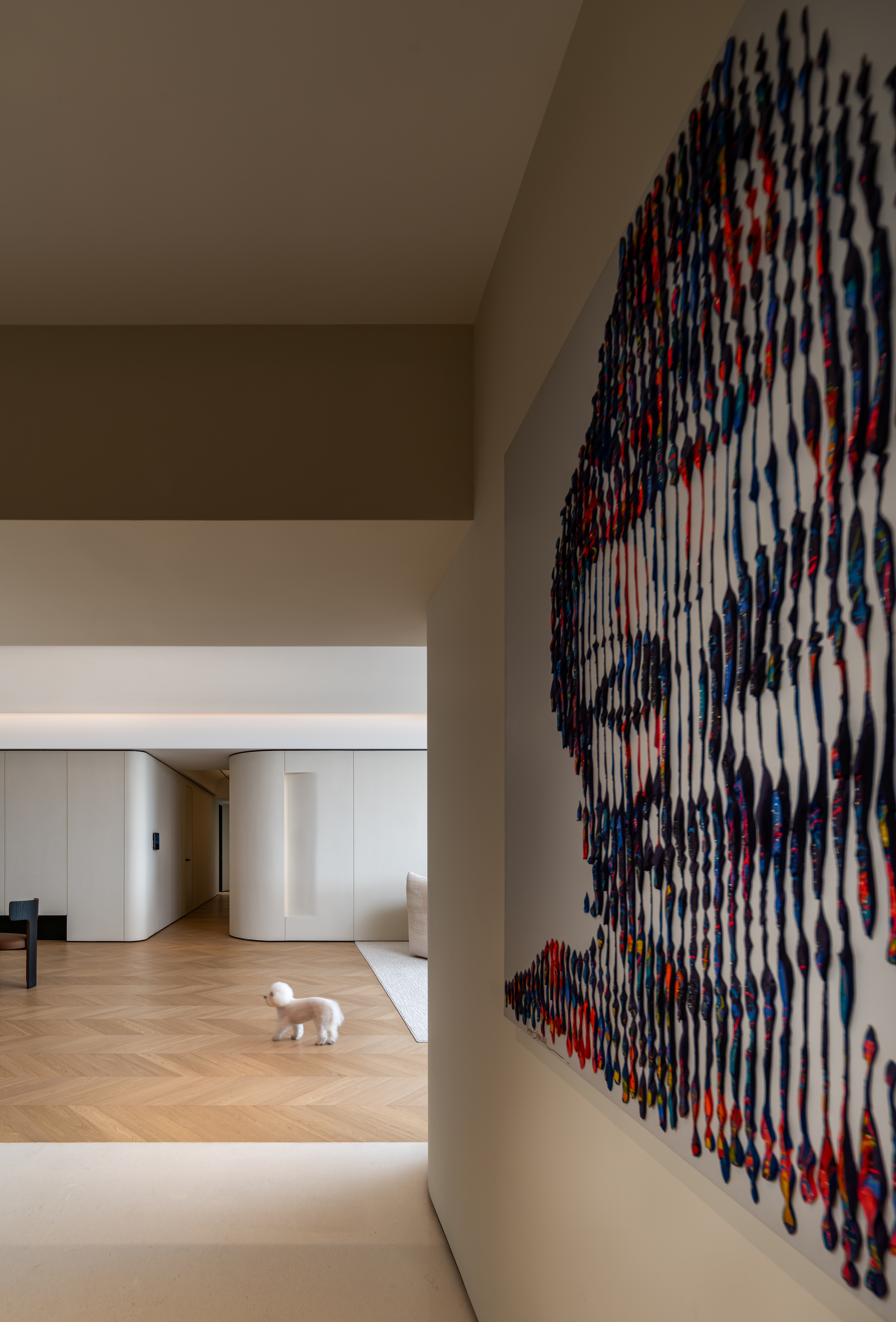 一个空间的性格,将会赋予在其中之个体一种感受。一个主人也同时赋予着这个空间的灵性。心与景相辉映,视觉与感觉同频率,是我们这次创作的主旨。业主希望住宅的画面和空间要绝对的纯粹,简约。要像禅修洗涤后的那种明白纯粹。我们先利用各空间的特性,用极度统一的材质和色调,将各空间意境上结合,引入弧线的元素提高空间额灵性和人心灵视觉的交流。当设计手法高度统一之后,整个空间气质就带给空间里的个体无限的心缇。心静也要境明。众生心垢净,菩提影现中,迦于心,品于境,一心一迦境。