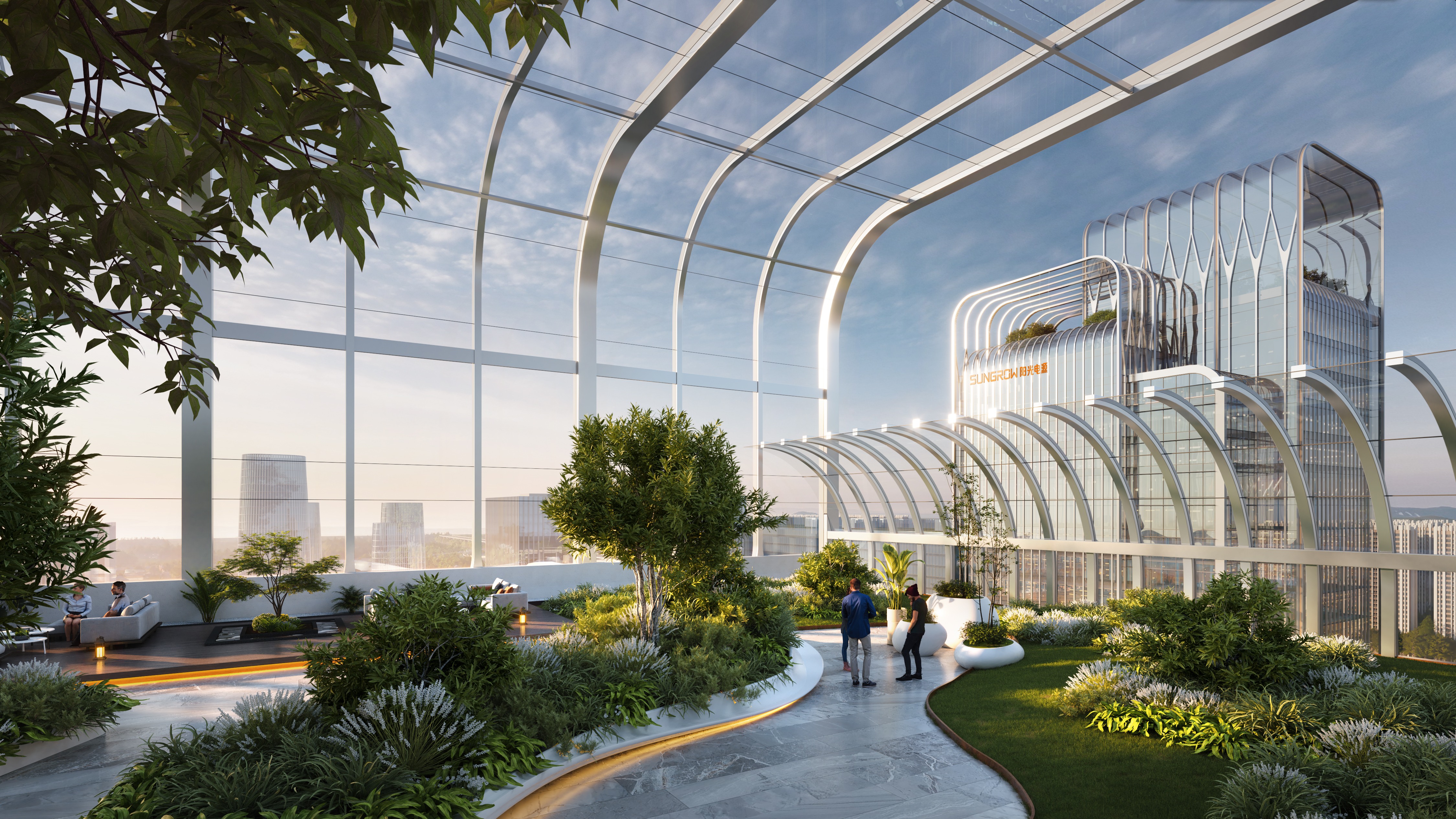 建筑形态结合当地良渚文化的古玉,璧圆象天,琮方象地。裙房的设计形似鸟巢,塔身设计灵感源于古代玉器“琮”,塔冠采用“金关玉锁”民俗理念,呼应塔顶层叠退台,环环相扣,紧密相连。