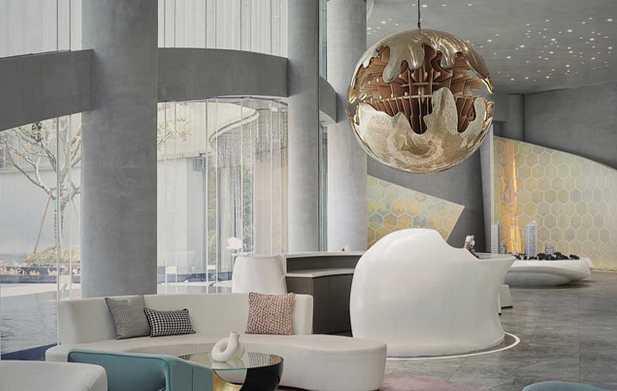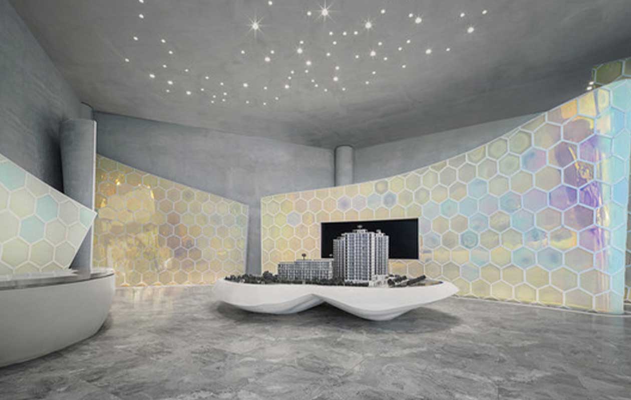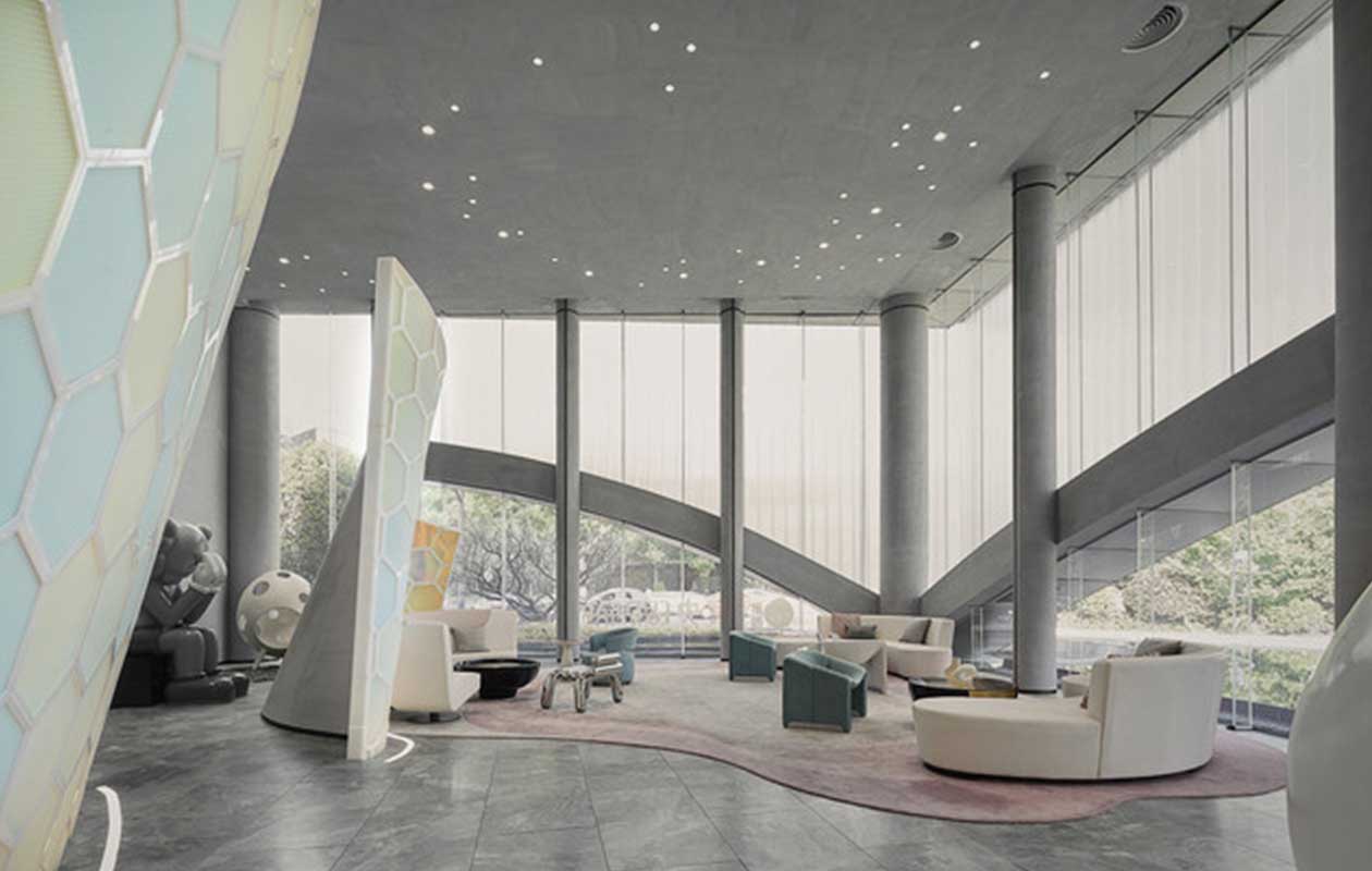 当物质需求得到了满足,精神消费决定了人的生活品质。当下无论是用户的审美和精神生活的提升,还是市场的竞争,都给传统的售楼处提出了新的要求,打造场景IP的“公共艺术中心”应运而生。根据建筑的开敞形式我们希望把客户的目光更多地留在窗边,在平面规划上前场皆在可视面,室内外景观相融一体。设计师将更多精力放在了隔墙的处理,通过处理体态使得其更为醒目,提升记忆点。蜂巢元素贯穿整个项目主体,与网面材质之间碰撞出不一样的火花,显得新颖有趣。