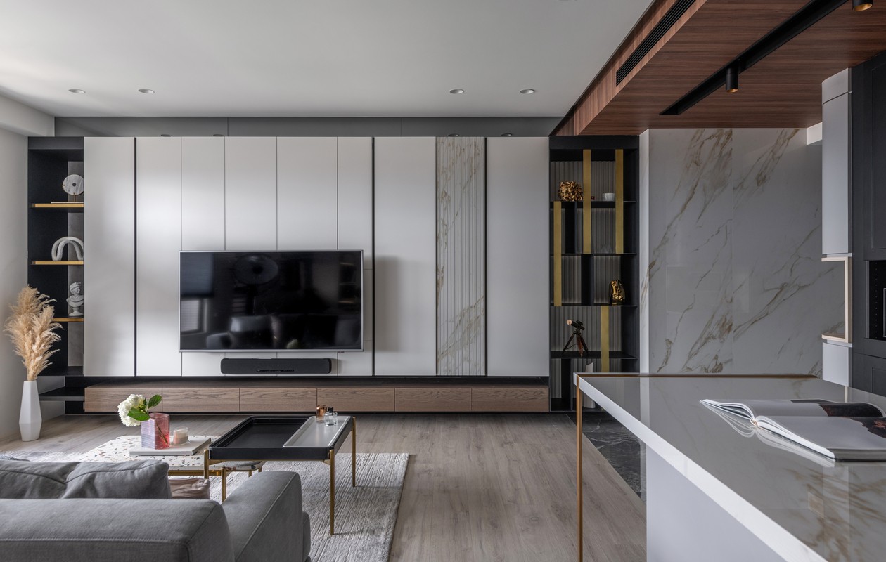 喜歡開闊視野,將原本狹小的三房改成兩房,封閉式廚房位移到外面成為開放廚房和中島吧檯,在家工作書桌結合餐桌放置在沙發後方。起居空間借助家具和走道做為區隔,整體動線都可以在最短路徑中抵達即使開放式環境每個區域的空間定義卻是很明確,也將原本走道空間釋放增加坪效。除了增大空間,俐落線條感也是設計的核心,採用薄板磚修飾入門口大柱子,與旁邊中島檯面相互呼應。灰、白、棕三色打下沉穩基調,佐以金紋搏板磚和金色鐵件,增添高貴氣息。餐區旁的展示櫃,盡顯屋主的人文雅趣;圓潤燈具柔和了原本過於冷硬的氣氛,沙發和餐椅選用絨布材質,輕軟蓬鬆的觸感,讓人可以徹底卸下壓力,好好的放鬆,全然不受拘束。