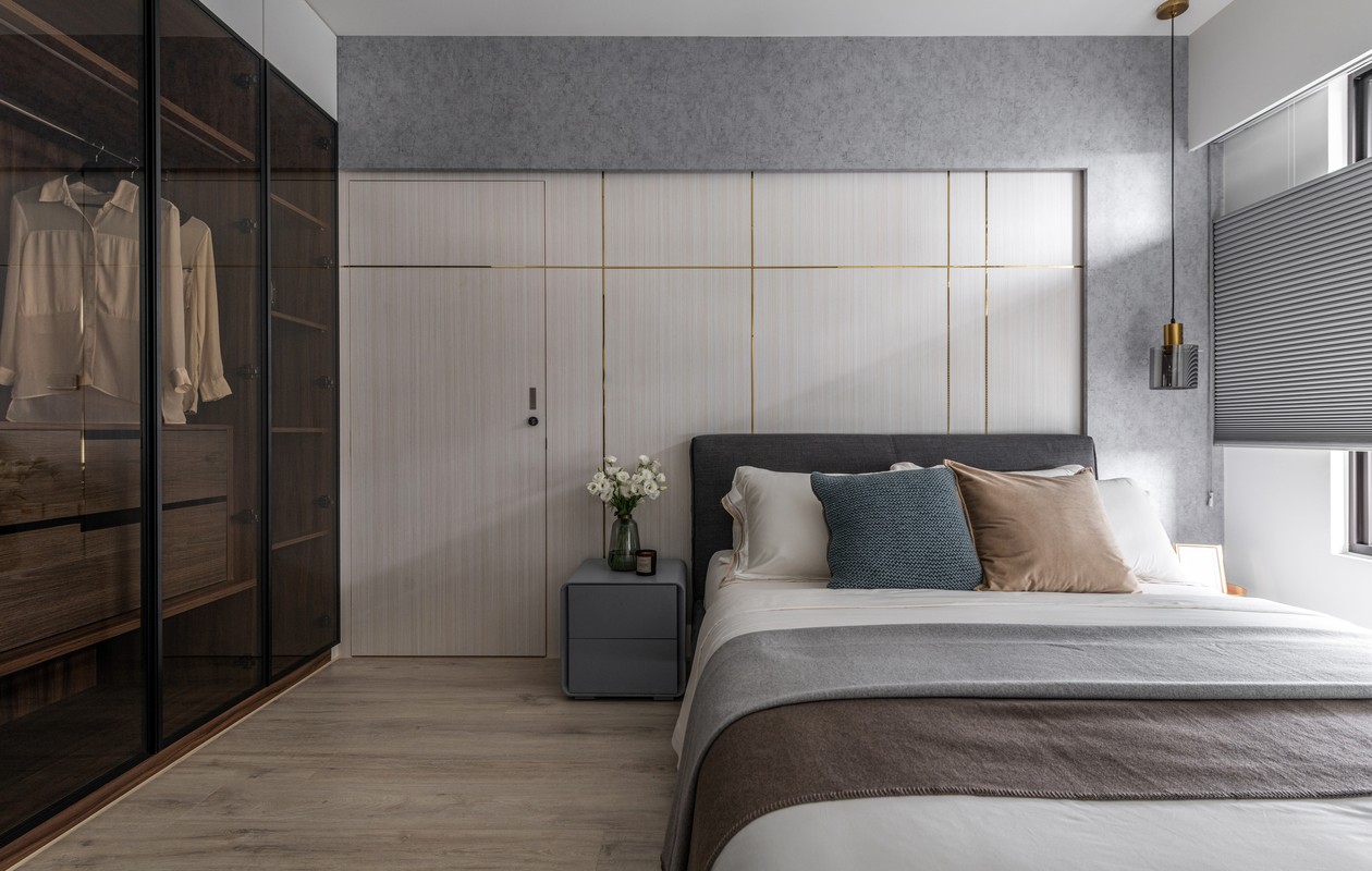 主臥室床頭與床尾牆面相互搭配,流線型金色飾條搭配隱藏門,時尚又摩登,即使進入臥室休息也是一場視覺饗宴,愜意又放鬆,令人細細品嘗回家的滋味。