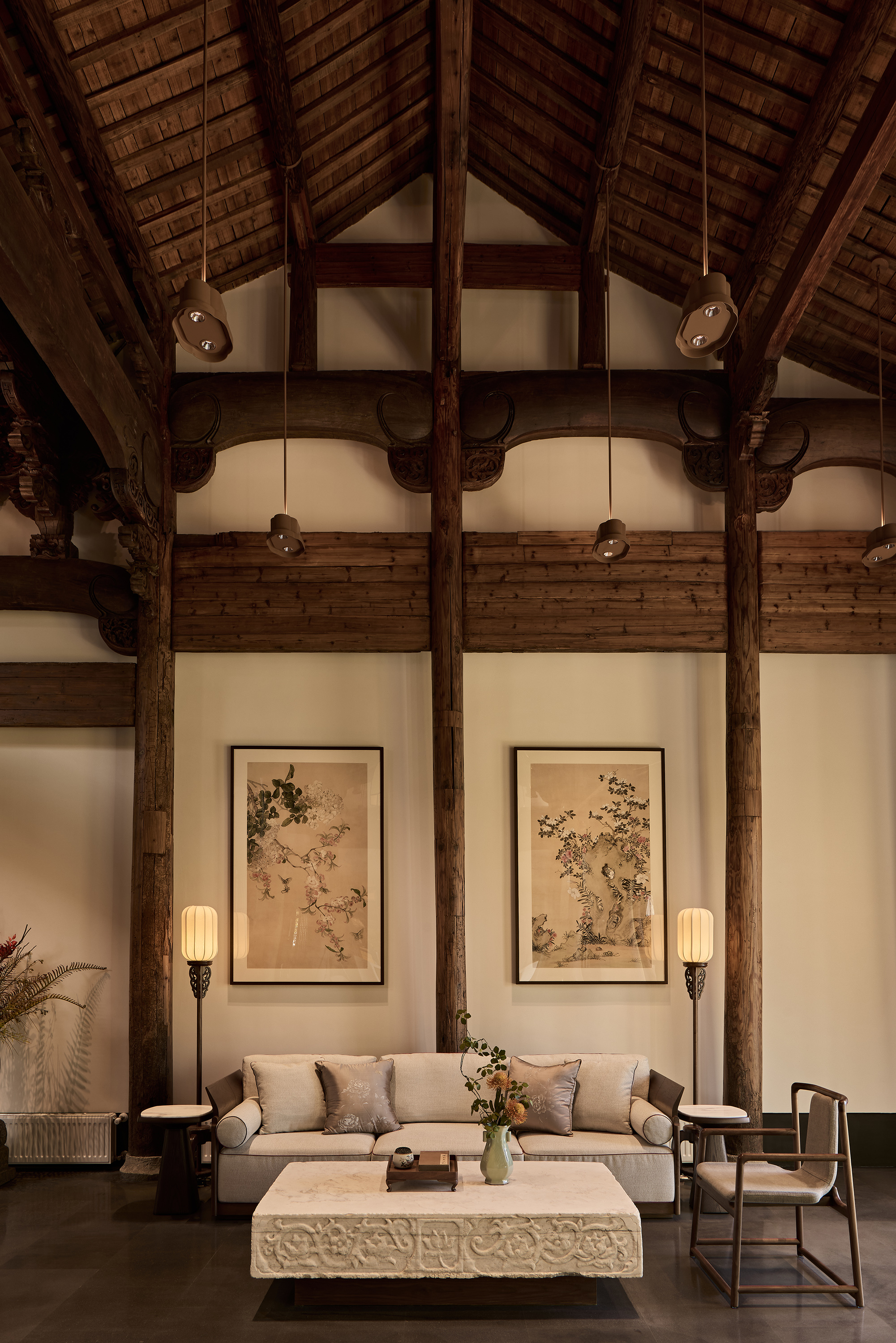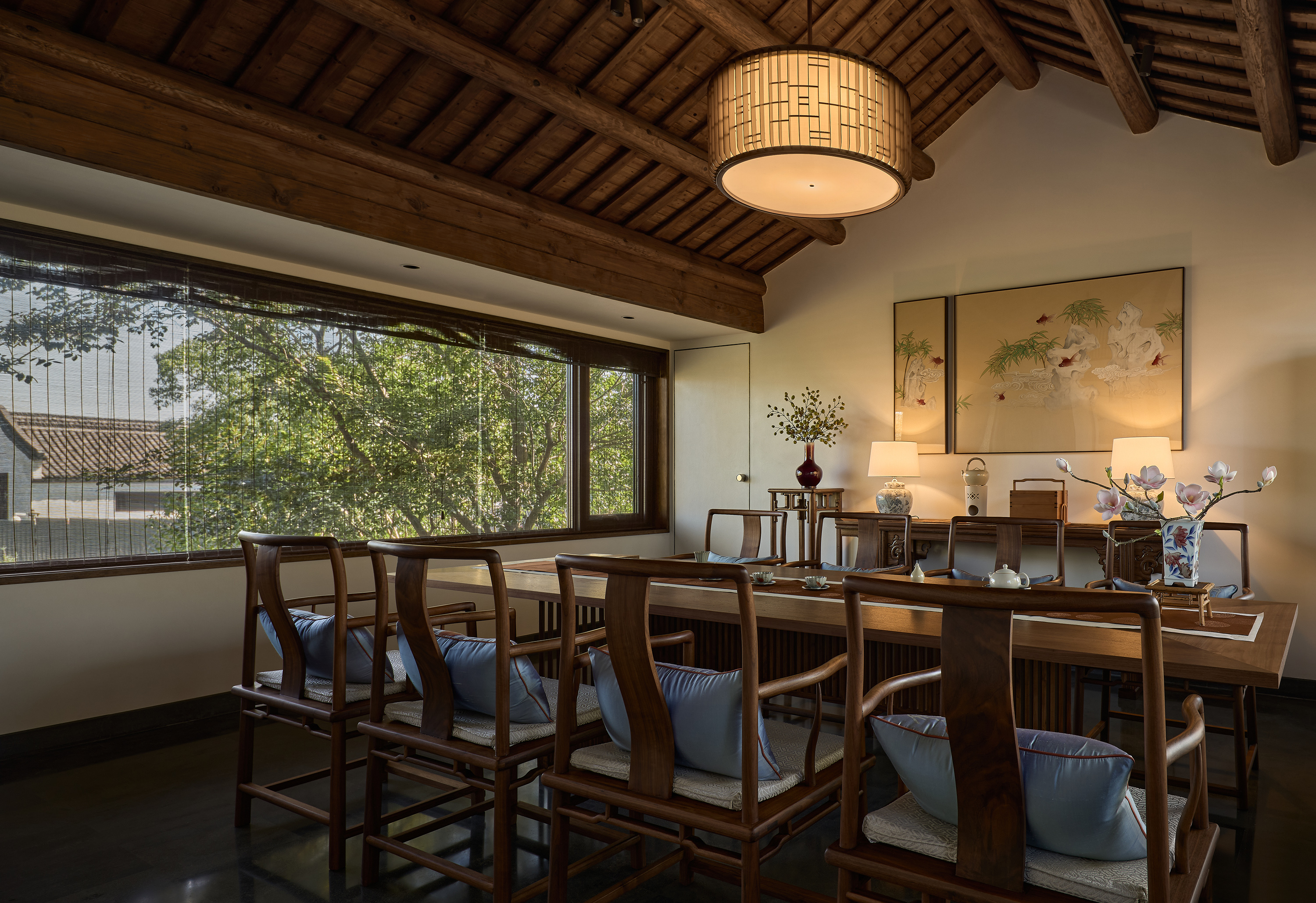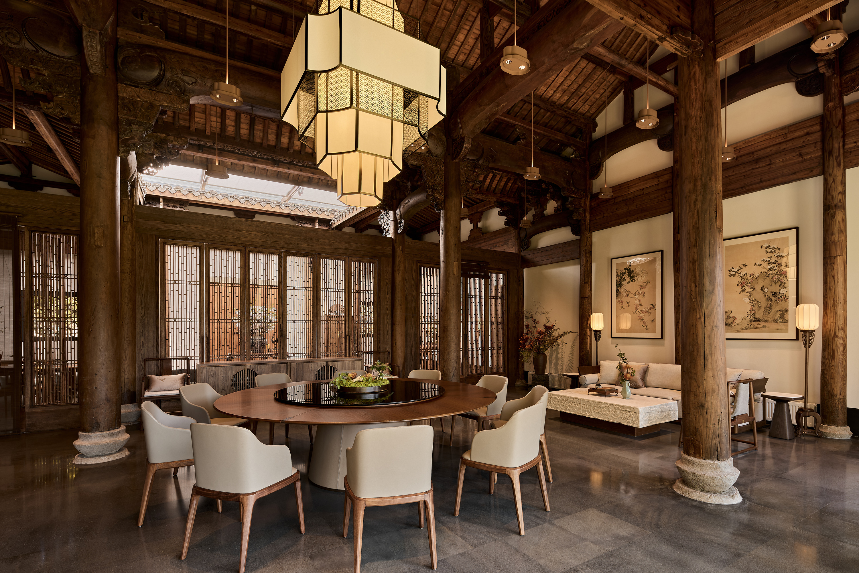 云厨餐厅,坐落于杭州西溪湿地坞家湾景区内,将古建的韵味与现代中式餐饮完美融合。其一,古建修缮是本案重要设计工作之一,通过打磨、修补、上色,使木构架恢复昔日光彩,设计团队以 “修旧如旧” 的手法,对古建筑进行精心修缮,重现其历史风貌,同时新增木隔断与原建筑和谐共存,让光影在木色间交织出诗意篇章;其二,在空间布局上引入自然,将副楼二层改造为室内空间,南北两侧新起横长窗户,将临湖美景及院内景观引入室内,另将一层主厅临湖面及前厅西侧的原墙面打开,做成大面落地玻璃窗将湖光山色引入室内,让宾客在觥筹交错间尽享美景;其三,进行古建灯光营造,为了让最美的屋顶木构架及雕梁画栋能更好的展示,也为提升整体空间的亮度并最大程度的保护古建,设计采用抱梁悬吊式上下发光的海棠造型灯均匀布置在空间中,使得空间明亮温暖又凸显了古建的精华;其四,采用现代艺术中式陈设,家具以现代与中式混搭为主,艺术陈设以传统文化新演绎的方式为空间注入了新的艺术气质,使其成为现代餐饮与传统文化交融的经典案例。
