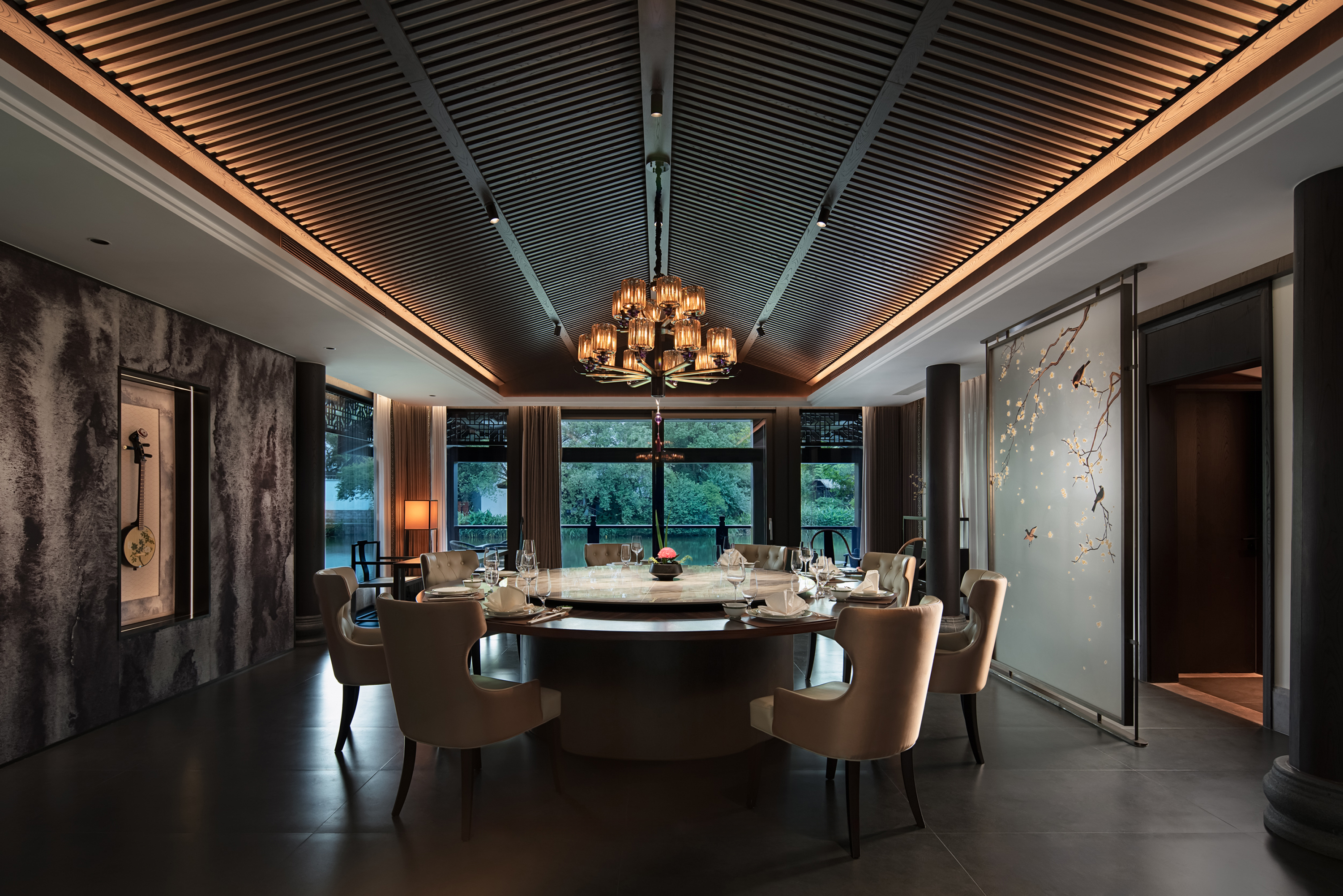 庄园坐落于杭州西溪湿地的静谧风光之中,设计上将传统与现代元素做了有序融合,亭阁廊桥掩映在绿水青山之间,给人一种与自然共生的深邃意境。庄园内部,材质表达及光线的运用均希望藏身于自然景观中,营造出静谧的氛围,器物及软装家具布置同样尊重传统与当代之间的平衡感。