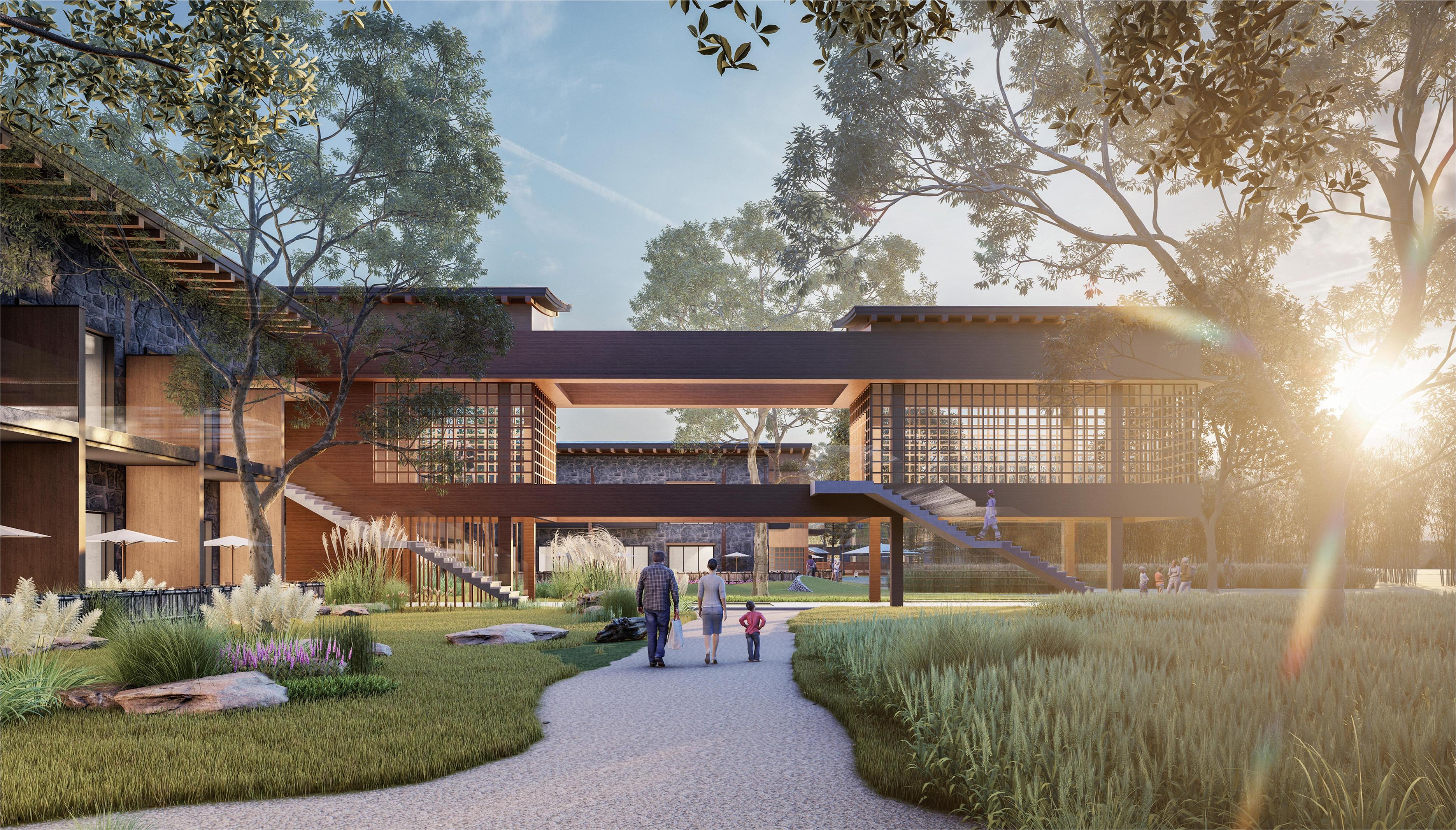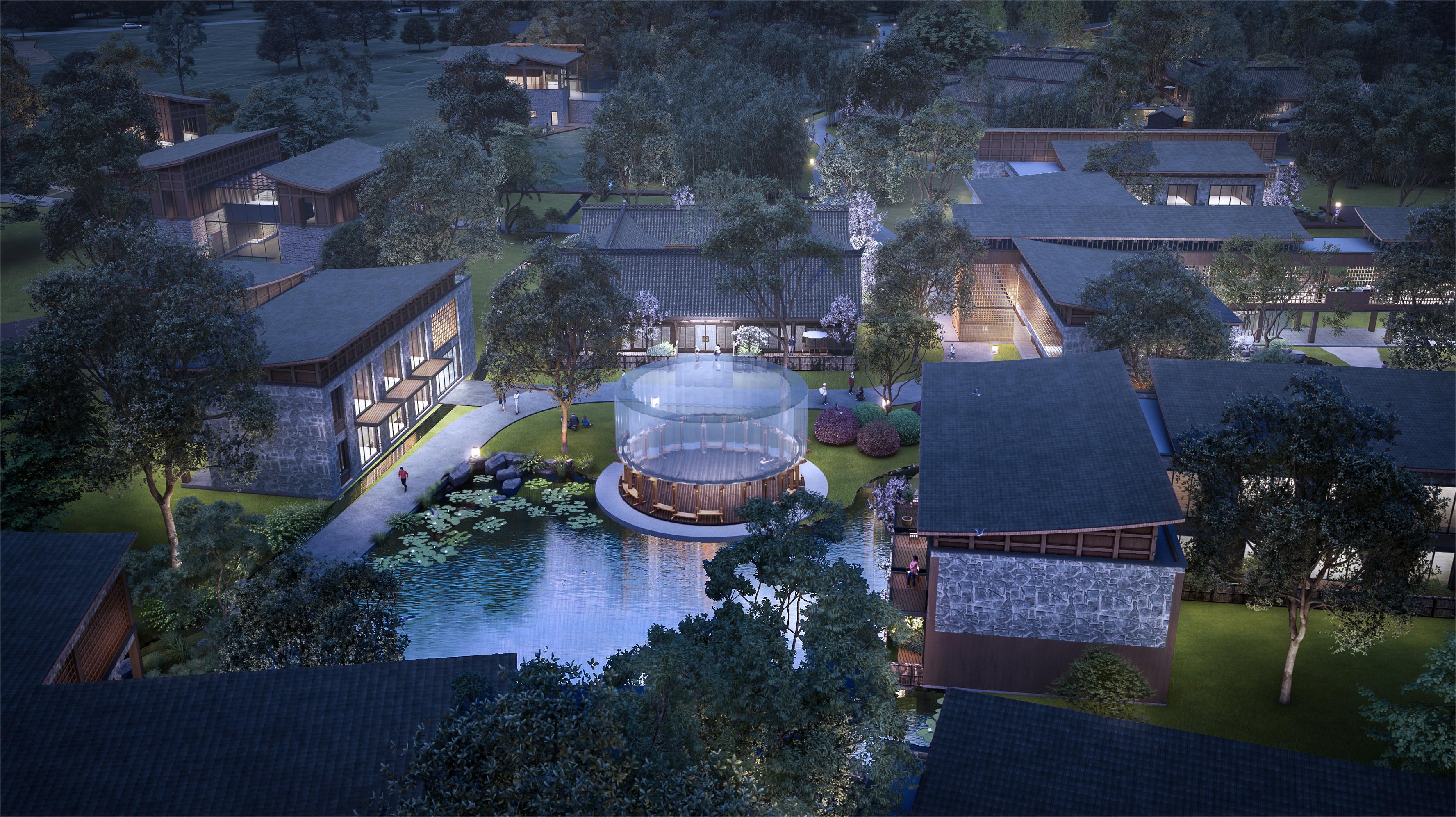 本项目是四川省首个农耕文化主题文旅度假村,位于邛崃大曾坝村,融合了中式园林山水意境与川西林盘,集民宿、艺术餐饮及儿童文创活动馆于一体,展现现代新型川西建筑文化。项目以 9 种农作物为造景主题,由“宅、林、田”组成,借鉴苏州拙政园“借景”与“对景”手法,实现自然与人文和谐。并以小青瓦悬山顶为基础,结合传统与现代建筑元素,展现川西建筑魅力。室内设计则联结传统地域文化与文旅功能,使传统川西文化焕发现代生机。