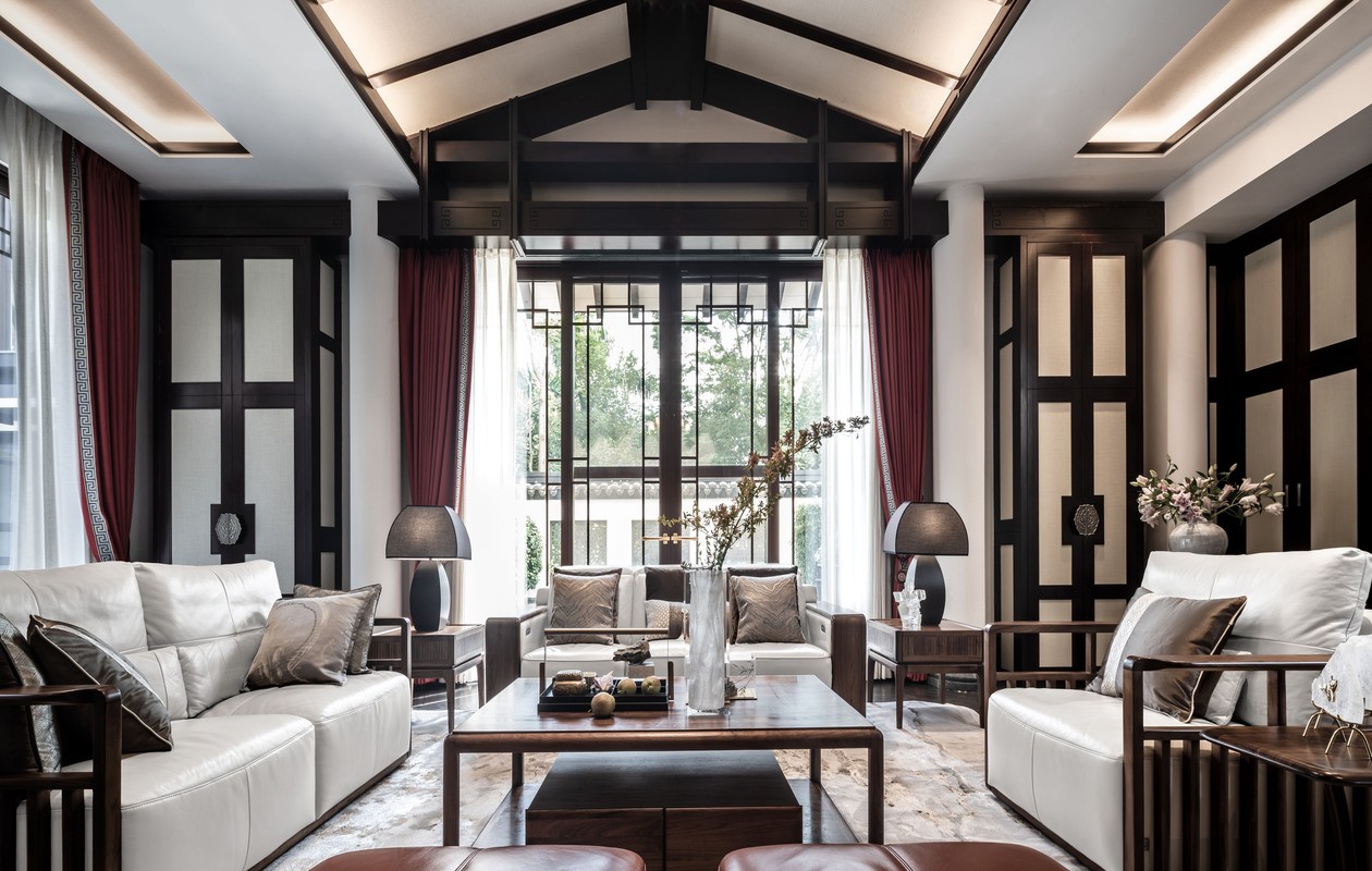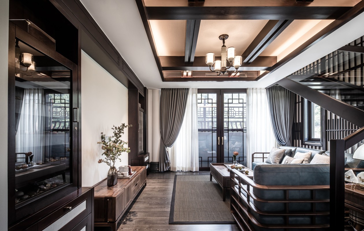 承于徽派风格,而又推陈出新的新中式风格,更侧重人与自然的和谐相处。在窗棂造型、在窗帘配饰、在屏风隔断等随处可见的回字纹,与雕花悬梁隔空对话,再辅以木质家具、大理石台阶、墨色地砖的点缀,氤氲出静谧雅致的东方意境。并大胆开设落地窗、格窗、小轩窗等,与室内天井相互配合,不仅将自然之光引入室内,更将自然之景延伸屋中,缩天地美境于方寸,纳春秋四季于一室,使得景在室内,人在景中,自然彰显出“坐看云卷云舒,静听花开花落”的怡然自得。