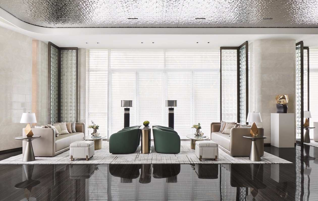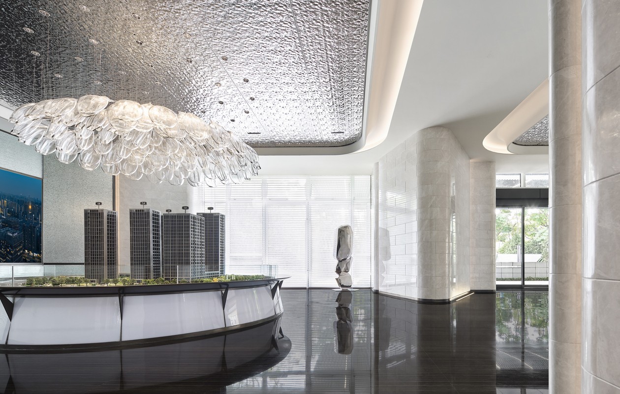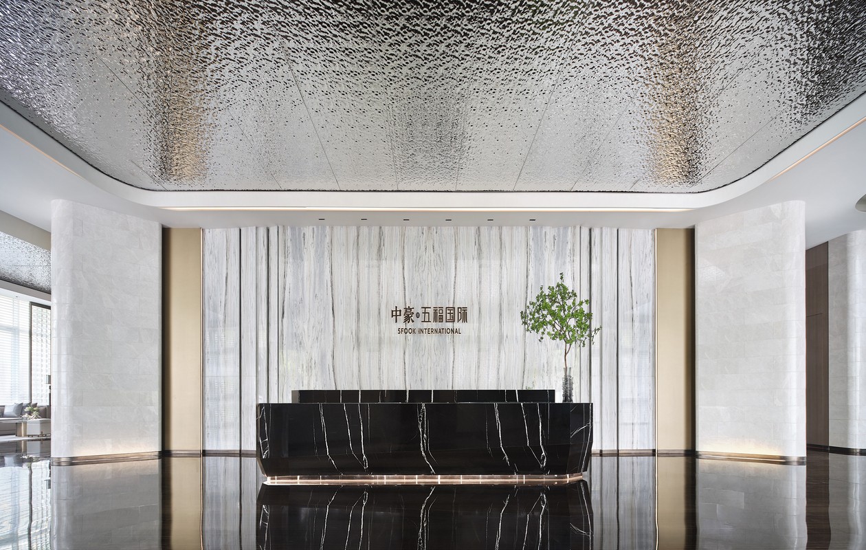 斜面、曲面被创造性地替代墙体分割,开放式布局消解了建筑的局限性。天花覆上了水波纹的金属板,宛如湖面倒映的粼粼波光,随同曲线处理的界面分割,将灵动的光韵包裹住。再对比地面深色的奥巴马木纹石材,实现轻盈与厚重之间的平衡拿捏。