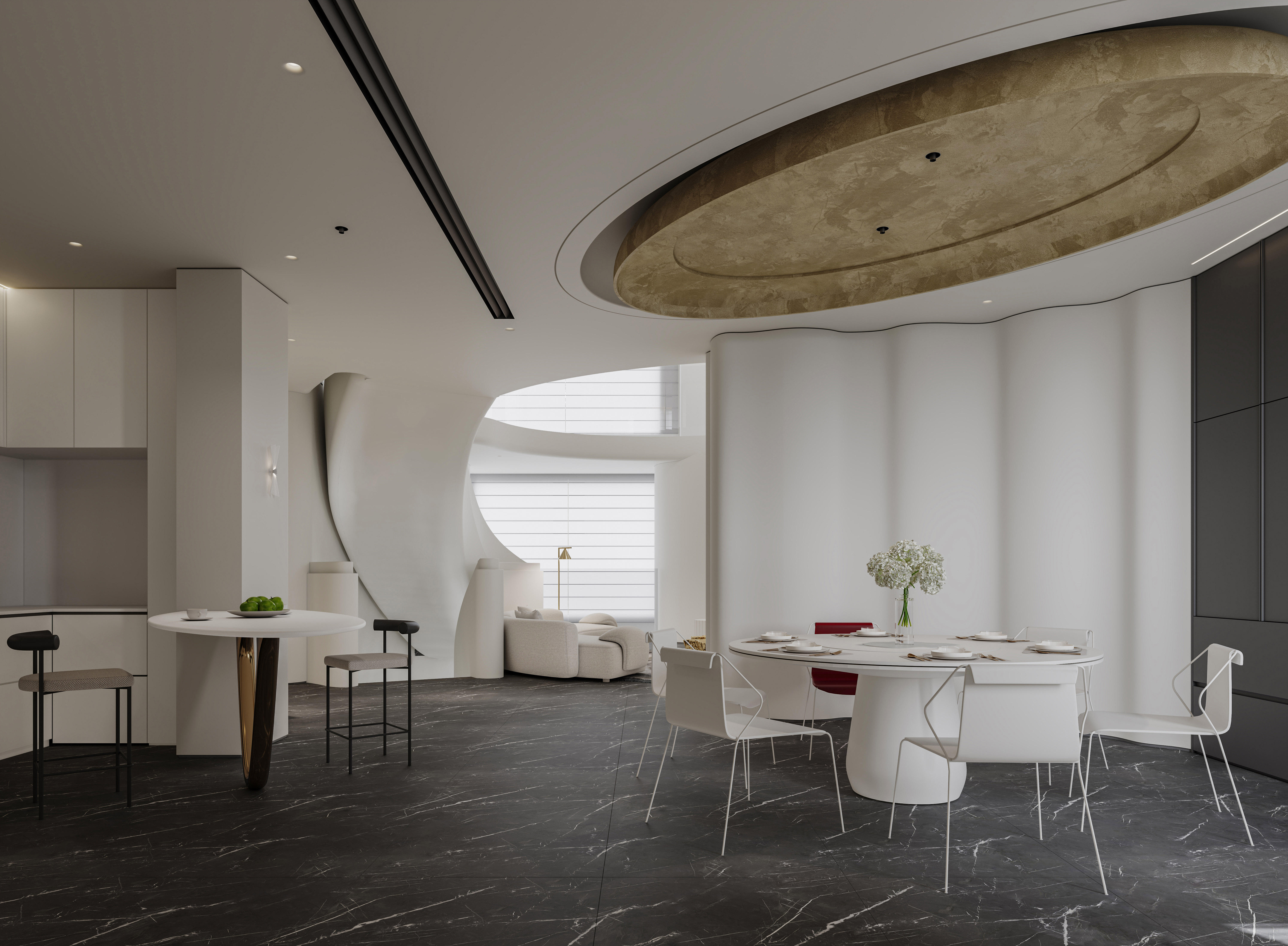 本案设计师以圆形宇宙作为顶部,将整个空间用叠型环绕,从顶部到地面都呈格局之状展开,使得空间更深远更简单更纯粹。人们用克拉来计算钻石,是因为她的珍贵和稀罕。而来自外太空经历大气层摩擦的石,才是有远见有格局的宝贵之缘,而这份缘分就如设计师遇见业主,兴趣审美一致才有这种碰撞,希望本设计就如陨石,带给这个家,陨石一样的稳与重!