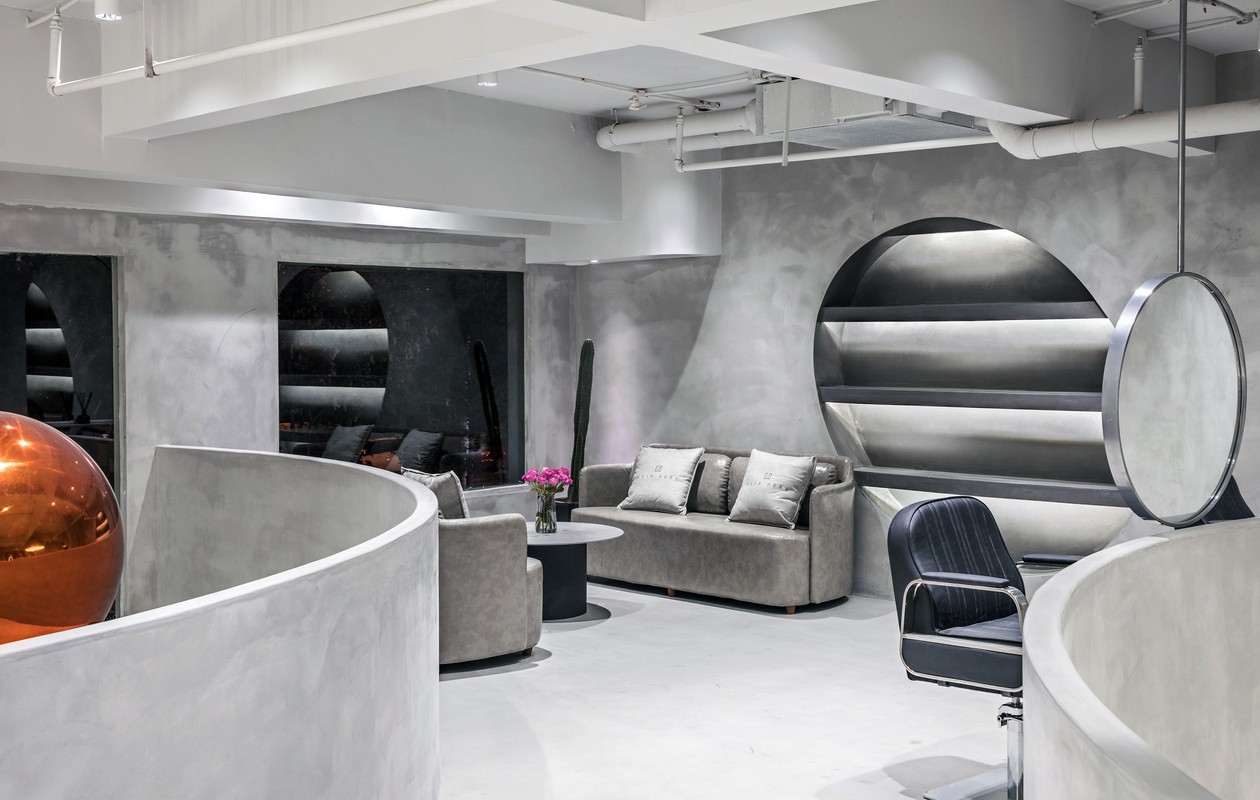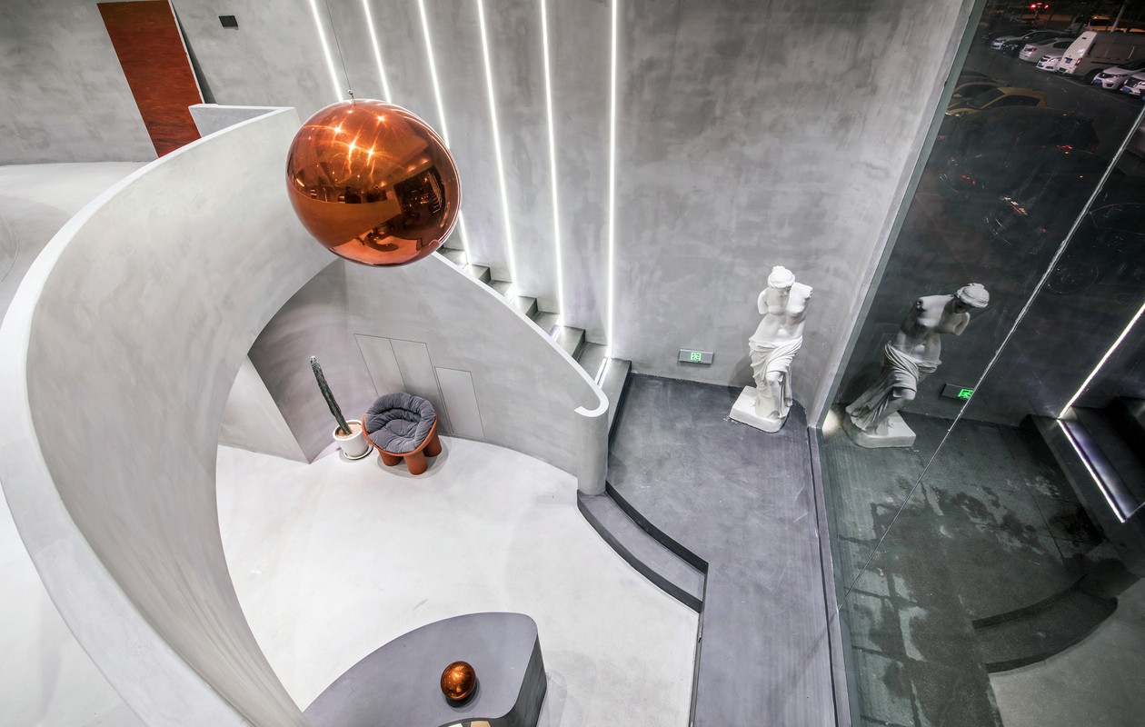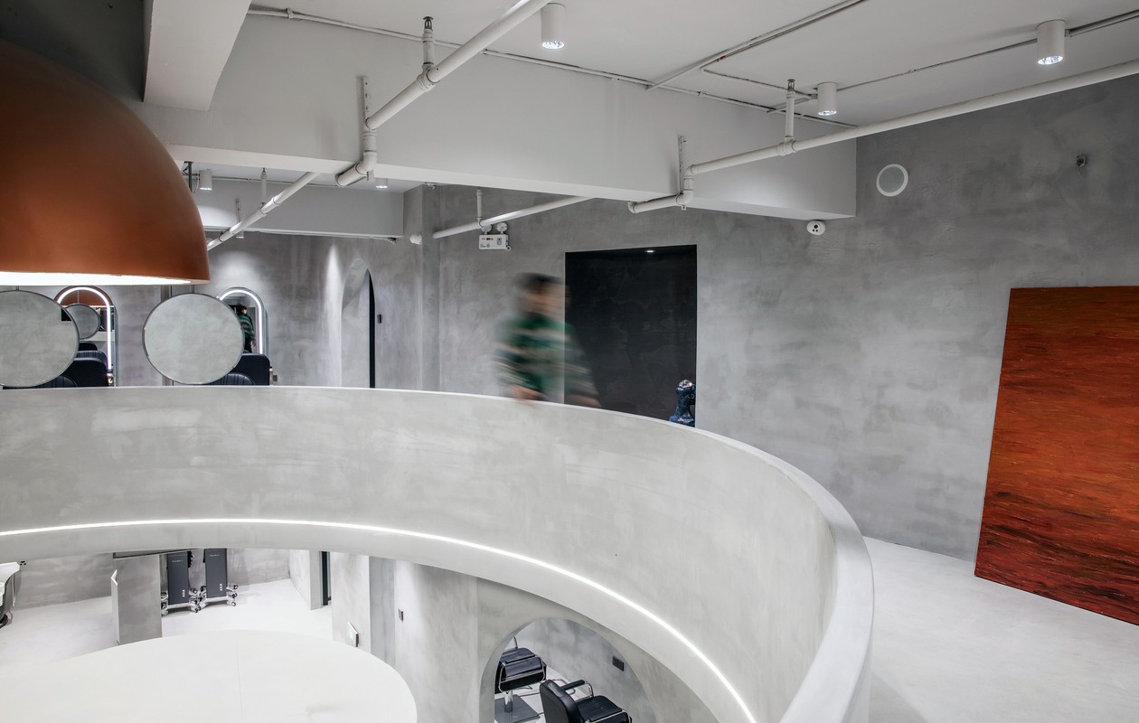 我们并没有把她当做一个传统品类的商业空间来设计。在满足了基本功能之后,我们更注重于她的艺术表达和情感交互,希望所有的人在这个空间内能得到心灵归属和慰藉。外立面设计运用了解构主义等微建筑手法,材质和结构从室外向室内做延续和拉伸,同时对空间起了一定的引导作用。空间内充分利用柔和的线条,希望可以给到最放松、最舒适的感受,不迎合却有温度。主入口门头以极致的圆弧曲面去呈现,希望成为视觉的聚焦点。隔层用圆形和曲面挑空让上下空间互相联动和对话,更加活泼生动。保证空间的结构美感及完整性,在材质选择和色彩运用上保持了一定的克制,墙面地面统一使用微水泥,保证空间的结构美感及完整性。