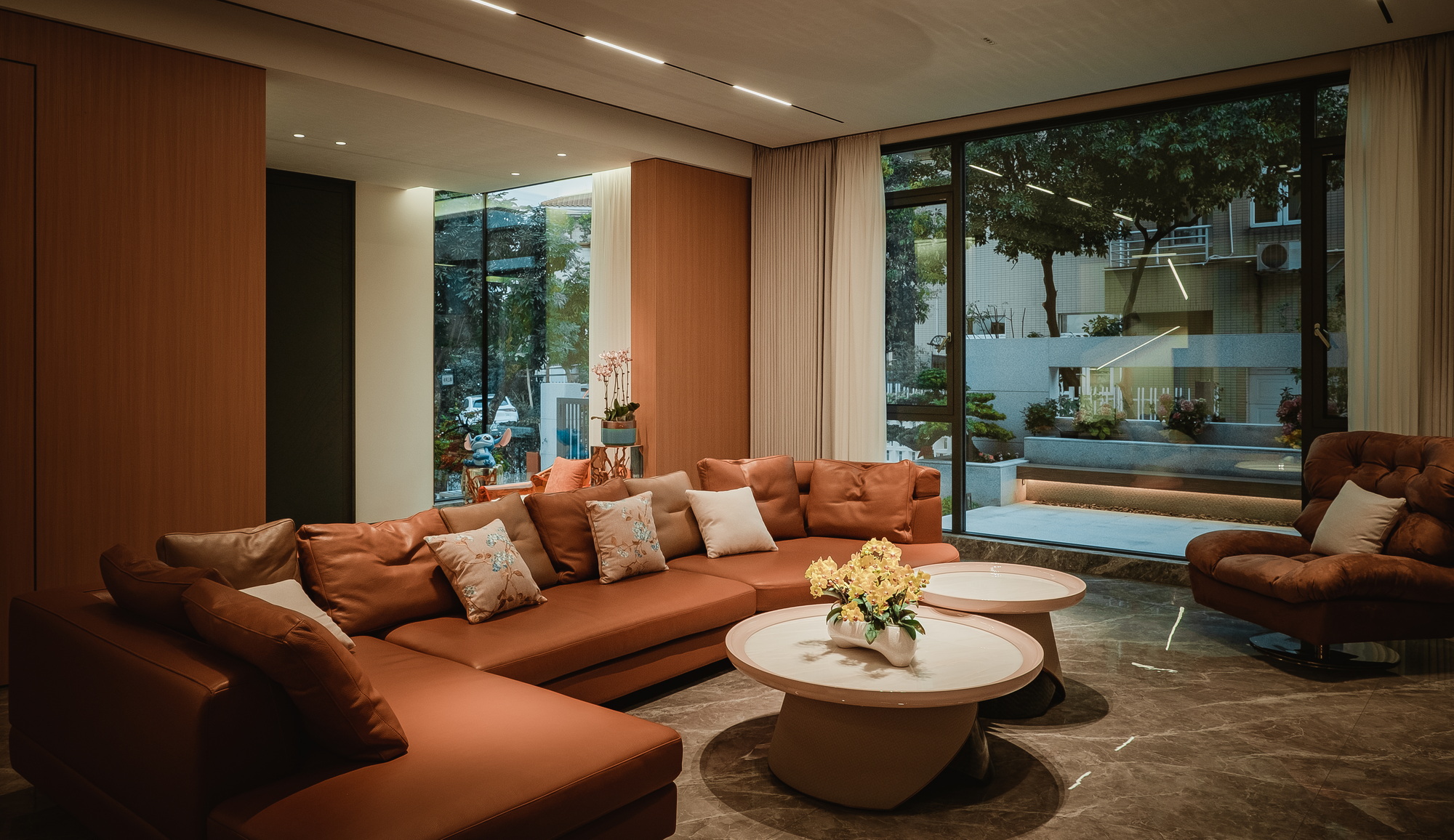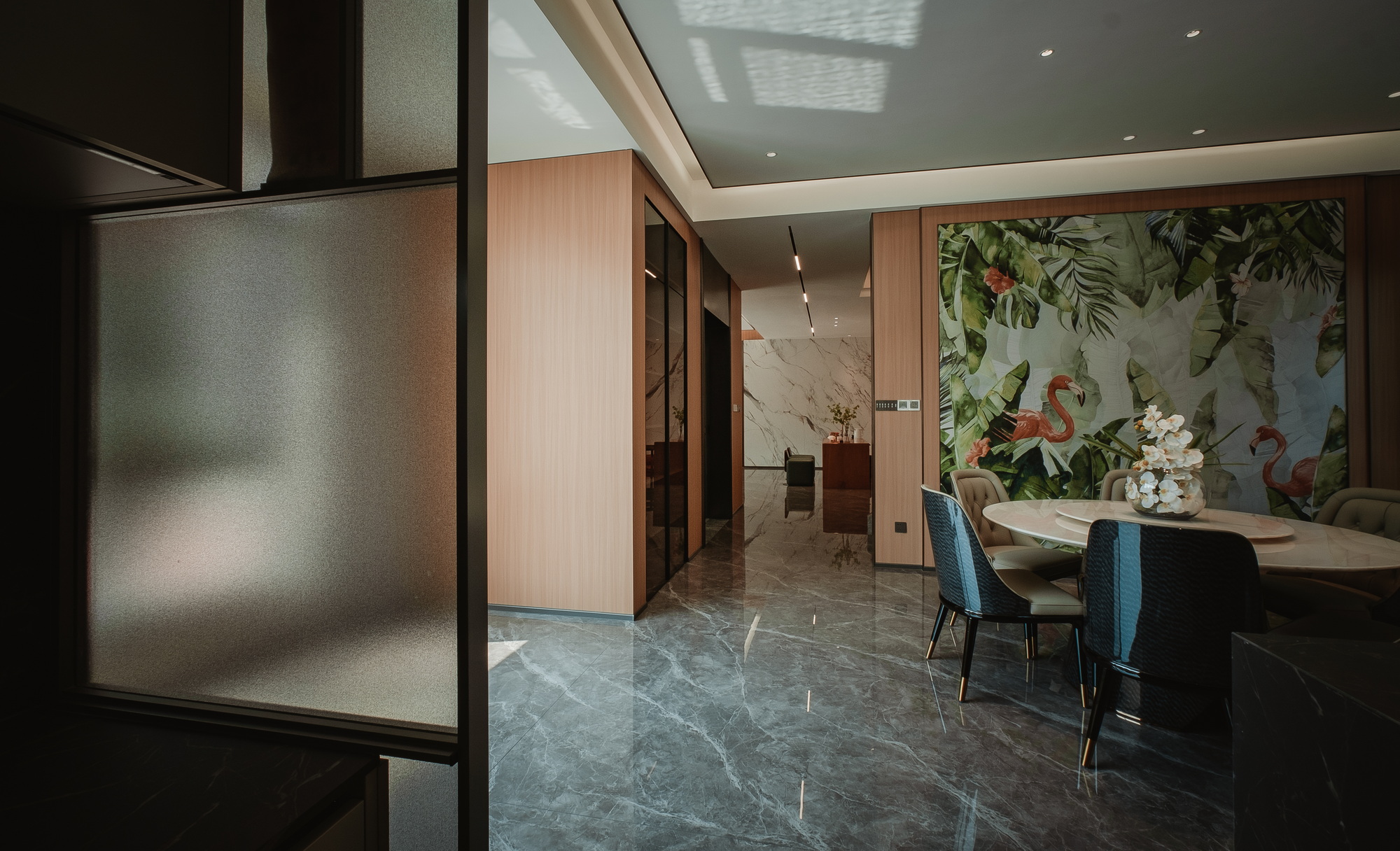原建筑是一栋20年普通欧式民宅,设计师为房子重新规划了居住的方式与空间的秩序,将当代诗意的生活方式注入空间。当房子重新以一种现代简约的风格呈现出来时,业主非常惊讶与喜欢。整个房子的布局呈内向L形平面规划,环抱着东南向的花园空间,室内空间也是面向东南面的花园一一打开,L形的两端是客厅公区与开放式的餐厨空间,L形的动线交接处是一个多功能的现代茶区。形体.光线.景观与内部空间相互咬合,充分地反映了设计师追求人与空间.自然和谐对话共生的诗意居住理念。设计师为业主构筑了一种全新的生活模式与现代居住空间 ,自由.当代.灵动,自然光影与诗意,空间与生活在此互相辉映,和谐共存。