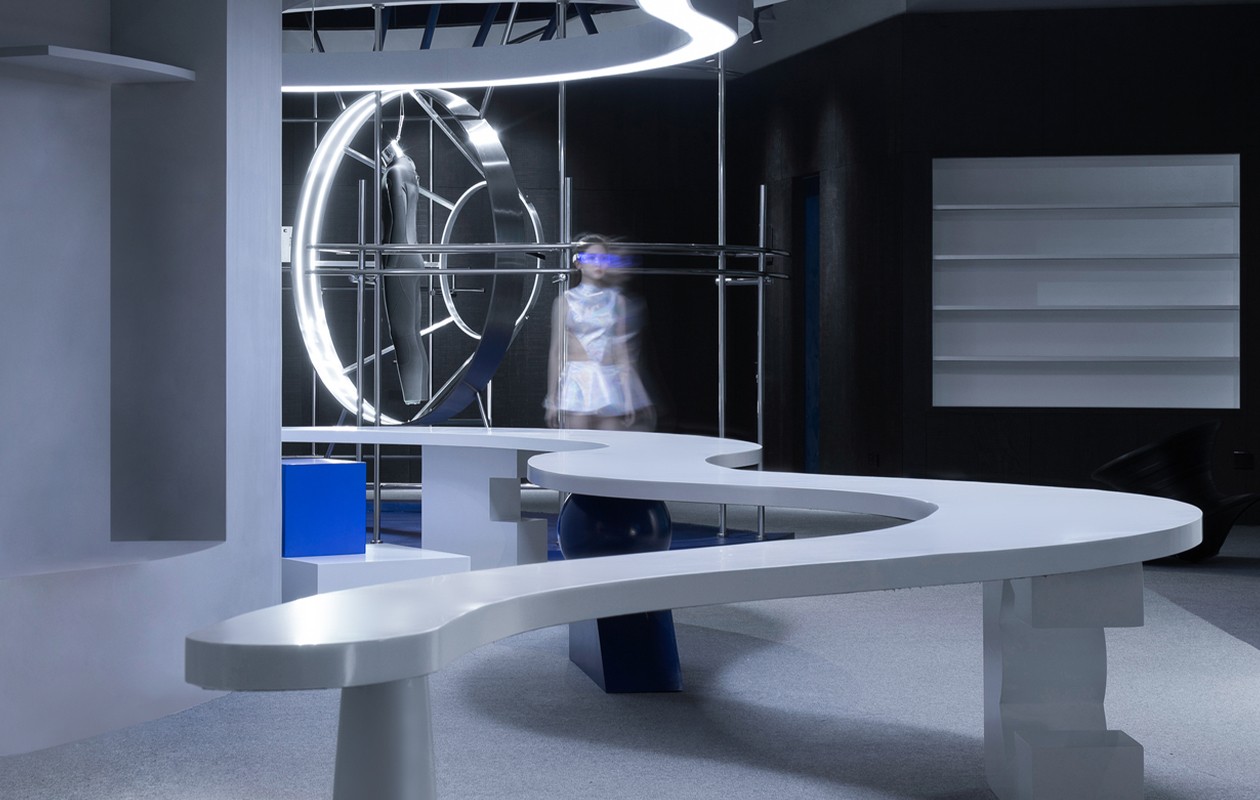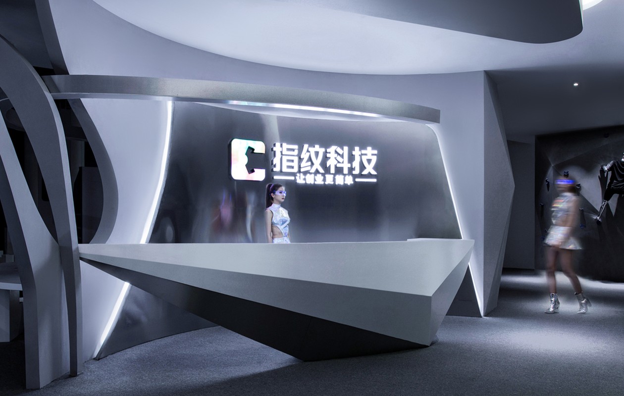 该作品是一款科幻主义风格的展厅。设计师将“极光”这一自然界中最美、最多变的天文奇观同“指纹科技”的品牌理念相融合,以大面积的极光白为底色,穿插冰川蓝,蓝与白的交织如同海洋与冰川的碰撞,搭配灯光和投影的装点,模拟宇宙间北极光的幻化璀璨。展厅中采用大面积的曲面造型和立体解构设计丰富了空间的层次,仿佛北极光里蕴藏维度曲线的秩序延展,立体解构里时现科技与幻想的棱角。延展的大面积白色色块在这个作品中不但奠定了整个空间的基底色调,还起到了动线引导的作用。前台的logo作为整个展厅的视觉支点,将蓝色的海洋和白色的冰川交汇于此。通过多功能、多细节与来客互动,打造一个兼具艺术性和功能性的交互式空间。