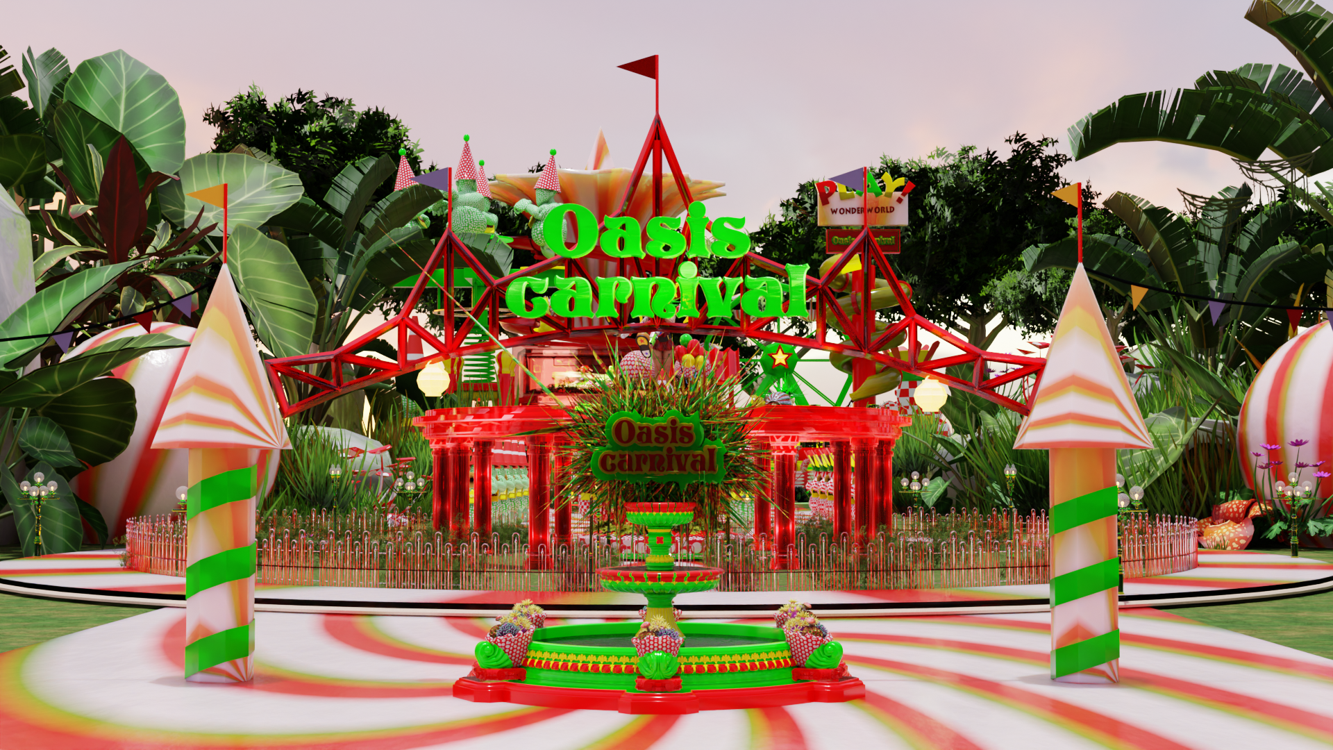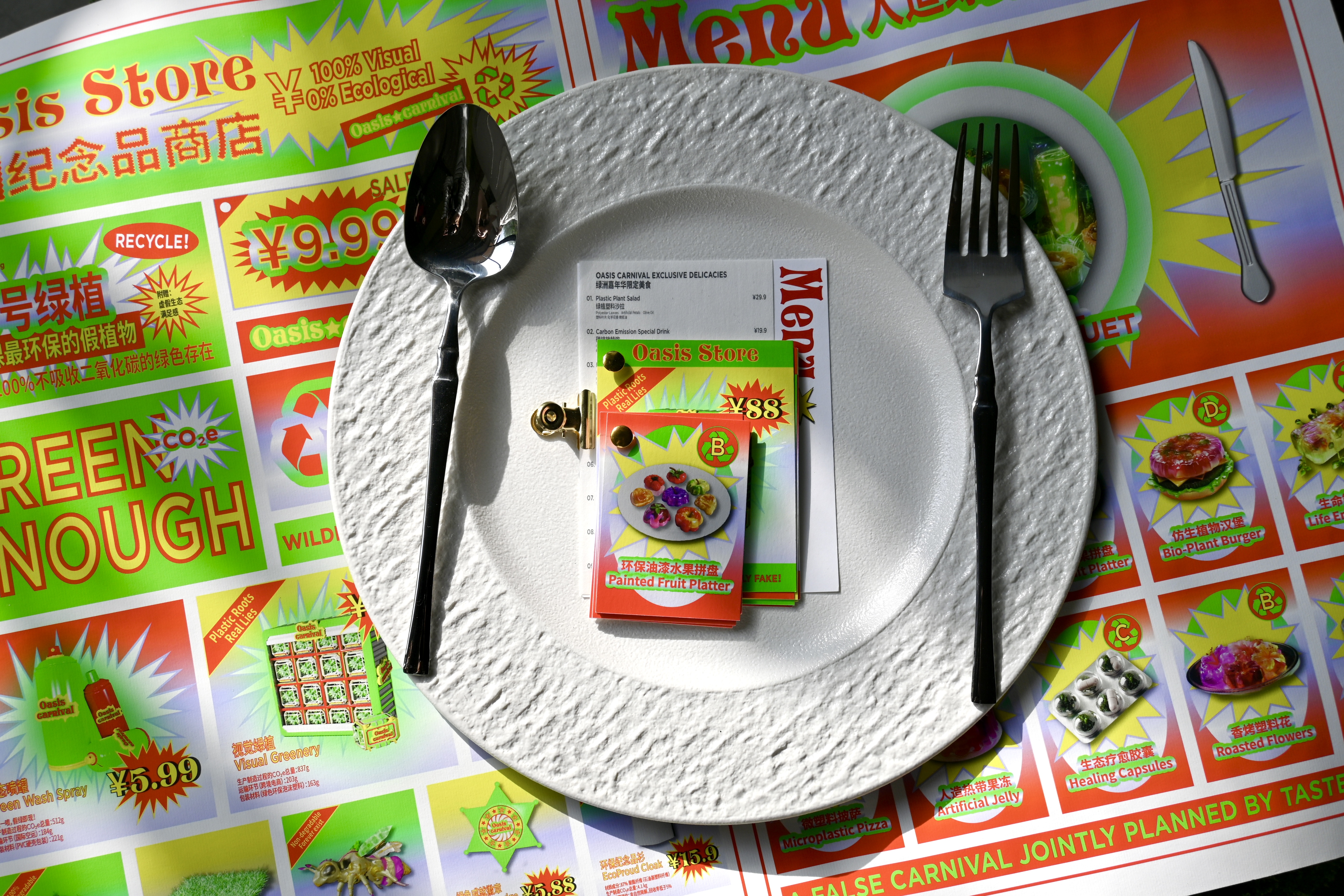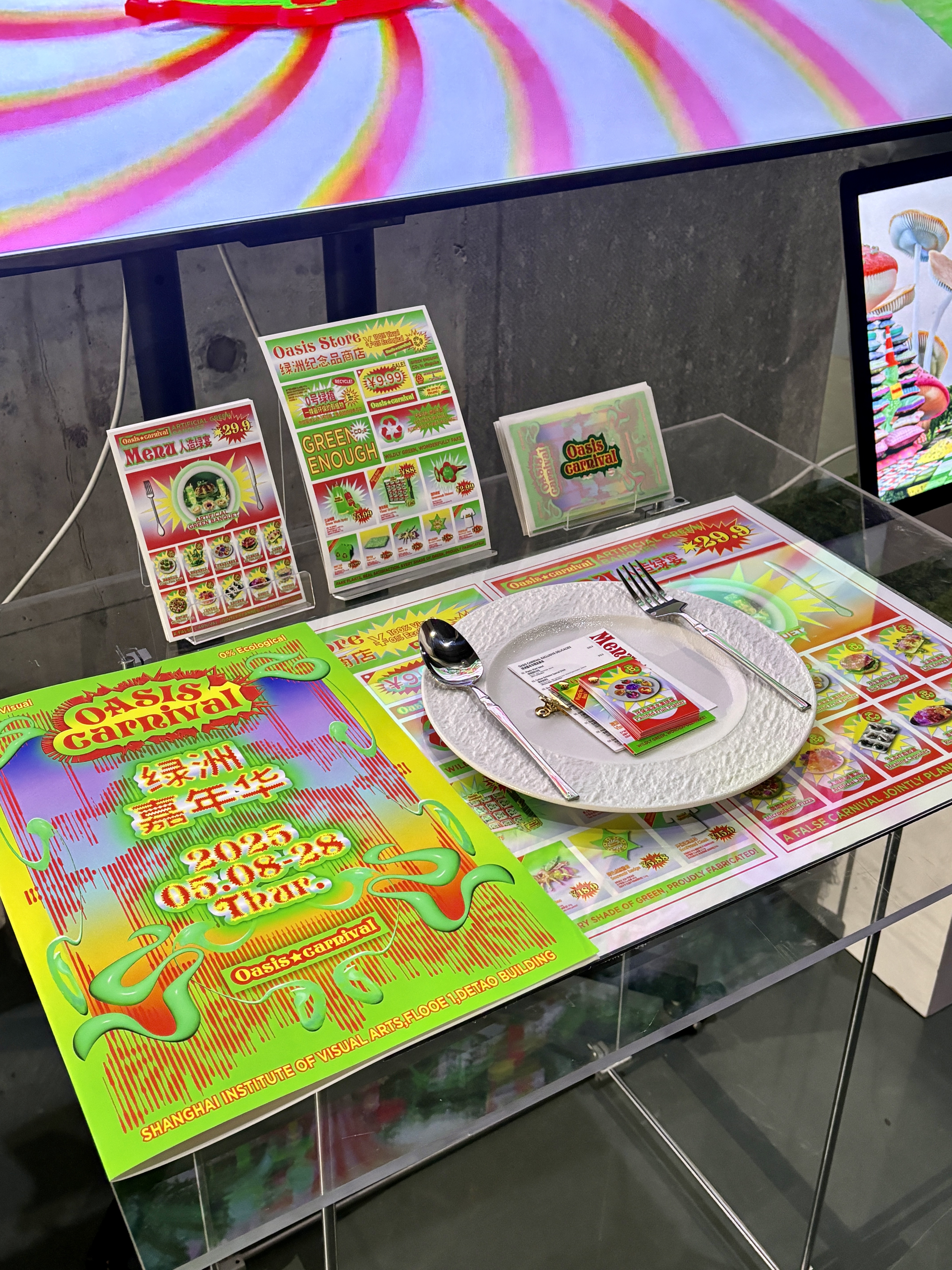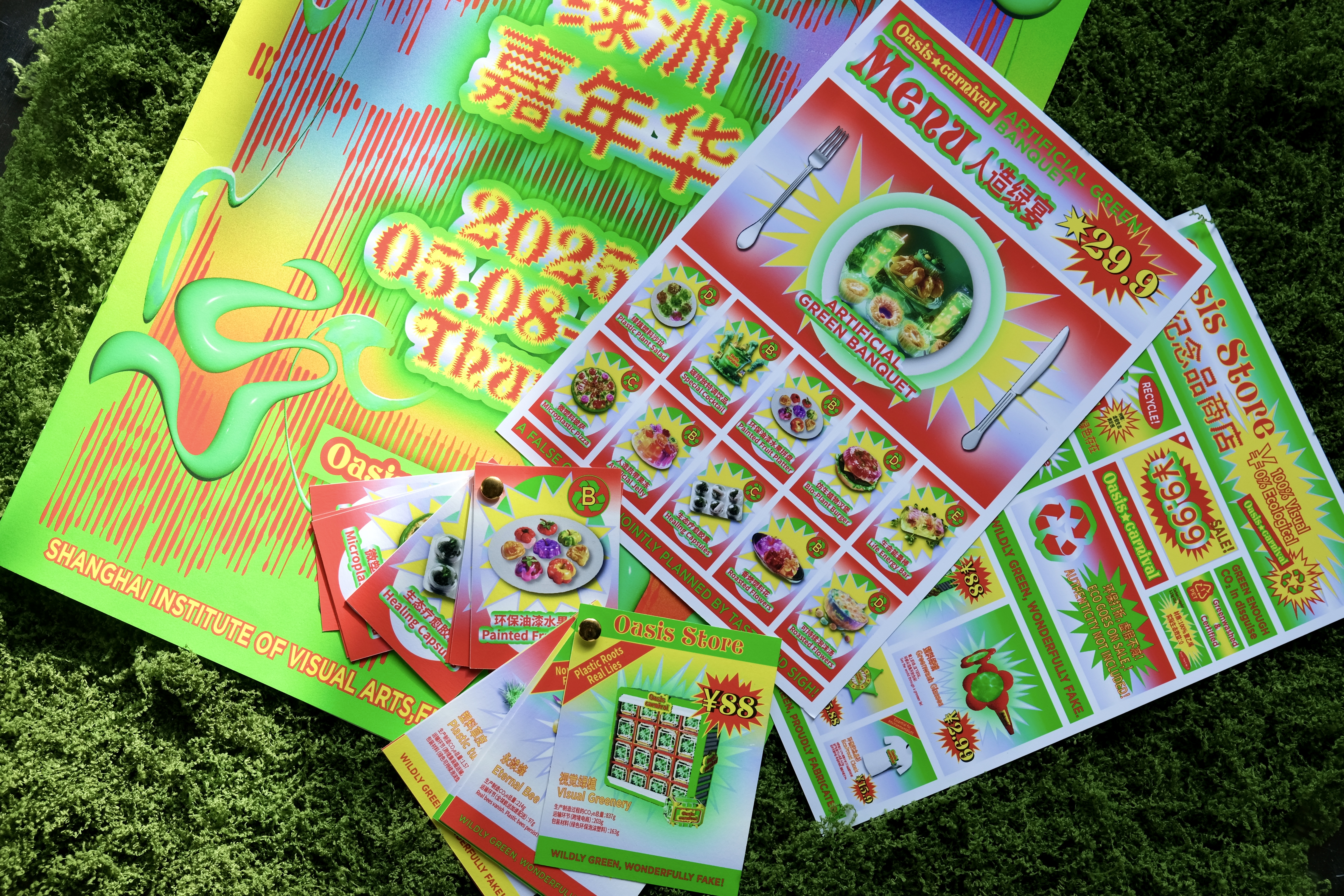 《绿洲嘉年华》是一场反讽式的生态乌托邦节日庆典,通过构建一场充满人为“绿色”的城市狂欢,营造一个被景观化与拟生 态包装的虚假节日场域。作品以娱乐化视觉、消费机制与拟生态物品的集体狂欢为手段,揭示当代城市中“绿色幻觉”的生成 机制,以及生态话语如何在美化和符号化过程中逐渐脱离真实。作品聚焦当下景观社会语境下,城市绿色空间日益趋于“视 觉化”⸺诸如通过屋顶或地表覆盖绿色织物与涂料,试图在卫星图像中制造“绿化”假象,从而掩盖生态缺失与环境危机。 这类对生态的符号性粉饰,正是本项目试图揭示与批判的核心。通过戏谑与夸张的视觉语言构建感官错觉,引导观众在虚构 节庆中体验一种被包装的“生态满足”,从而激发对现代城市中生态虚伪性、心理补偿机制与消费文化之间关系的深层思考。