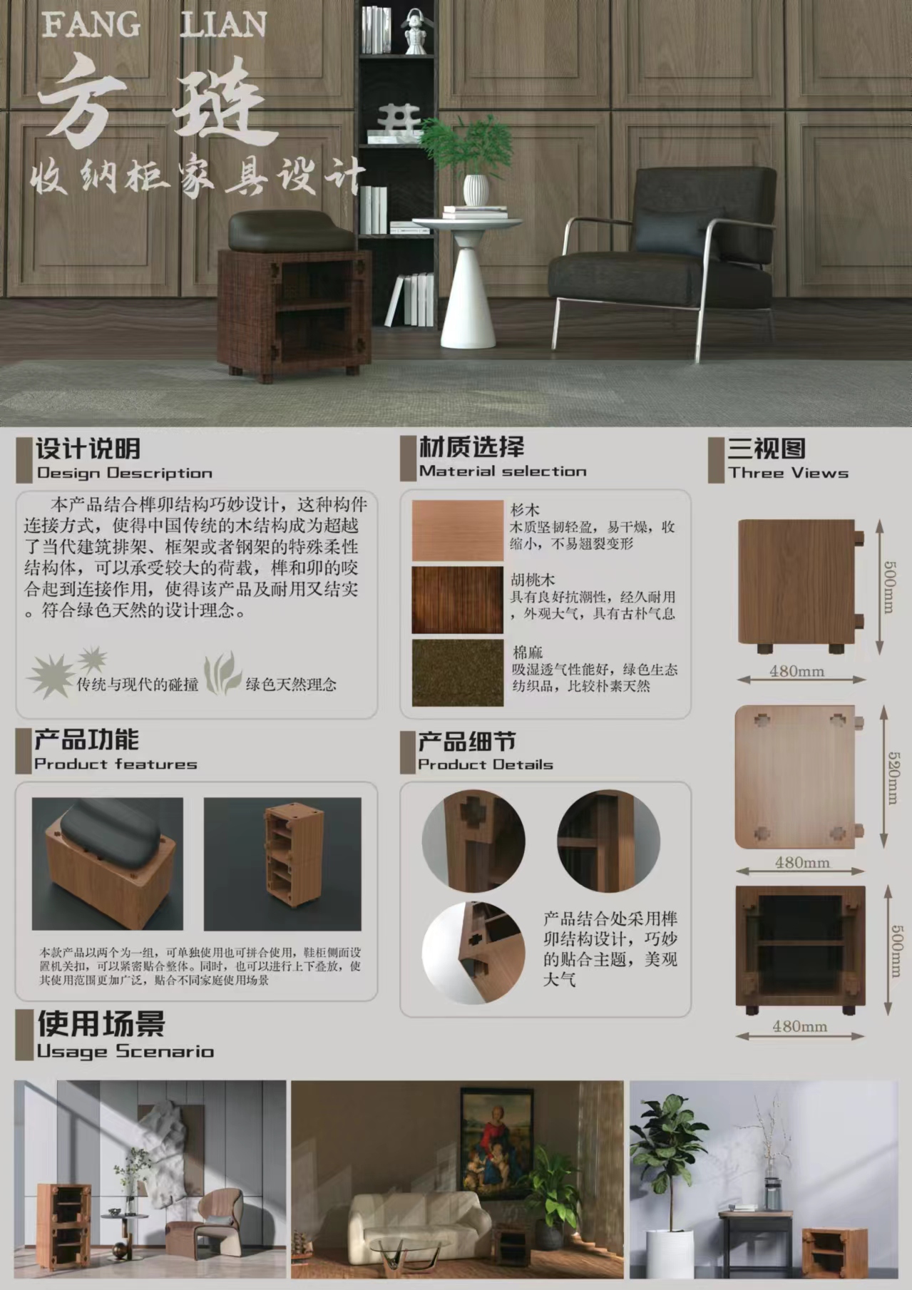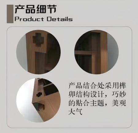 材质选用上,杉木质轻干燥,胡桃木耐用大气,棉麻织物吸湿透气。产品功能灵活,可单个或组合使用,上下叠放拓展使用范围。结构处的榫卯细节,美观且紧扣主题。适用于客厅、书房等多种场景,在传承传统工艺的同时,满足现代家居收纳需求。