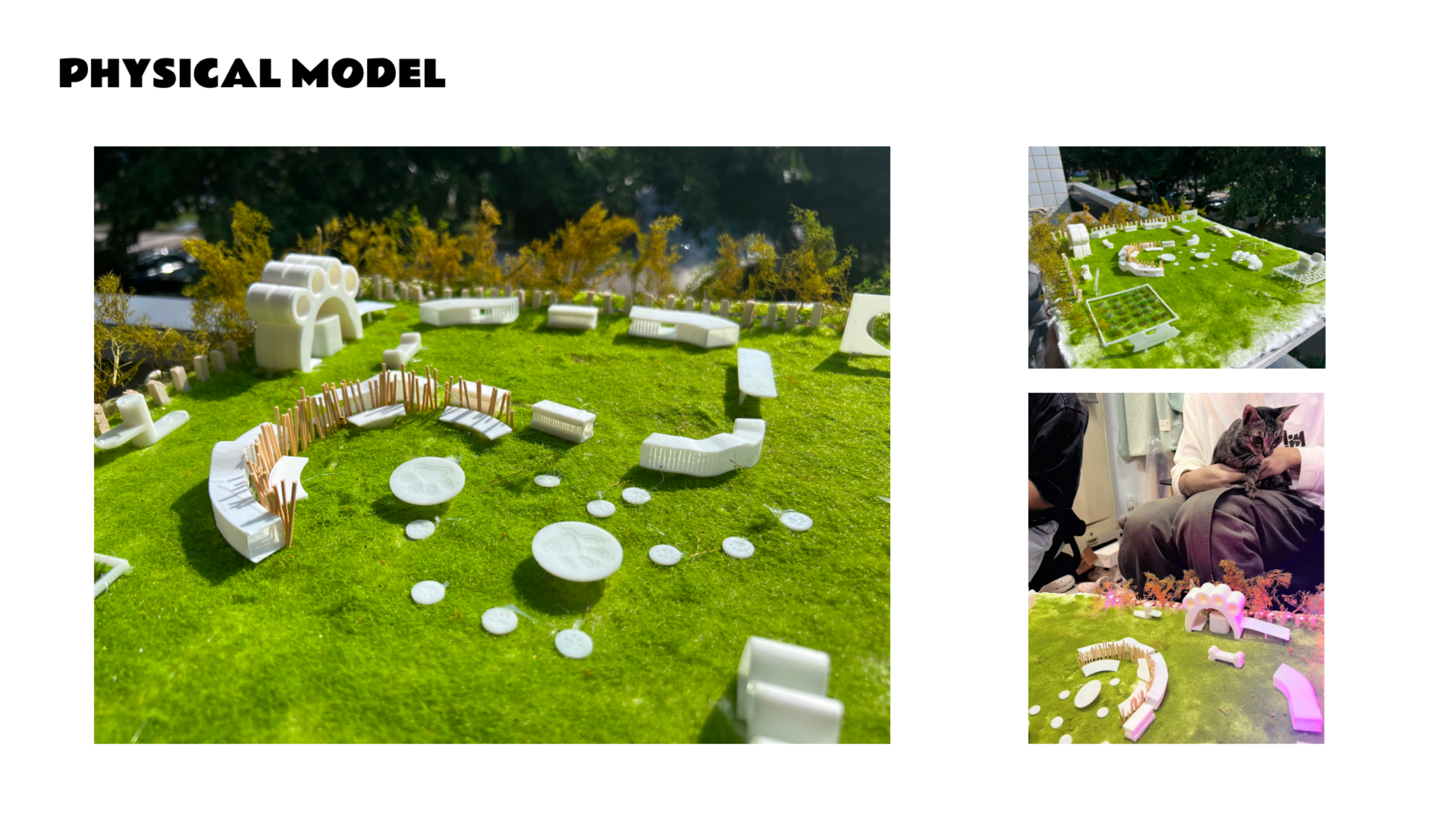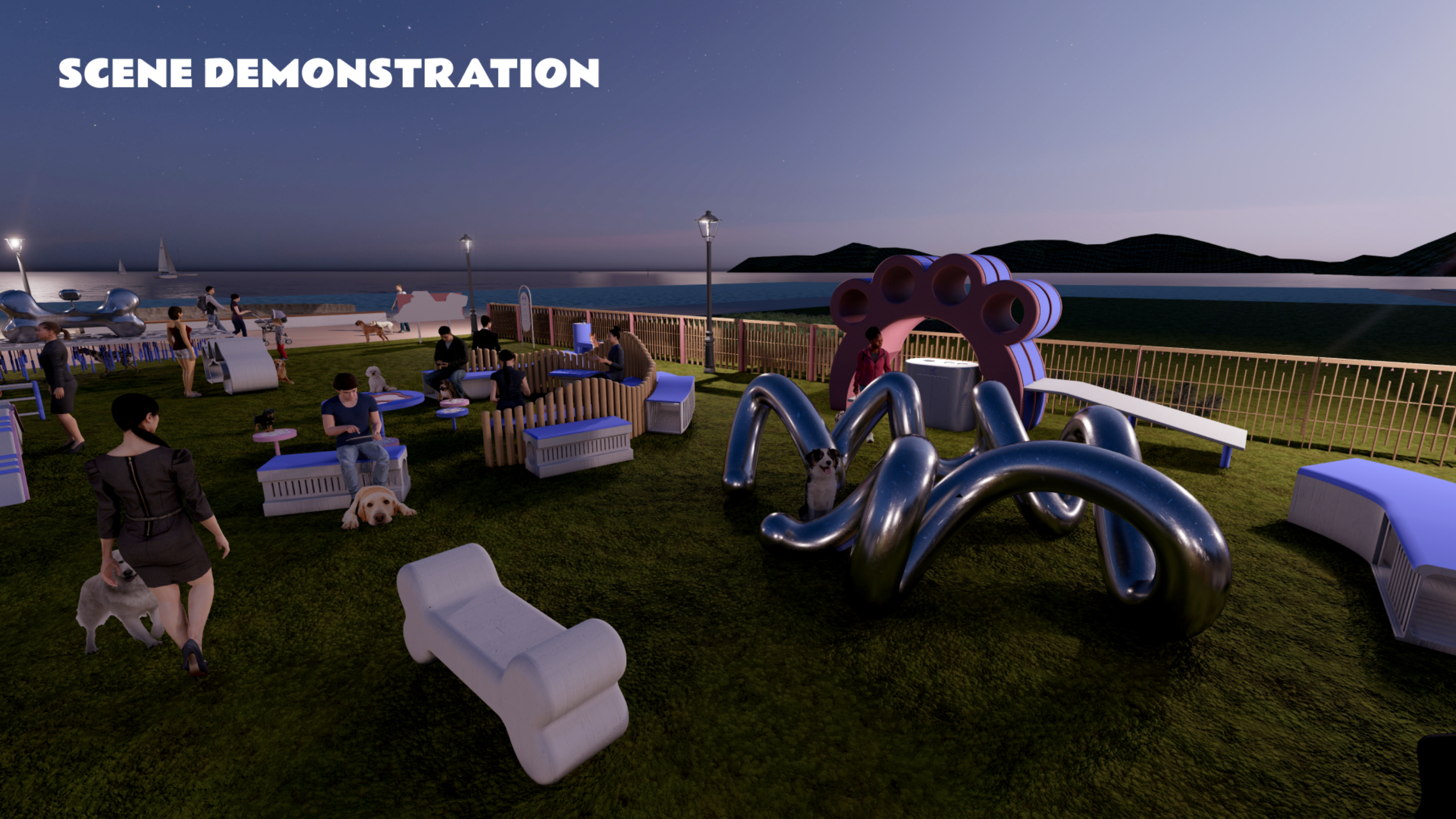 以“人宠共融”为核心理念,我们打造了一座突破传统的城市宠物友好空间。设计聚焦“模块化社交场景”,通过可移动的环形草坪、可变形攀爬装置与智能互动水景,为狗狗创造动态探索体验,同时融入主人休憩、社交、宠物培训的复合功能。