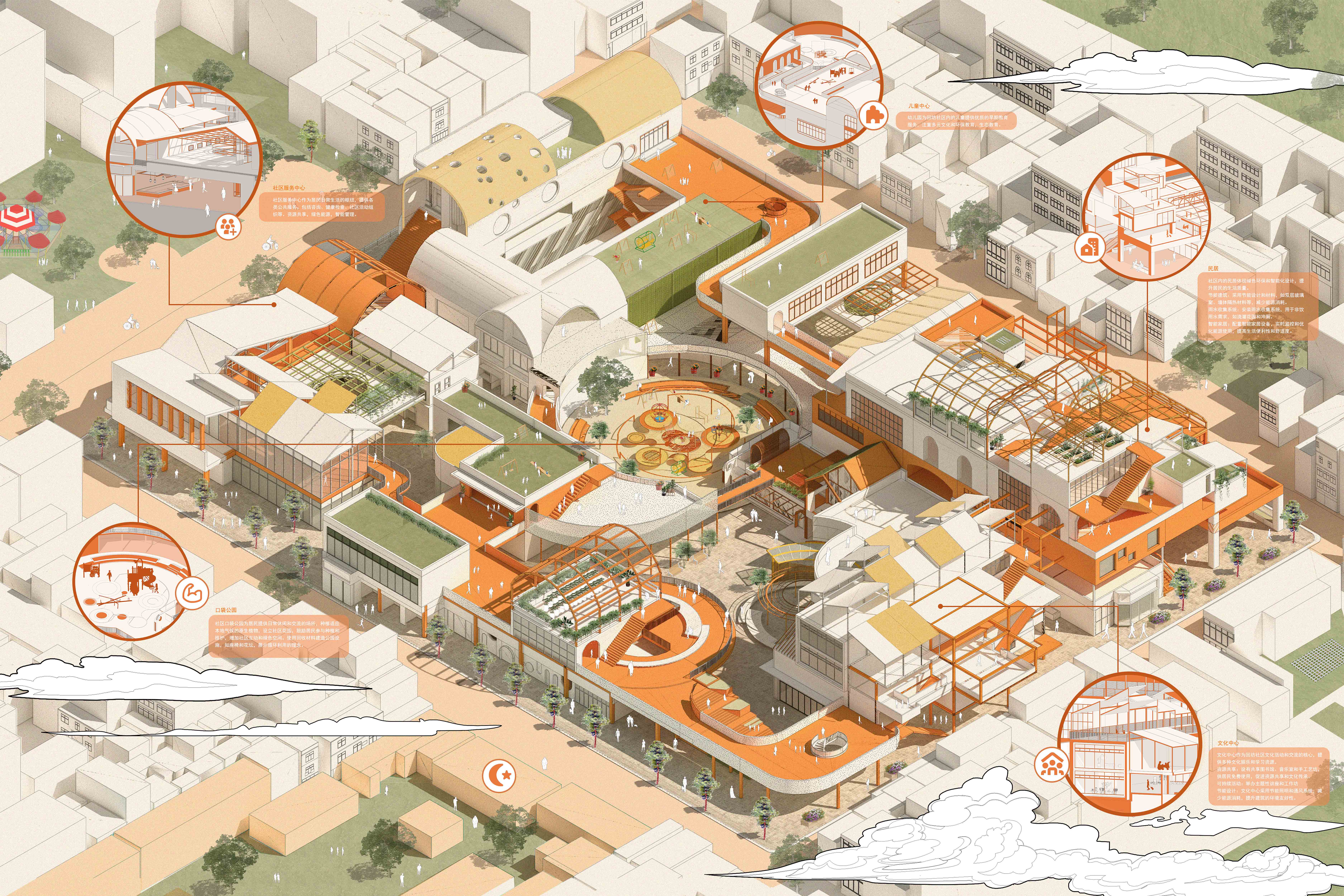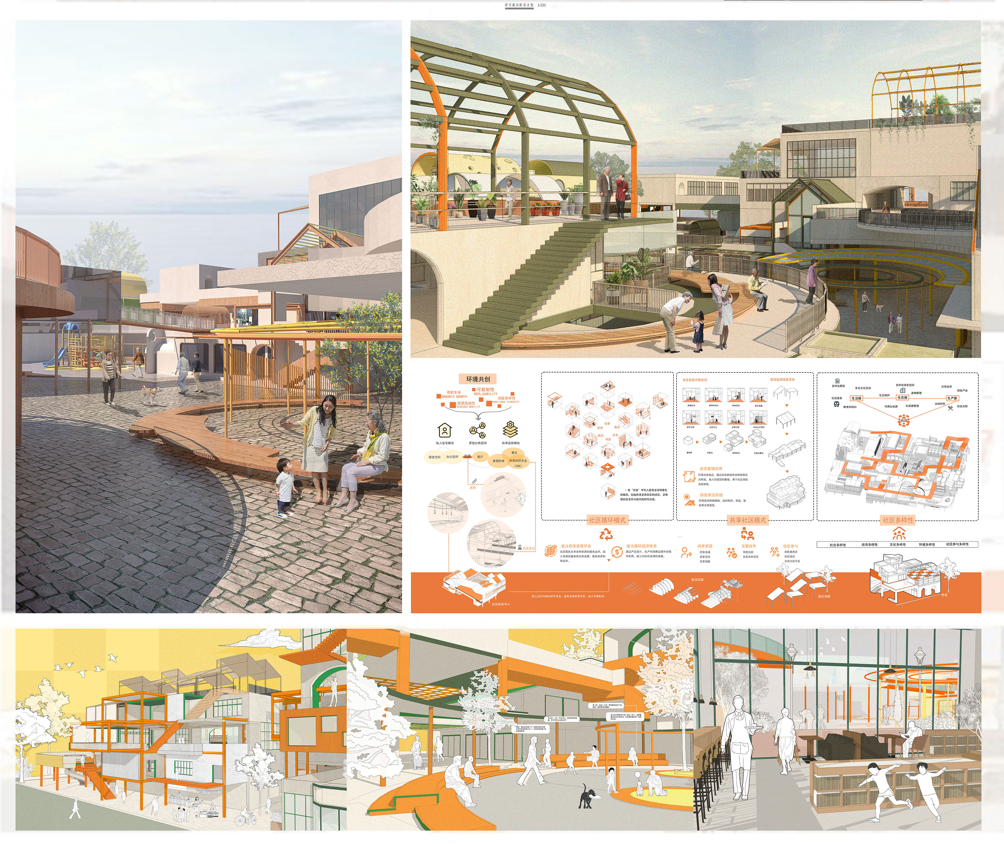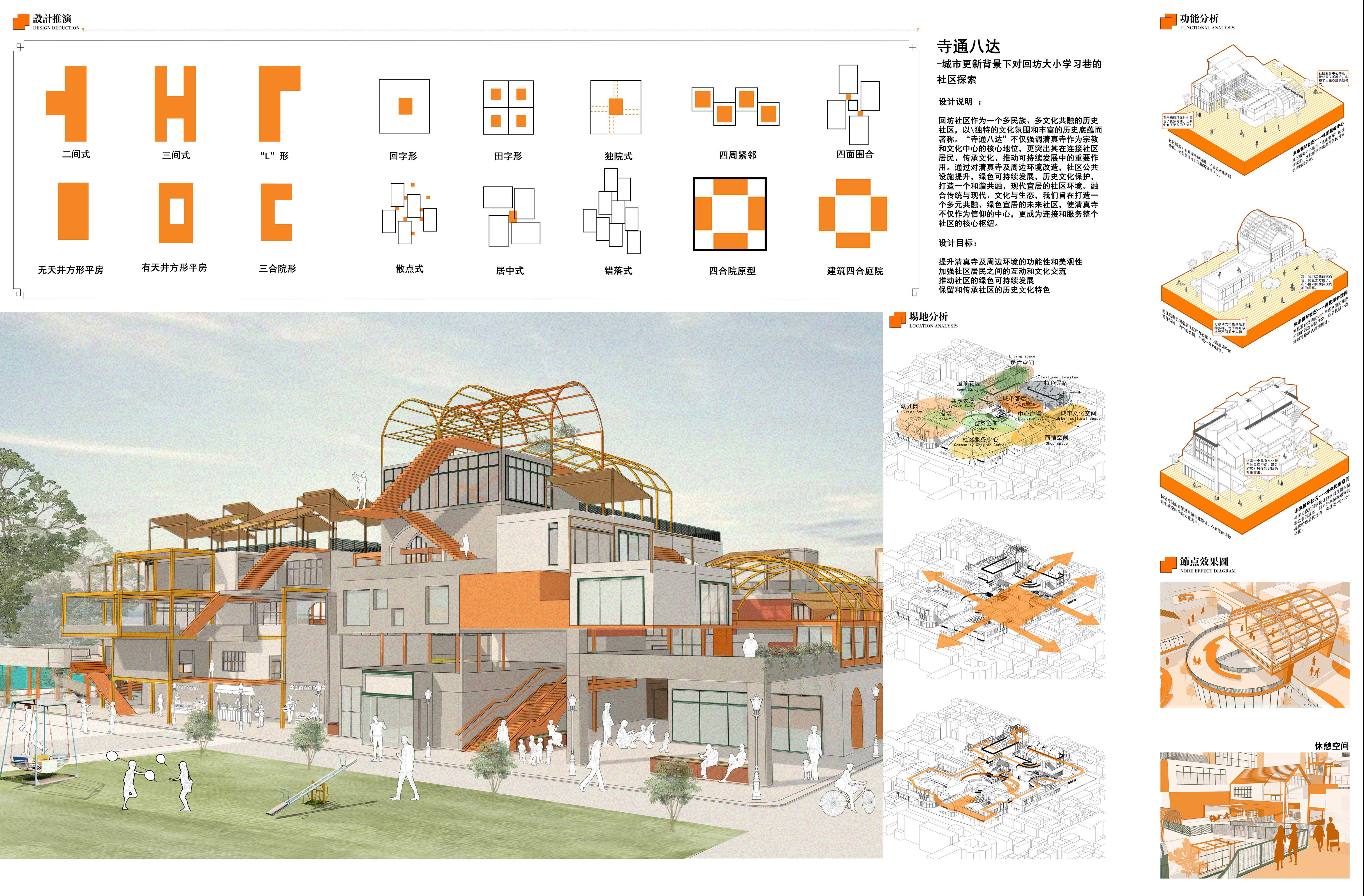 设计思路源自于城市永不停歇的更新,是城市更新背景下对近未来循环社区新形态的设计与研究。本案选址于陕西省西安市莲湖区回坊大小学习巷居民区,旨在重新定义西安市回坊区大小学习巷的社区空间,通过未来循环、绿色循环、共享与可持续发展的理念,提升社区居民的生活质量。其位于历史文化底蕴深厚的西安市回坊区,面对现代化与传统保护的挑战,我们结合现代智慧与本土文化,打造一个融合科技与文化的新型社区。