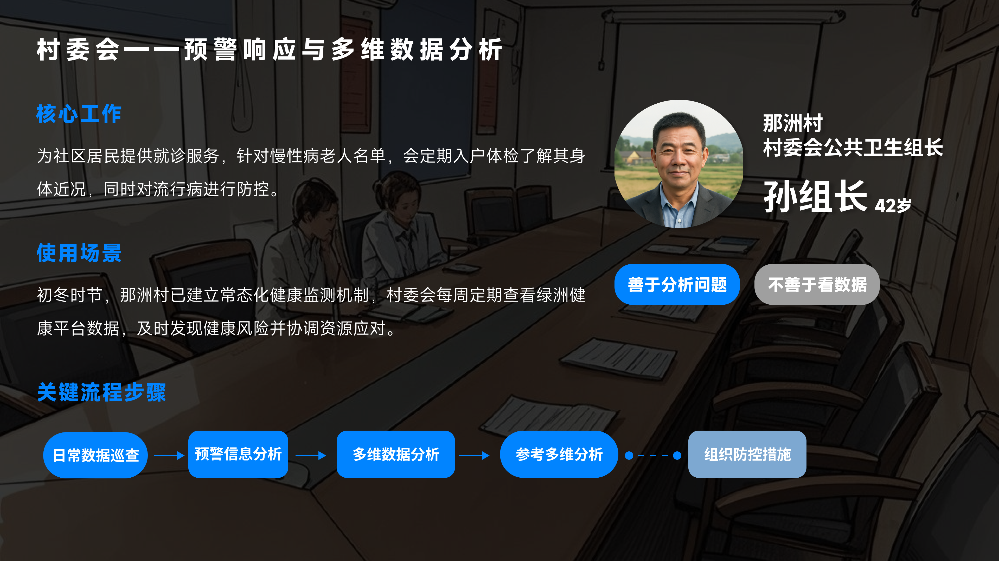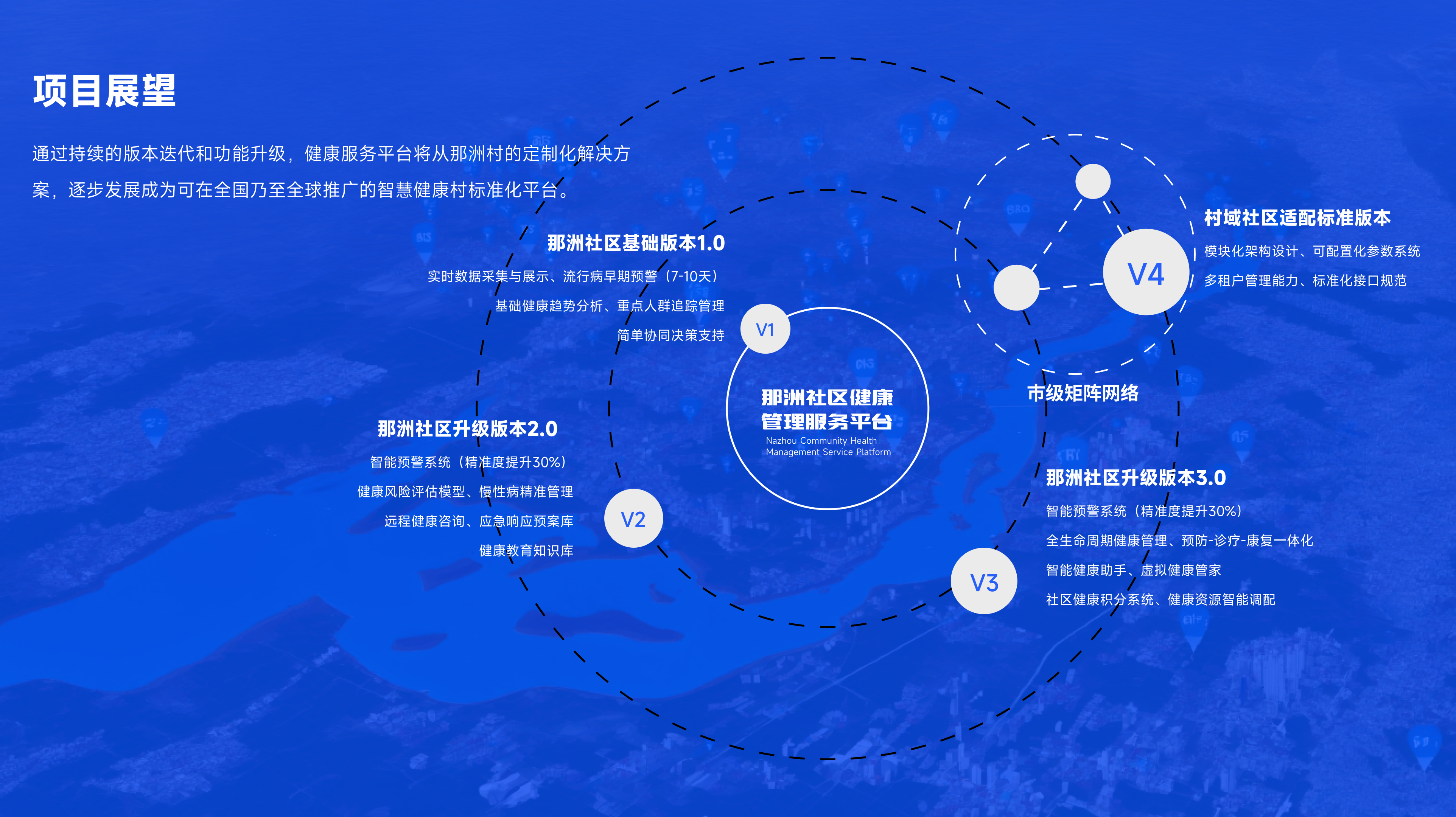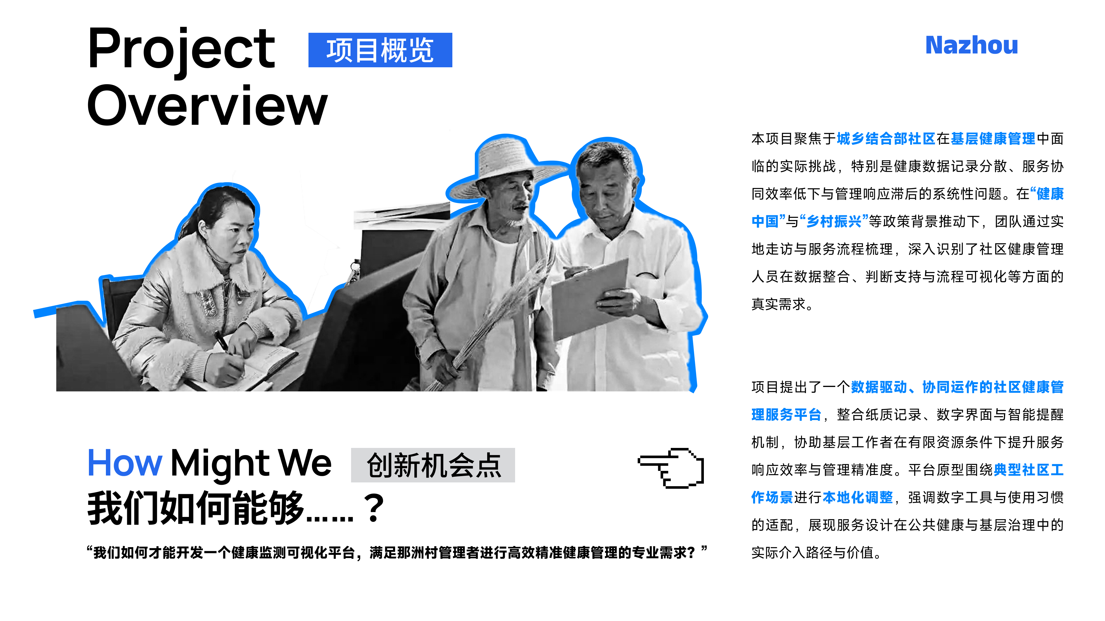 针对珠海市那洲村老龄化严重的现状,创新开发了基于污水检测技术的社区健康管理服务平台。依托北师大环境交叉学院先进的污水检测技术与站点,我们构建了一套完整服务生态:通过污水数据分析,及时监测社区健康状况、预警流行疾病、追踪慢性病趋势,为村落提供健康守护。我们的设计扎根本土需求,用科技赋能乡村健康治理,是数字乡村建设的创新实践。