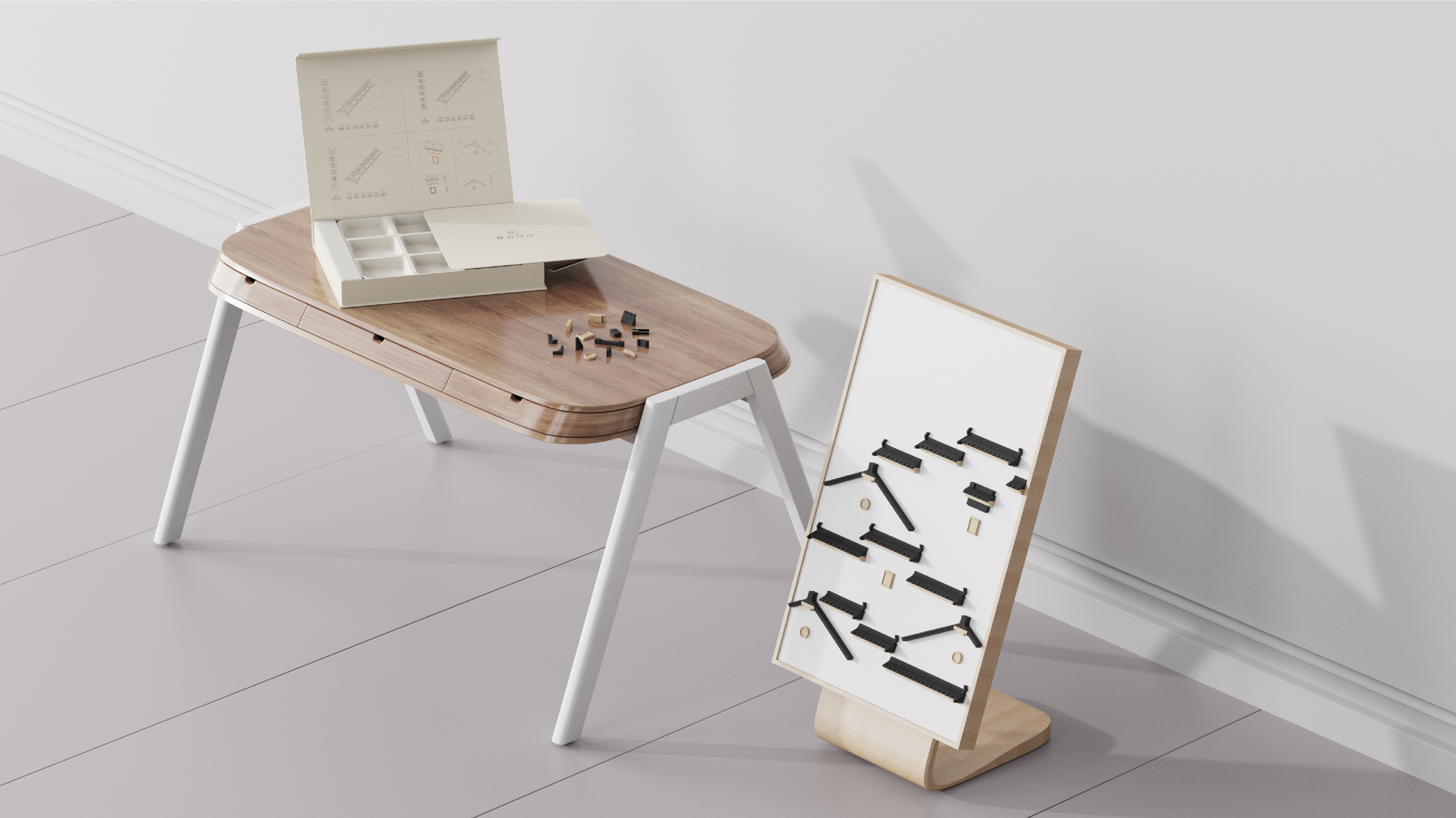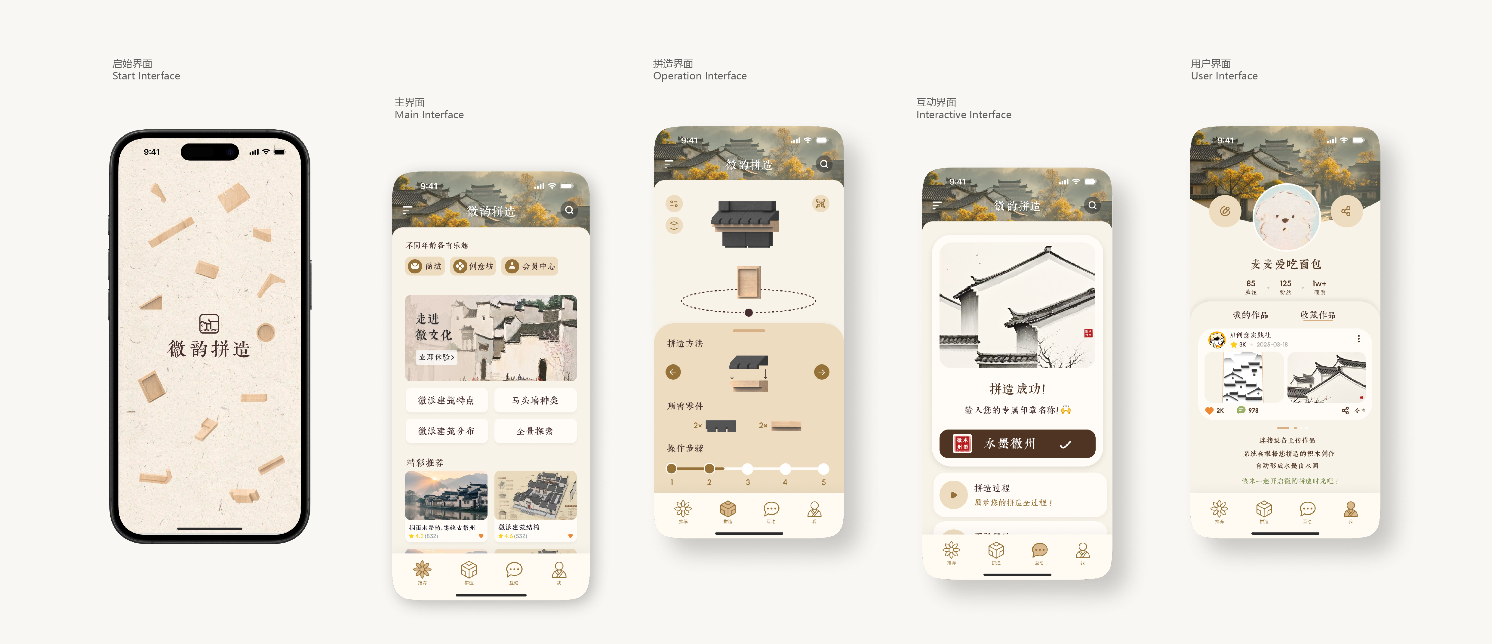 徽派建筑是徽州文化的发源与承载场所,白墙黑瓦的色彩搭配与层叠交错的建筑结构造就了徽派建筑的独特韵律。我们希望呈现出一种能够承载徽州文化气质的文创作品——以立式互动积木玩具的形式,将古朴淡雅的审美趣味带入千家万户。用户既可以在画板上直接搭建积木,形成完整的一幅积木画作,并通过拍照上传专属APP,将现实画作转化成传统水墨画的形式;此外,也可以在APP中绘制草稿,根据用户草稿,APP将给出具体的教学拼造步骤。