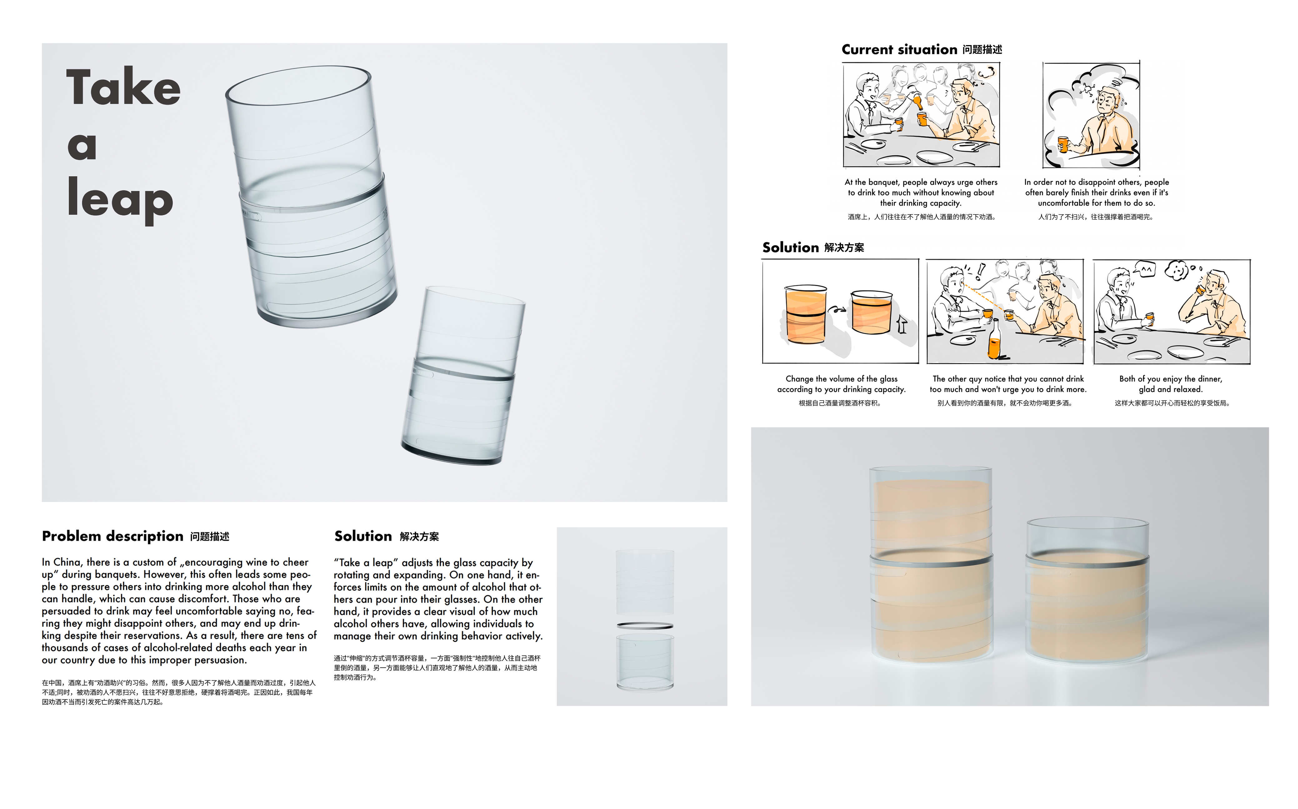 在中国,酒席上有“劝酒助兴”的习俗。然而,很多人因为不了解他人酒量而劝酒过度,引起他人不适;同时,被劝酒的人不愿扫兴,往往不好意思拒绝。因此,我国每年因劝酒不当而引发死亡的案件高达几万起。该产品通过“旋转伸缩”的方式调节酒杯容量,将不同人的酒量可视化,从而控制“劝酒”。