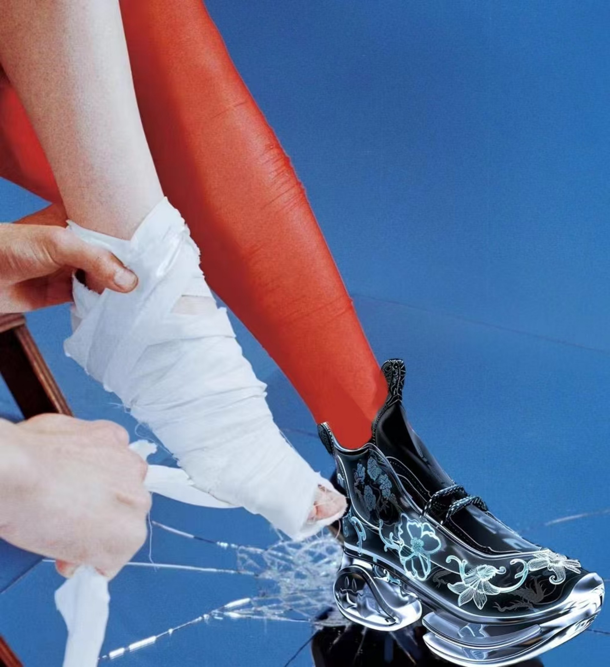 我们作品受“三寸金莲”陋习反思启发,设计了命名为LiberStep智能女鞋,融合中国传统纹样与现代科技,象征女性从历史束缚中走向自由。鞋款还可搭配智能APP,可调节鞋跟高度、实时监测步态与足压,并提供个性化健康建议。设计兼顾审美与舒适,倡导女性自主、健康与可持续的未来步伐。