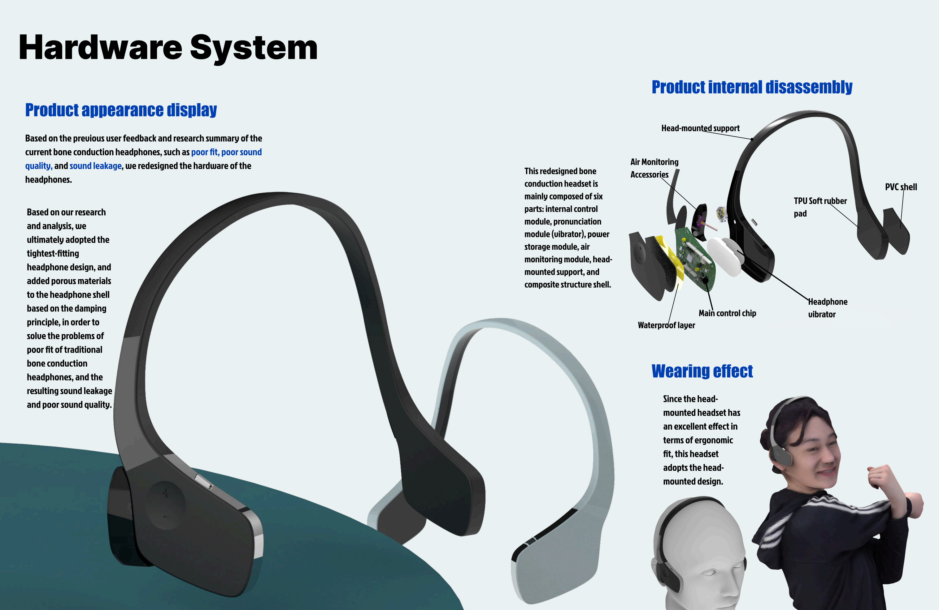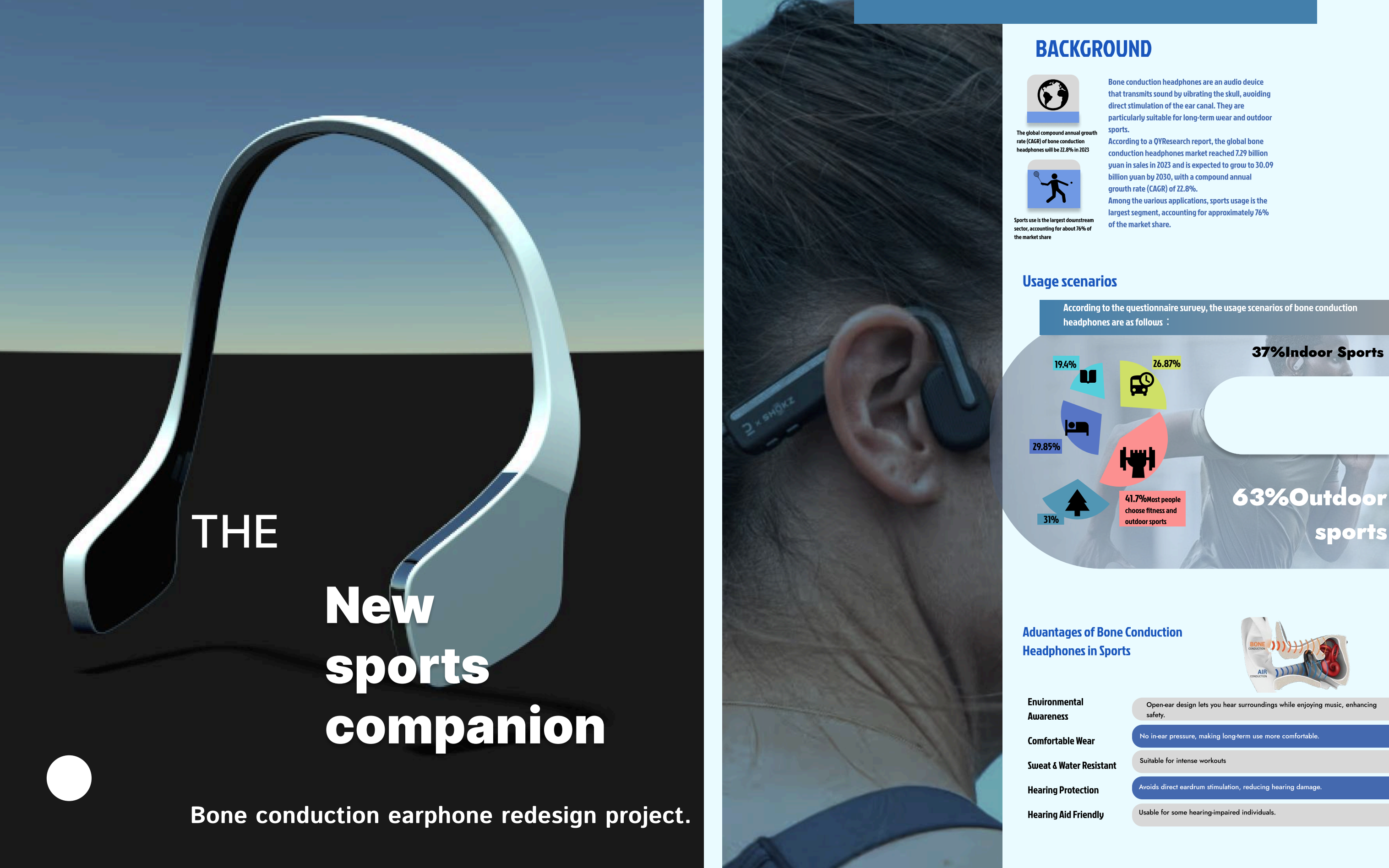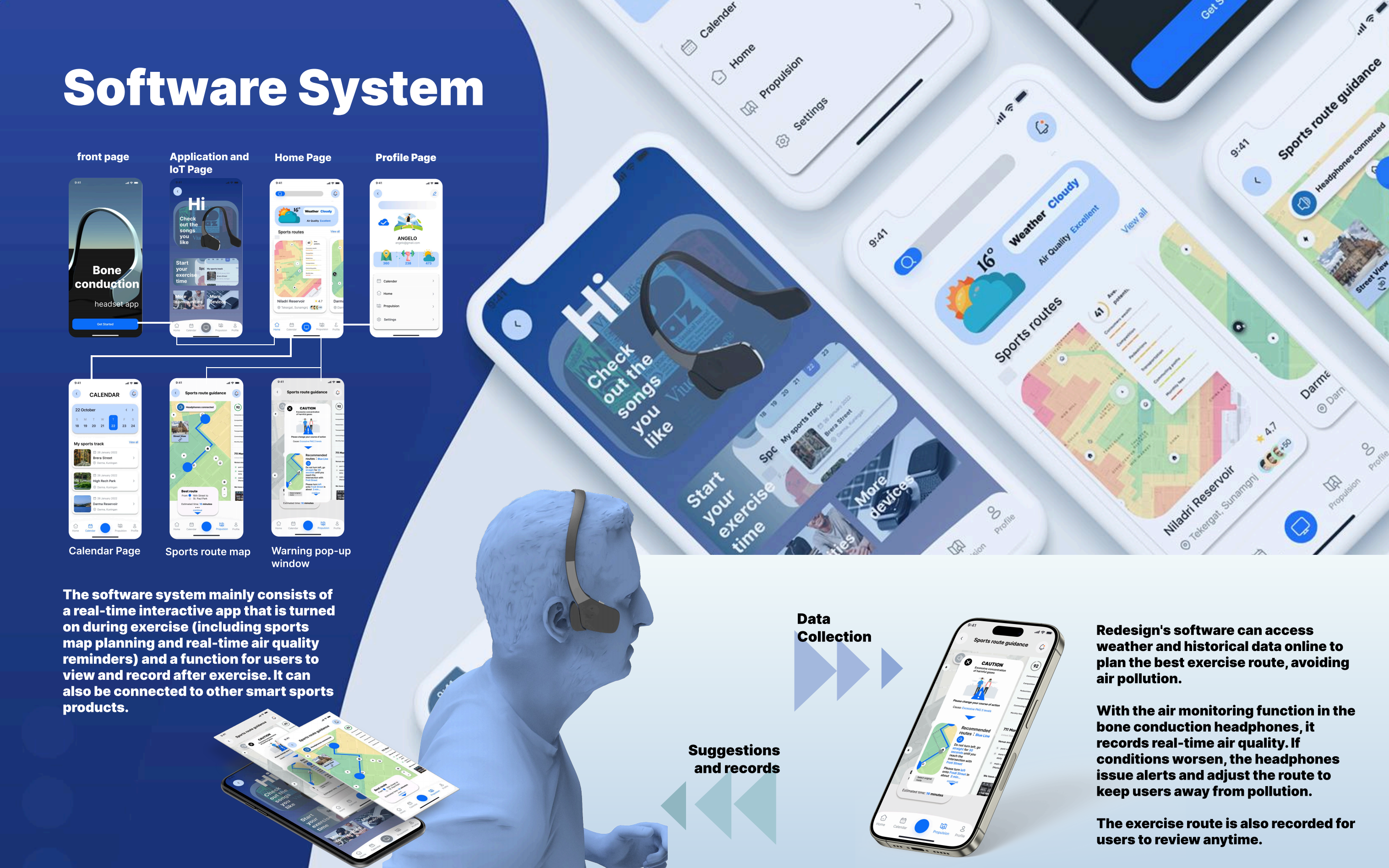 全新“运动伙伴”骨传导耳机专为运动爱好者打造,采用先进骨传导技术与优化的人体工学结构,贴合更紧密,佩戴舒适,防止运动中掉落,音质更佳无漏音。通过添加多孔阻尼材料与复合外壳,全面提升体验。产品集成实时空气质量监测、GPS导航与App支持,运动时可智能提醒污染风险并规划健康路线,数据还可保存供后续查看。同时支持与设备无缝连接,构建智能化运动系统。用户也可自愿共享空气质量数据,推动社区环保与社会责任实践。