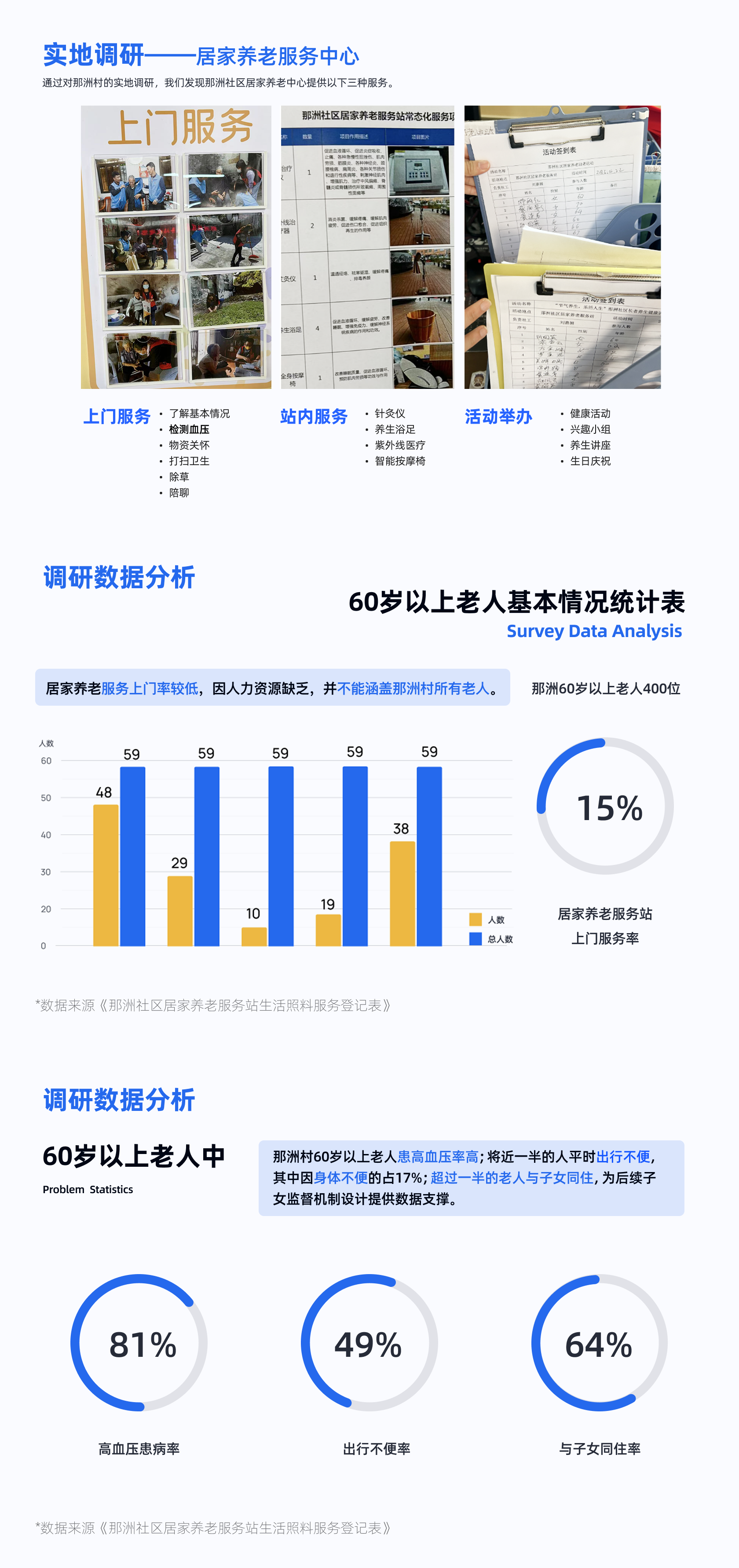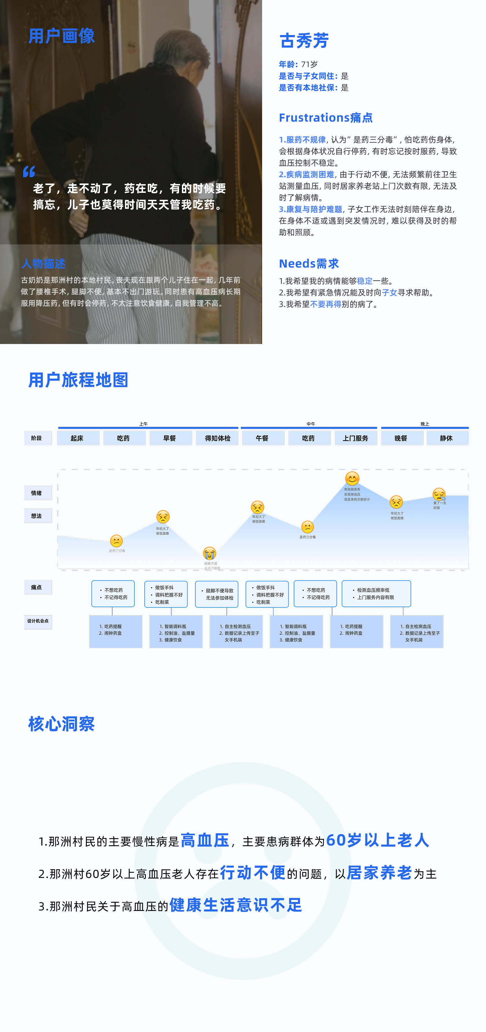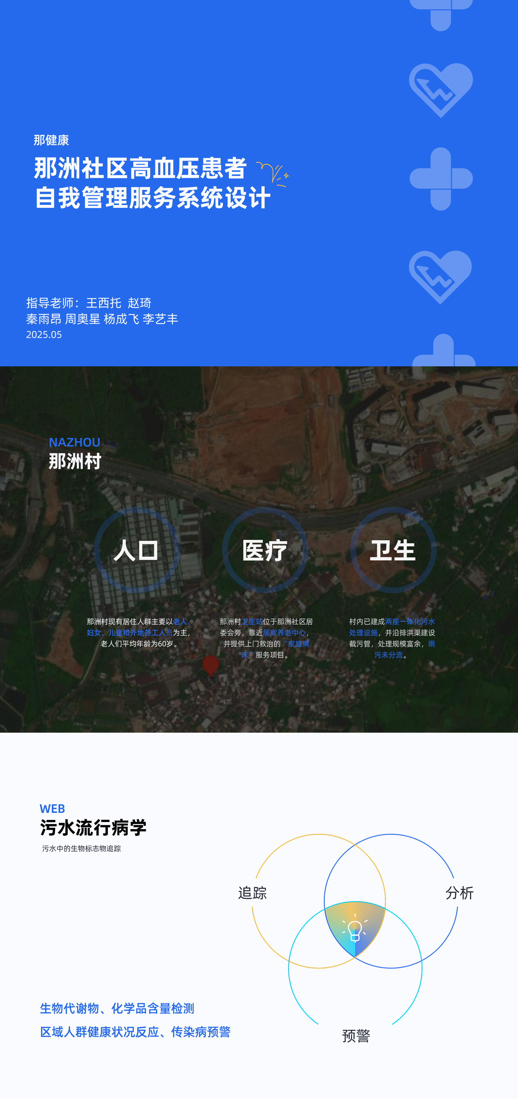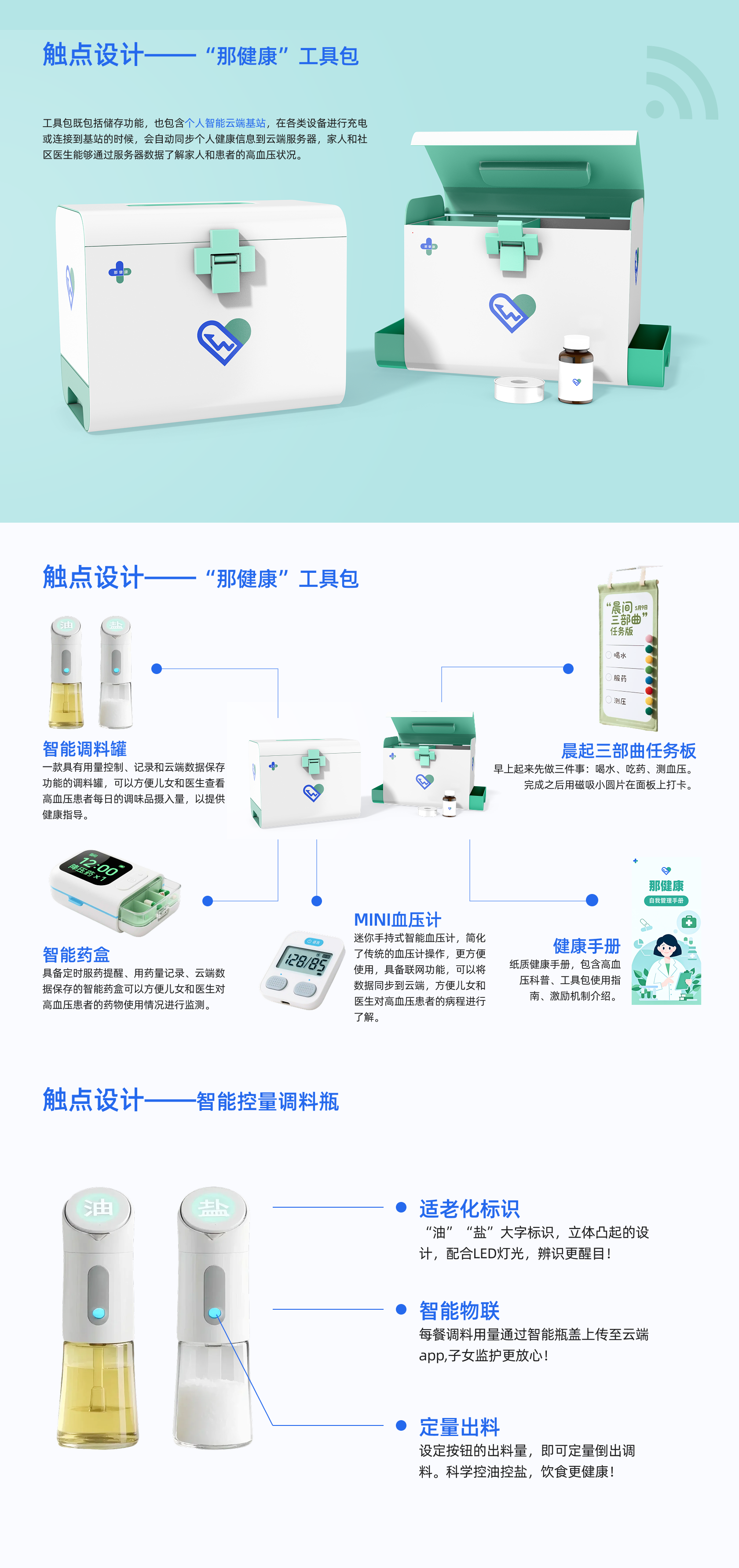“那健康”是一个帮助那洲高血压患者进行自我管理的服务系统,通过工具包搭建患者、家属、医生的智慧物联系统,结合污水流行病学检测技术(WBE),解决那洲村高血压疾病的预防、自我管理问题。本设计促进中高血压患者在饮食、用药、血压数据和生活习惯等方面的自我管理,并将以上信息在家属、医生之间实时共享,形成多方合力的病情监护生态。