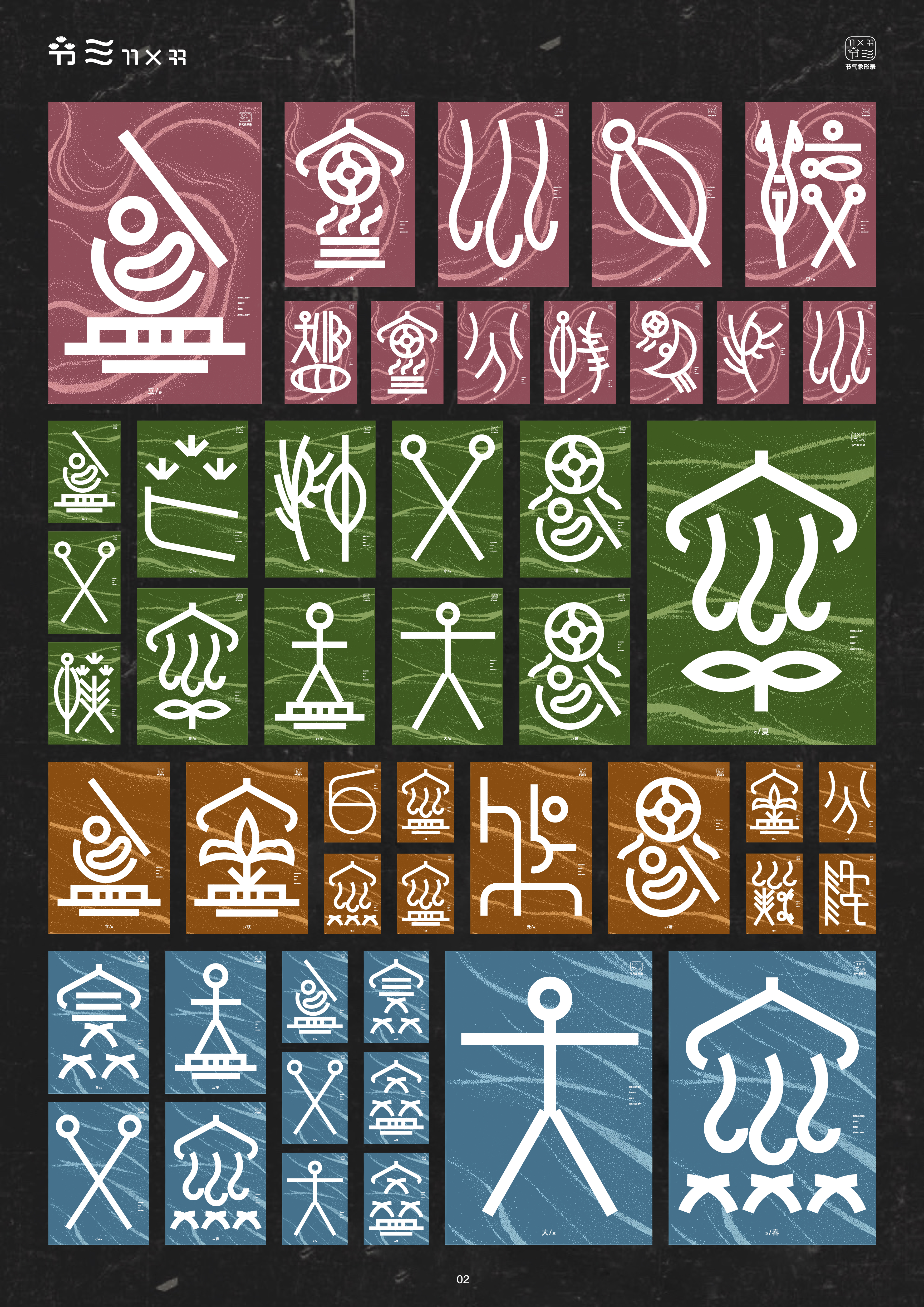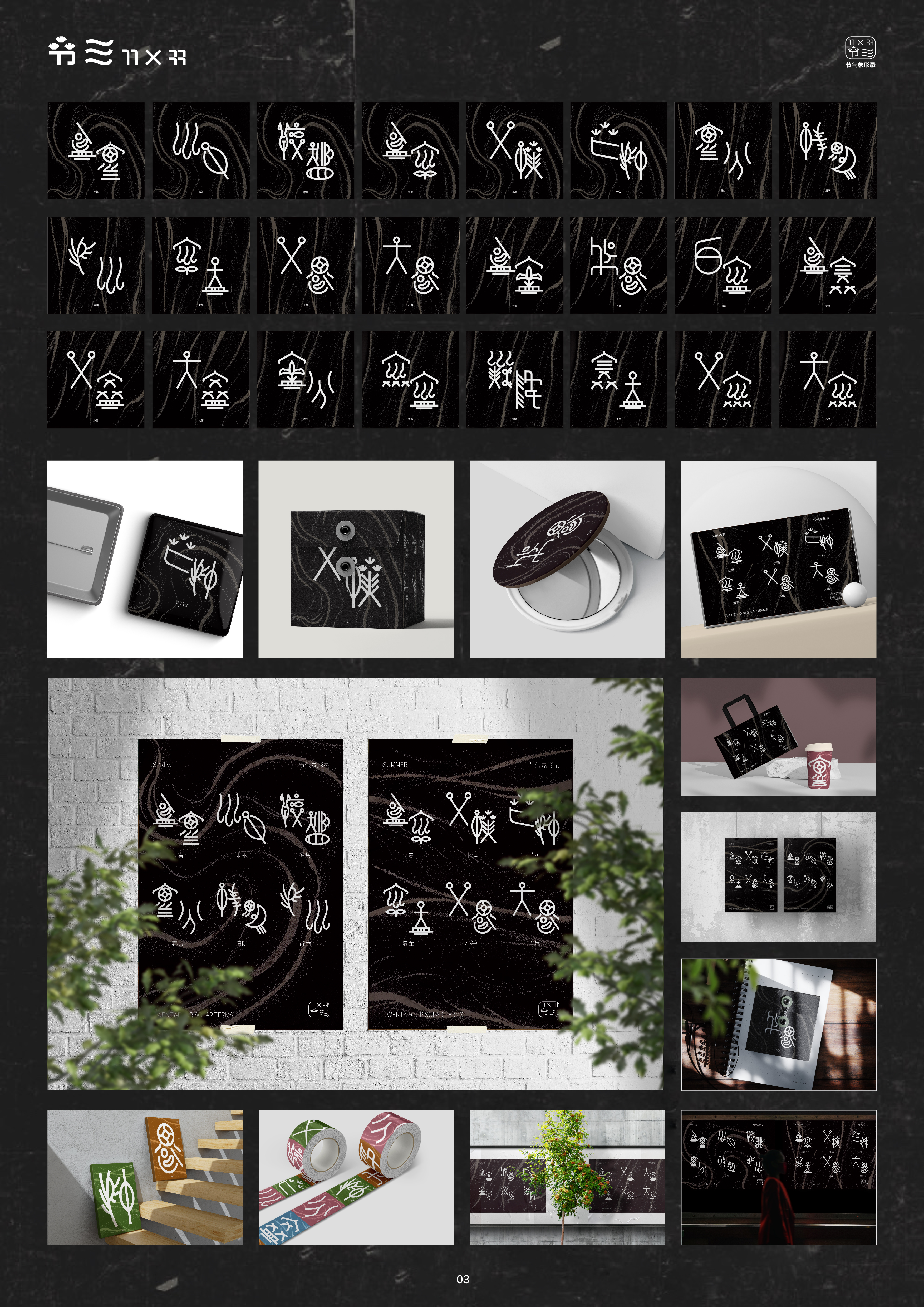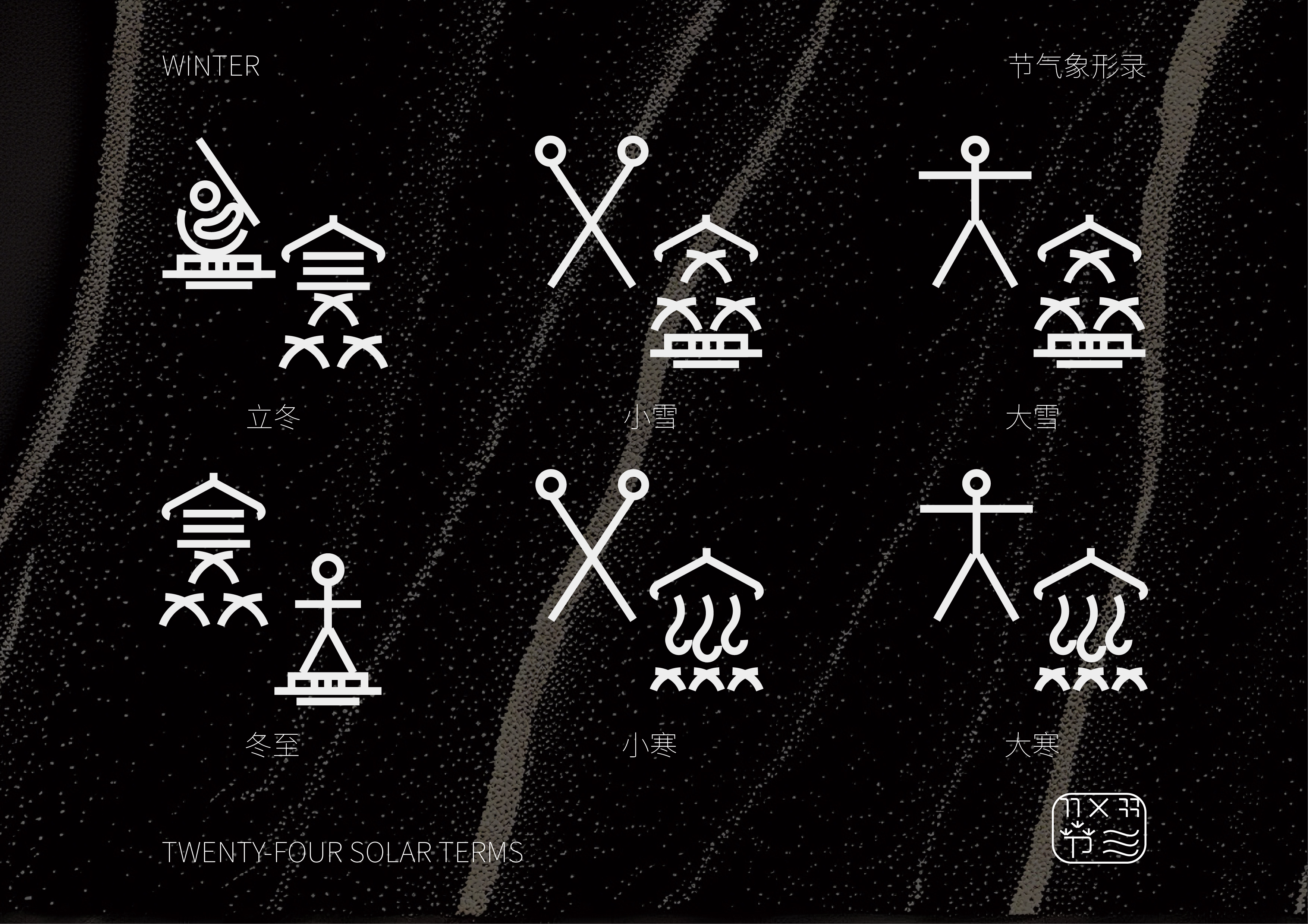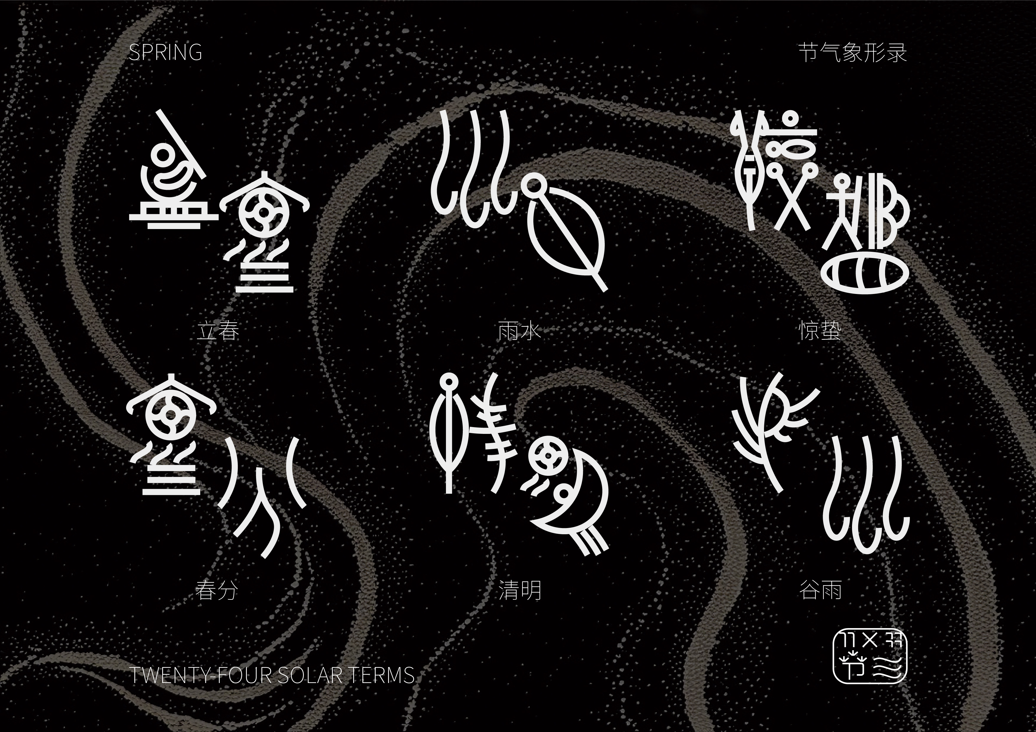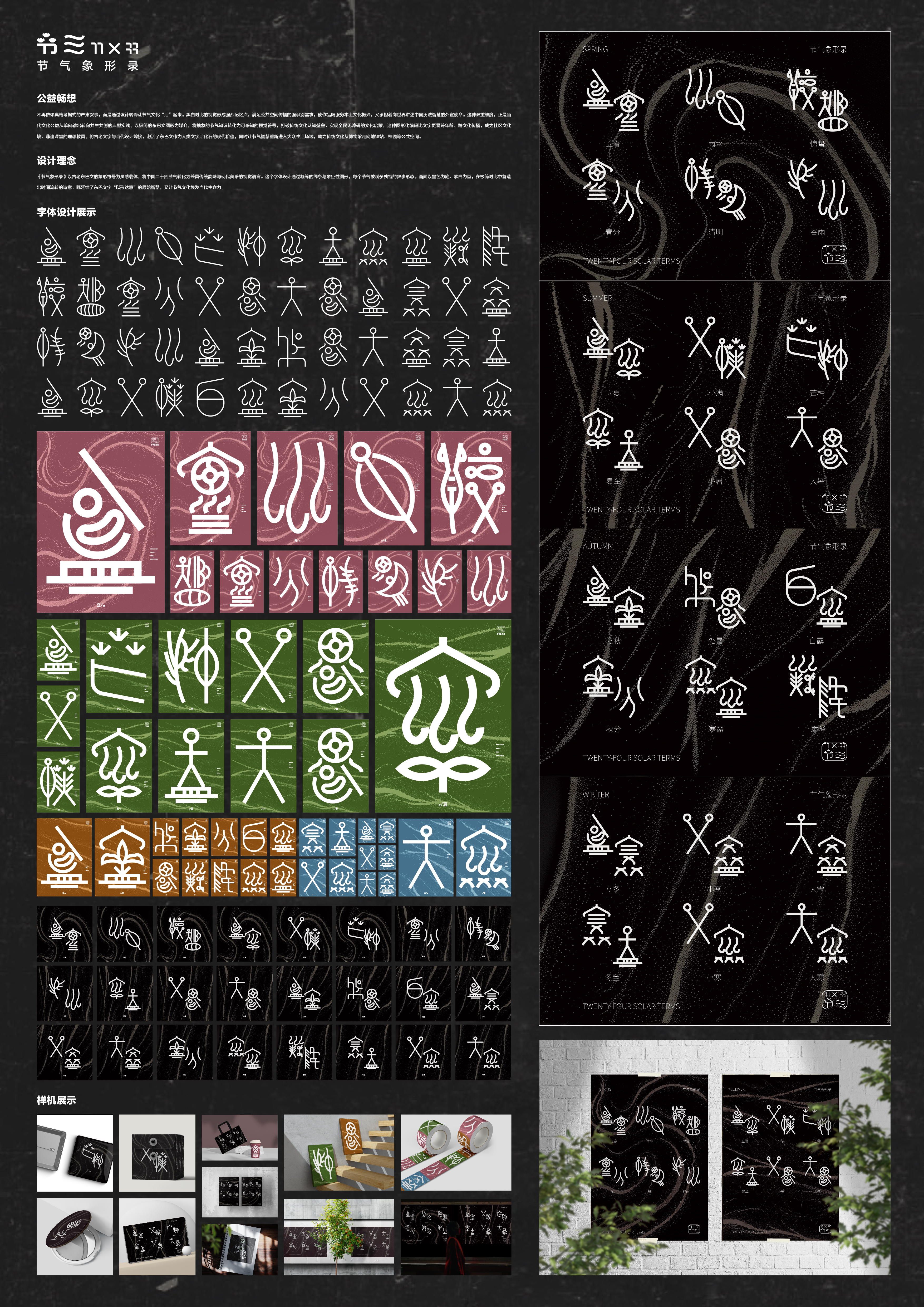 本作品以古老东巴文的象形符号为灵感载体,将中国二十四节气转化为兼具传统韵味与现代美感的视觉语言。这个字体设计通过凝练的线条与象征性图形,每个节气被赋予独特的叙事形态。画面以墨色为底、素白为型,在极简对比中营造出时间流转的诗意,既延续了东巴文字“以形达意”的原始智慧,又让节气文化焕发当代生命力。