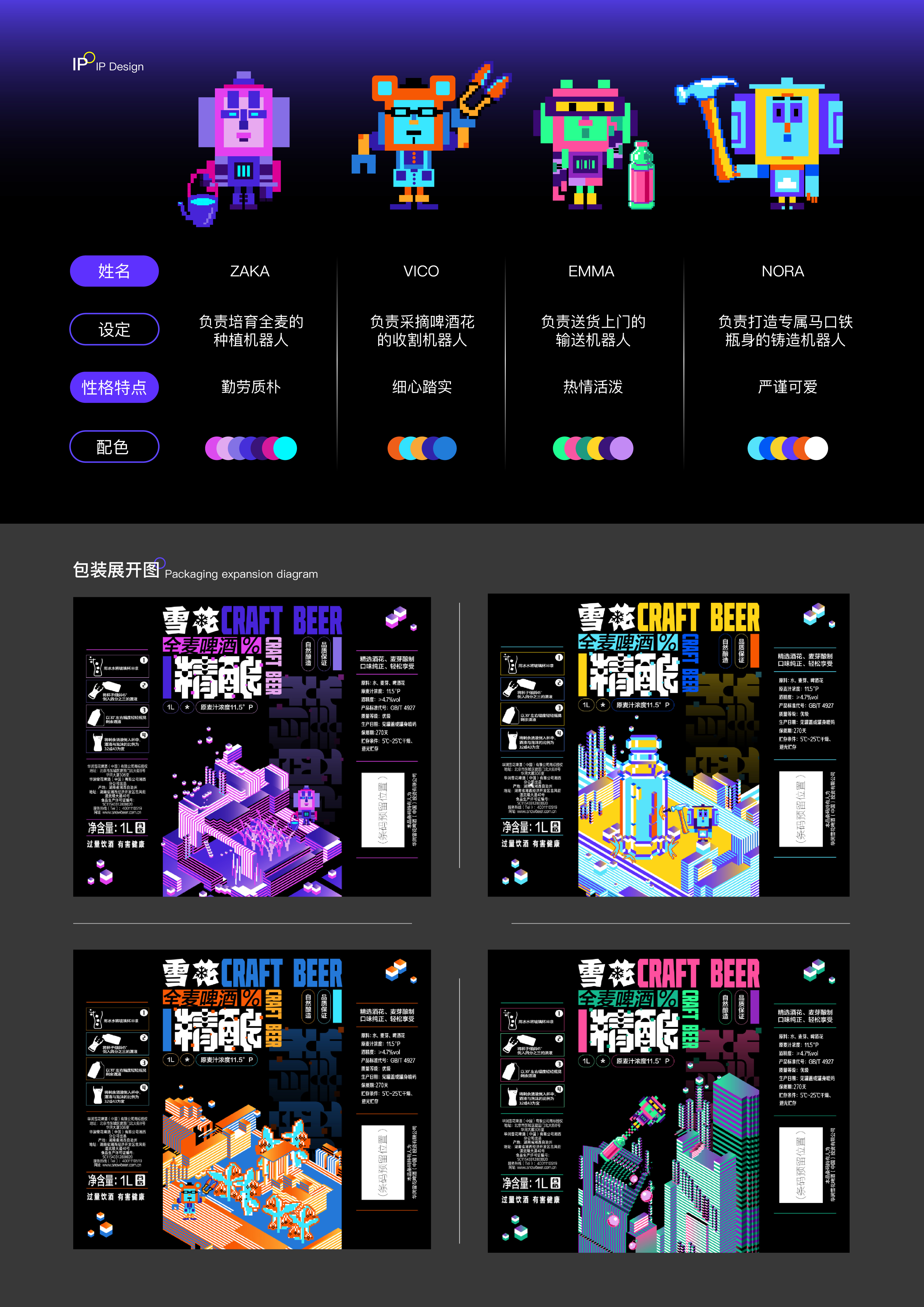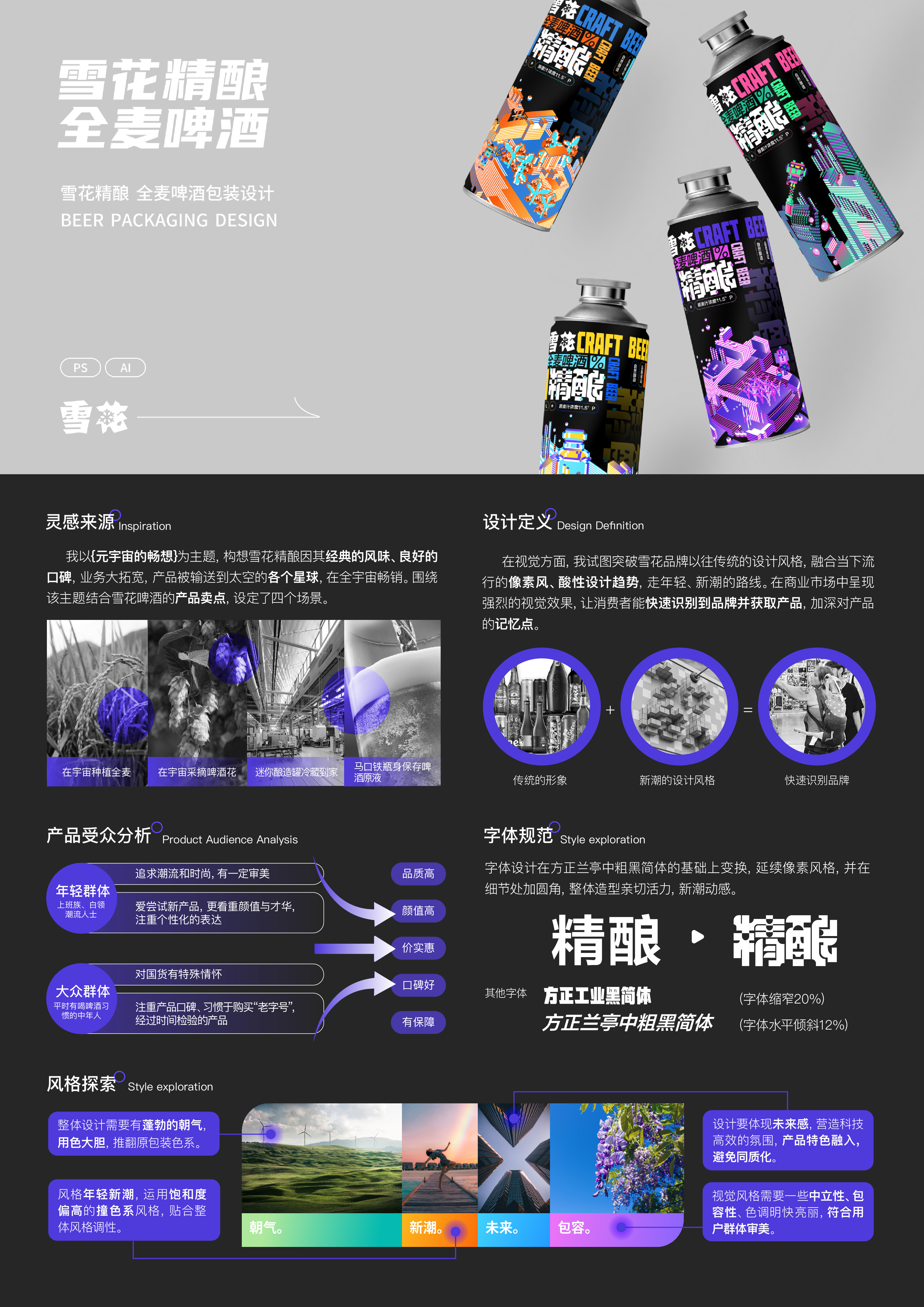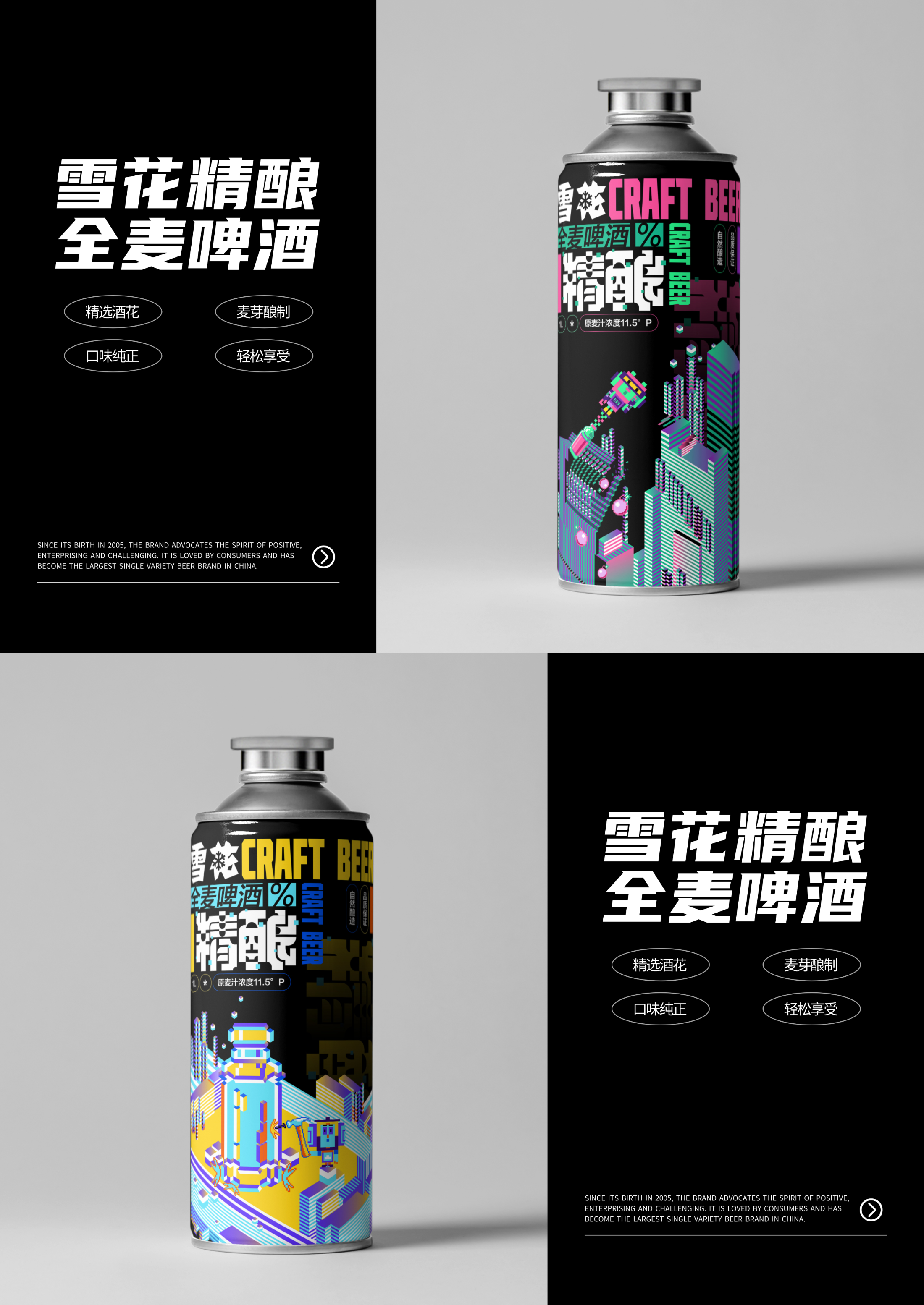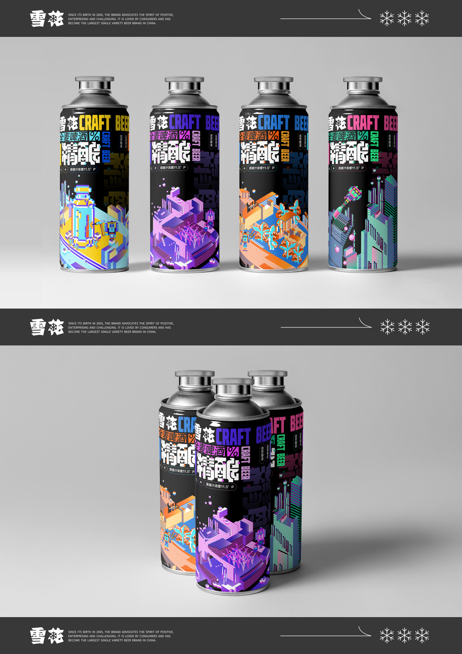 以{元宇宙的畅想}为主题,构想雪花精酿因其经典风味、良好口碑,业务大拓宽。围绕其产品卖点,设定了四个场景:在宇宙种植全麦、在宇宙采摘啤酒花、迷你酿造罐冷藏到家以及马口铁保护啤酒原液。突破雪花品牌以往传统的风格,走年轻、新潮路线,在商业市场中呈现强烈的视觉效果,让消费者能快速识别品牌并获取产品。