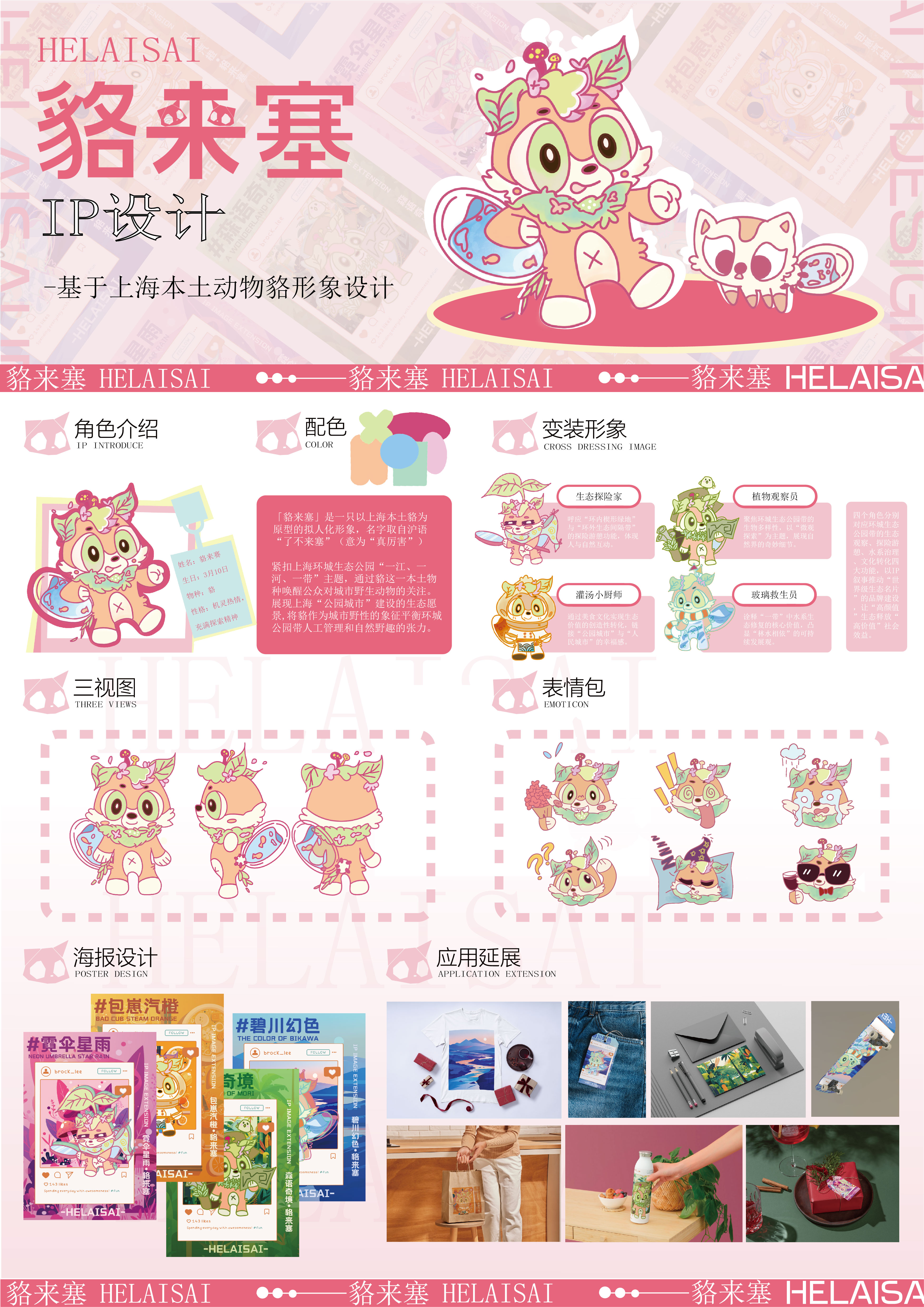「貉来塞」是一只以貉为原型的拟人化形象,名字取自沪语“了不来塞”(意为“真厉害”)我通过貉这一本土物种唤醒公众对城市野生动物的关注。展现上海“公园城市”建设的生态愿景,将貉作为城市野性的象征平衡公园带人工管理和自然野趣的张力。