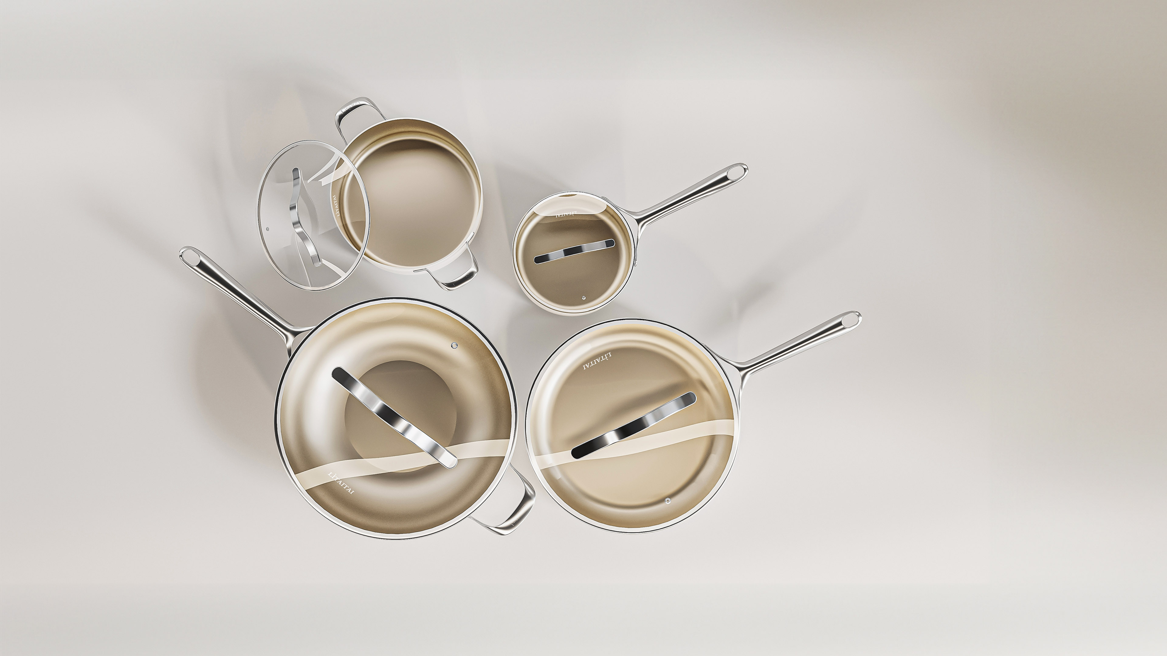 创新三层钢结构,结合内层钛金属、中间铝材及外层430不锈钢,实现了高效热传导与持久耐用性的完美融合。钛的高熔点特性使其防干烧、抗穿孔。独特的钛金覆膜工艺显著增强耐磨性,即使使用铁铲炒菜,亦能保护不粘层完好无损且确保不粘效果持久稳定。