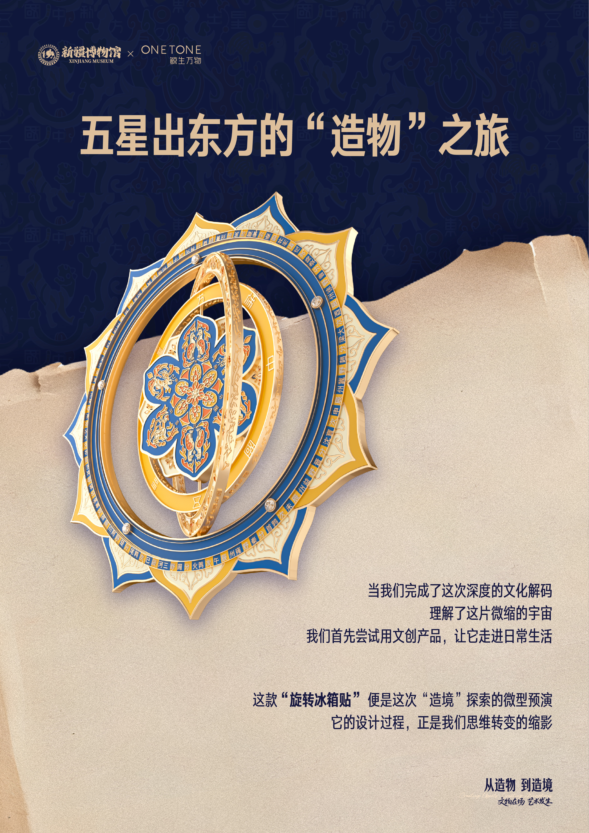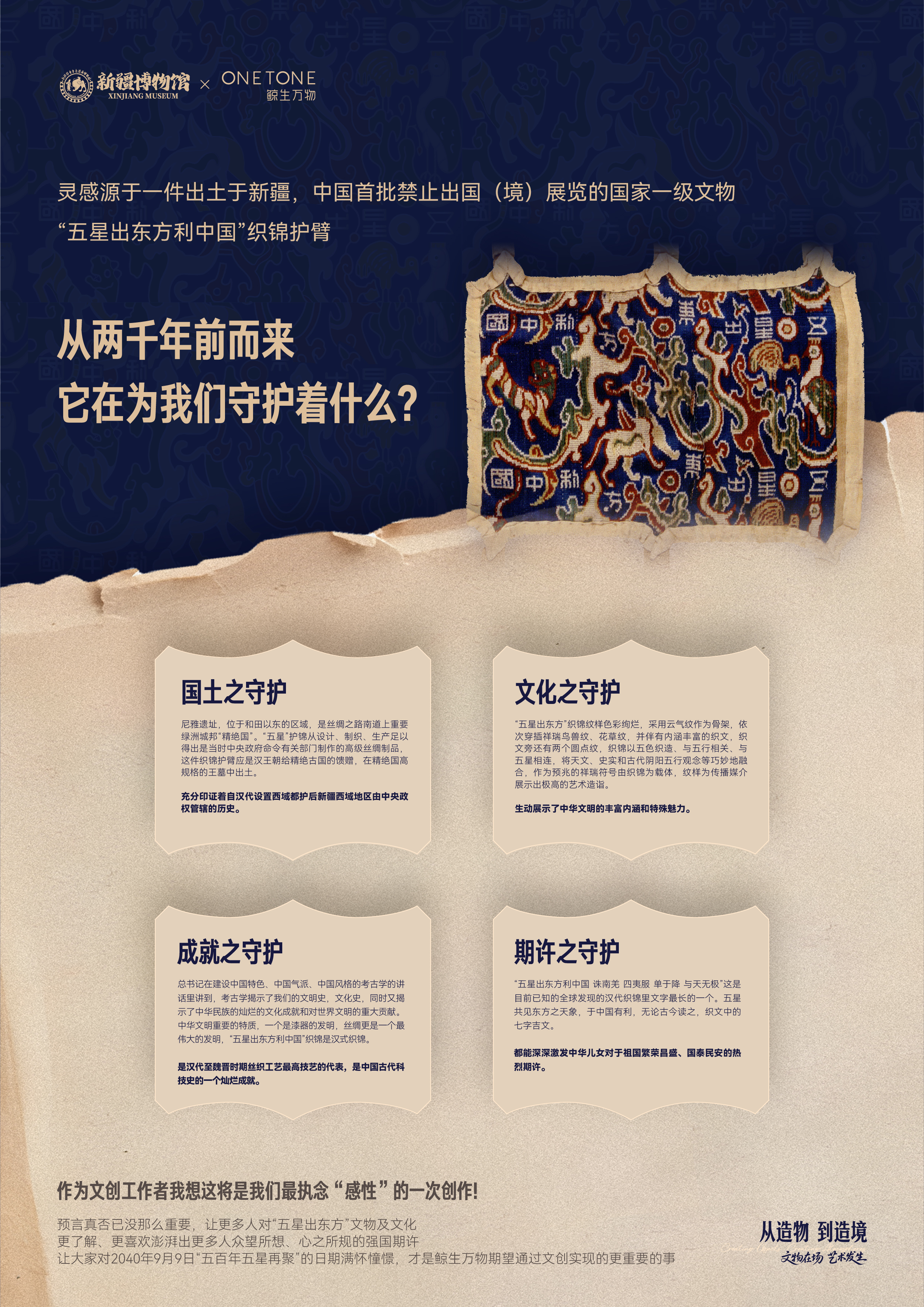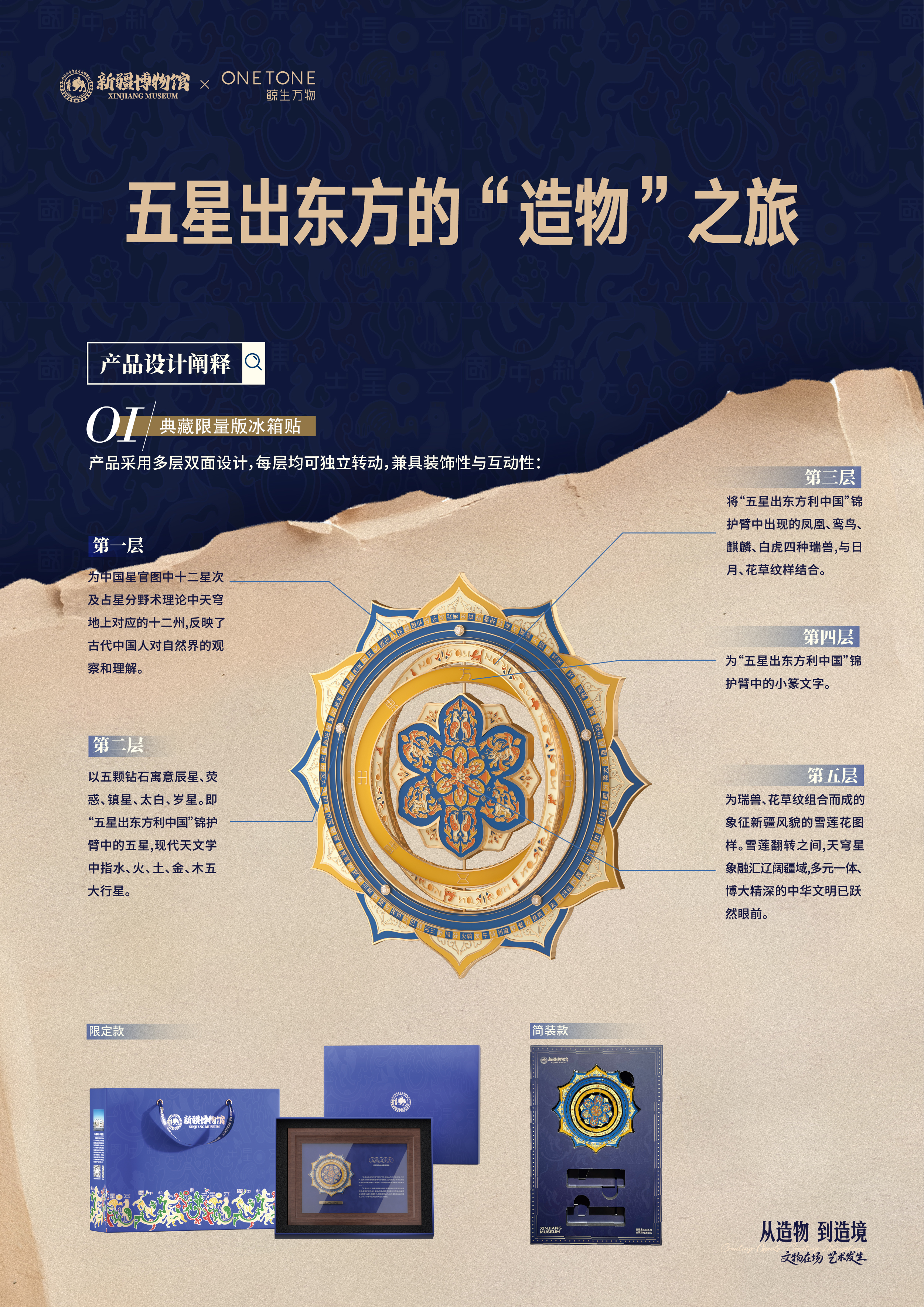 作为一件出土于新疆、中国首批禁止出国(境)展览的国家一级文物“五星出东方利中国”织锦护臂,其通过上乘的织造技艺,将天文、史实和阴阳五行观念等巧妙地融合,生动展示了中华文明的丰富内涵和特殊魅力,彰显了西域对中华文化的认同。「五星出东方」系列文创产品包括限量款礼盒、冰箱贴、笔记本、流苏尺、多功能垫和帆布袋等多款单品,兼具实用性和文化价值,能够吸引广泛的消费者群体。我们希望通过文创产品的设计将这种文化认同感传递给使用者,增强了文化自信和民族自豪感。