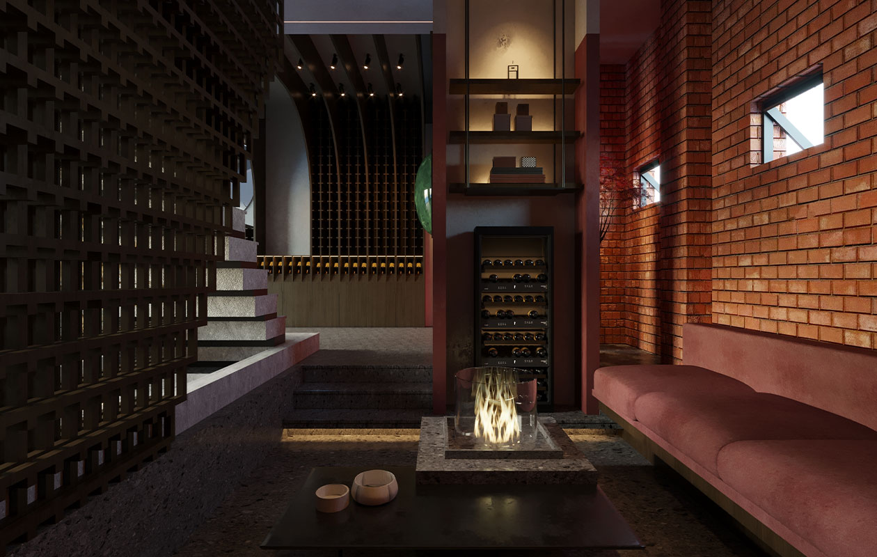 红砖雕饰的墙面,经典复古的石膏圆盘雕花,映衬着壁炉温馨的火光,一切都在轻描淡写,退而又隐,引人沉思,在静谧的流光里感受回味,是红酒,亦是人生!