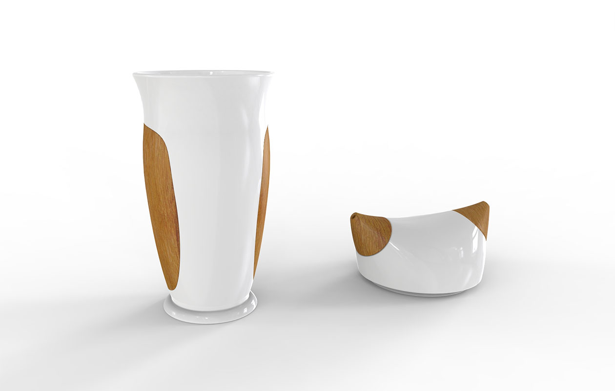 牛角造型可以让人联想到双臂高举振臂高呼的动作,能够引发人们的联想,传达正能量。在倒入开水后,热蒸汽从牛角尖处的孔中冒出,具有一定画面感,使用者不用拿下杯盖吹热水,可以直接在杯盖的一端吹气,热蒸汽会从另一端的孔中排出。考虑到人抓握水杯的习惯,杯身的防烫设计并没有完全围绕包裹,而是在正面预留了一定的空间,这一设计也使水杯整体从正面看起来像一个牛头的抽象表达。