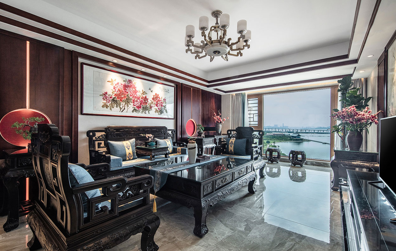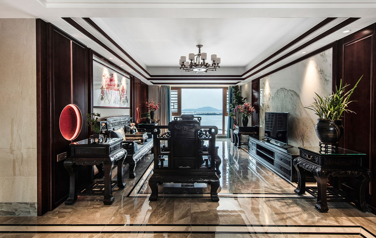 “宠辱不惊,看庭前花开花落。去留无意,望天上云卷云舒。”国人对理想生活的追求,从生活方式,慢慢演变成一种精神文化。从入户,墙面仿砂岩的天然质感,移步到厅中心,客餐厅一体的传统的中式开放空间,稳重治静。小处则以小品式构图布景,体现主人的生活雅趣。天然大理石的绵延山峰,如一笔浓墨色彩,天花几道深邃线条勾勒轮廓,木质的敦厚温润,展开了中式空间的概念美,倚湖而立的建筑,超大尺寸的通透落地窗,如铺开的画卷一般,画中有画,景中有景。