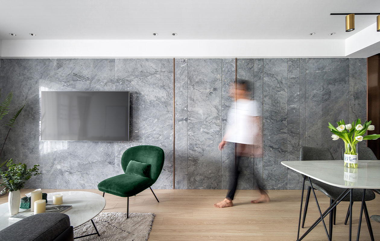 本案以“白”色为主,“白”色作为空间的中立之色,是空间的“主角”,也是空间的“配角”不同颜色,如:本案中黄铜不锈钢、银河灰大理石、金属摆件放置到白色当中都会让颜色在空间里更加富有层次感以及轻奢感。“原木色”自然纯粹、朴实无华,不管是只做城墙面造型还是家具及地板,不仅简洁环保,还寄托现代社会快节奏的生活情况下人们对自然生活的美好向往。
