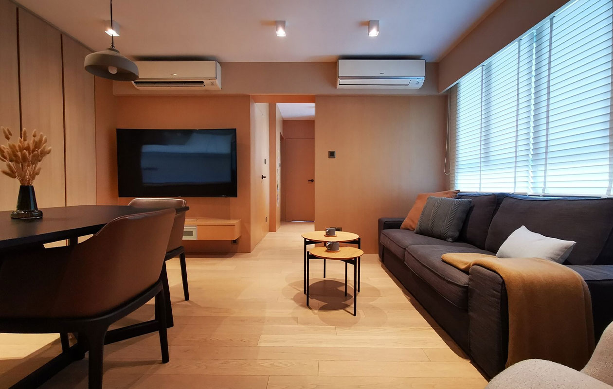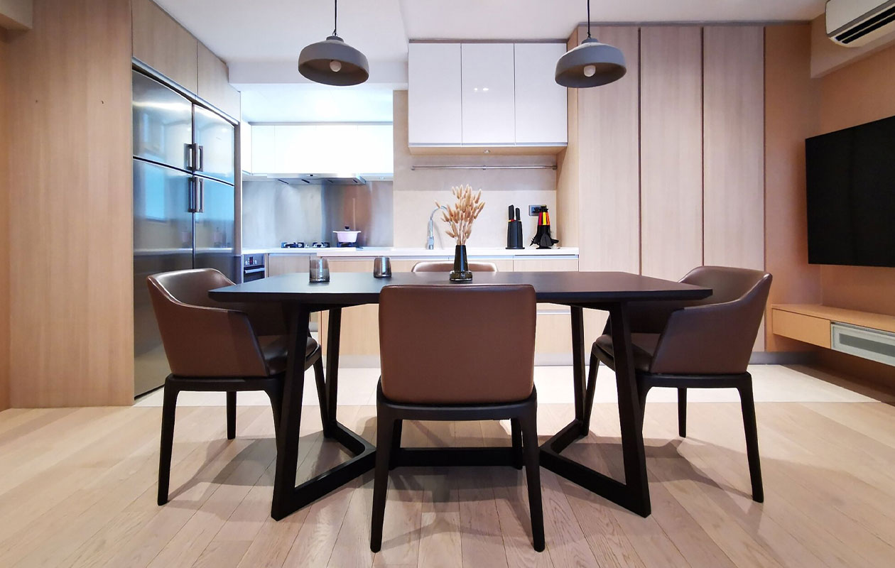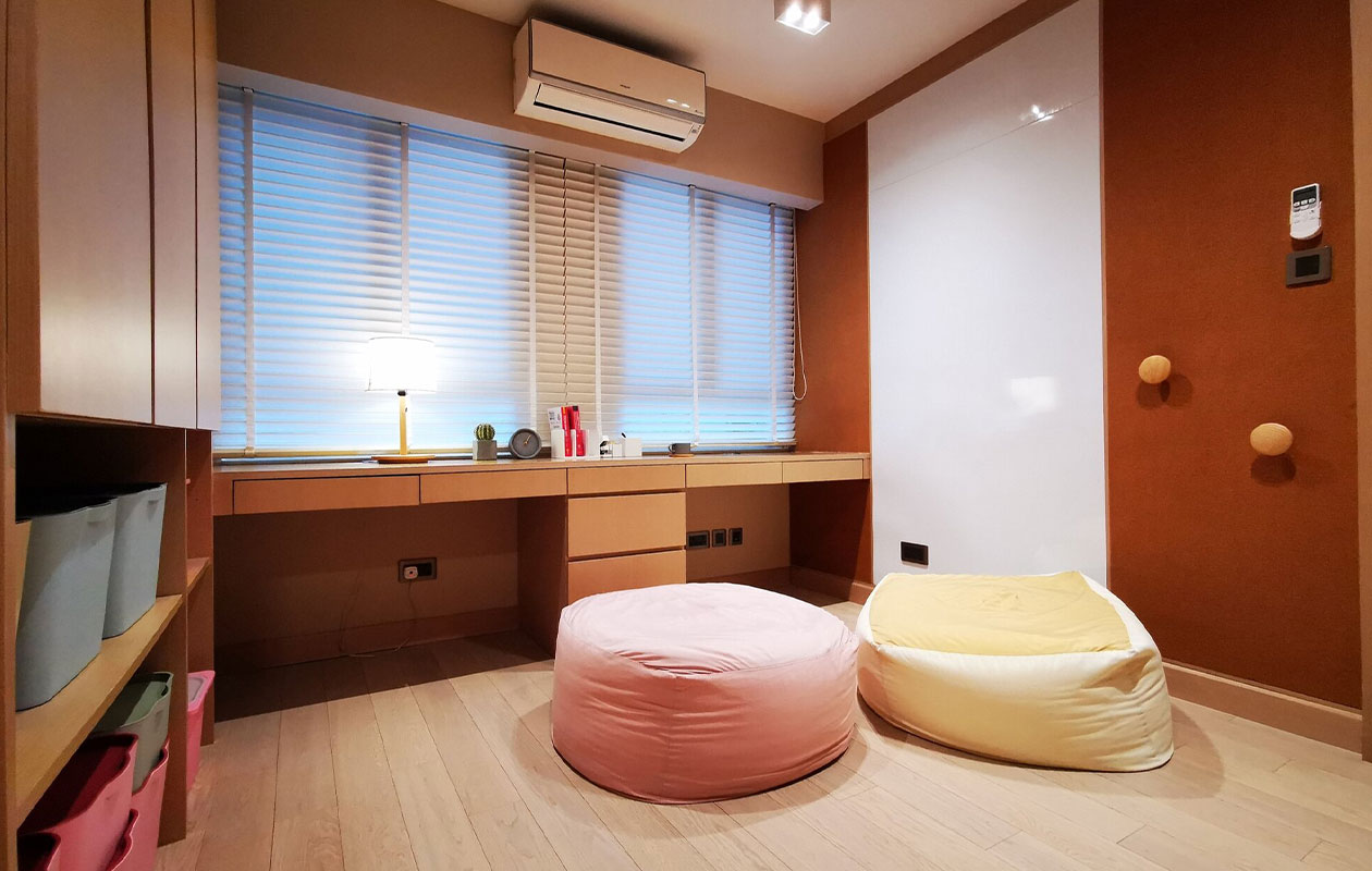 设计着重于空间运用,将原规划是四个睡房,改建为一个主人套房,其余地方作为开放空间,集学习、活动、玩乐和储物于一体的多功能空间。活动区墙上设有白磁板和软木留言板,让小孩随便涂鸦和将创意画作随意贴上,有时候可作为运动场地,或窝在懒人沙发上看书和听音乐,让空间有更多可能性。