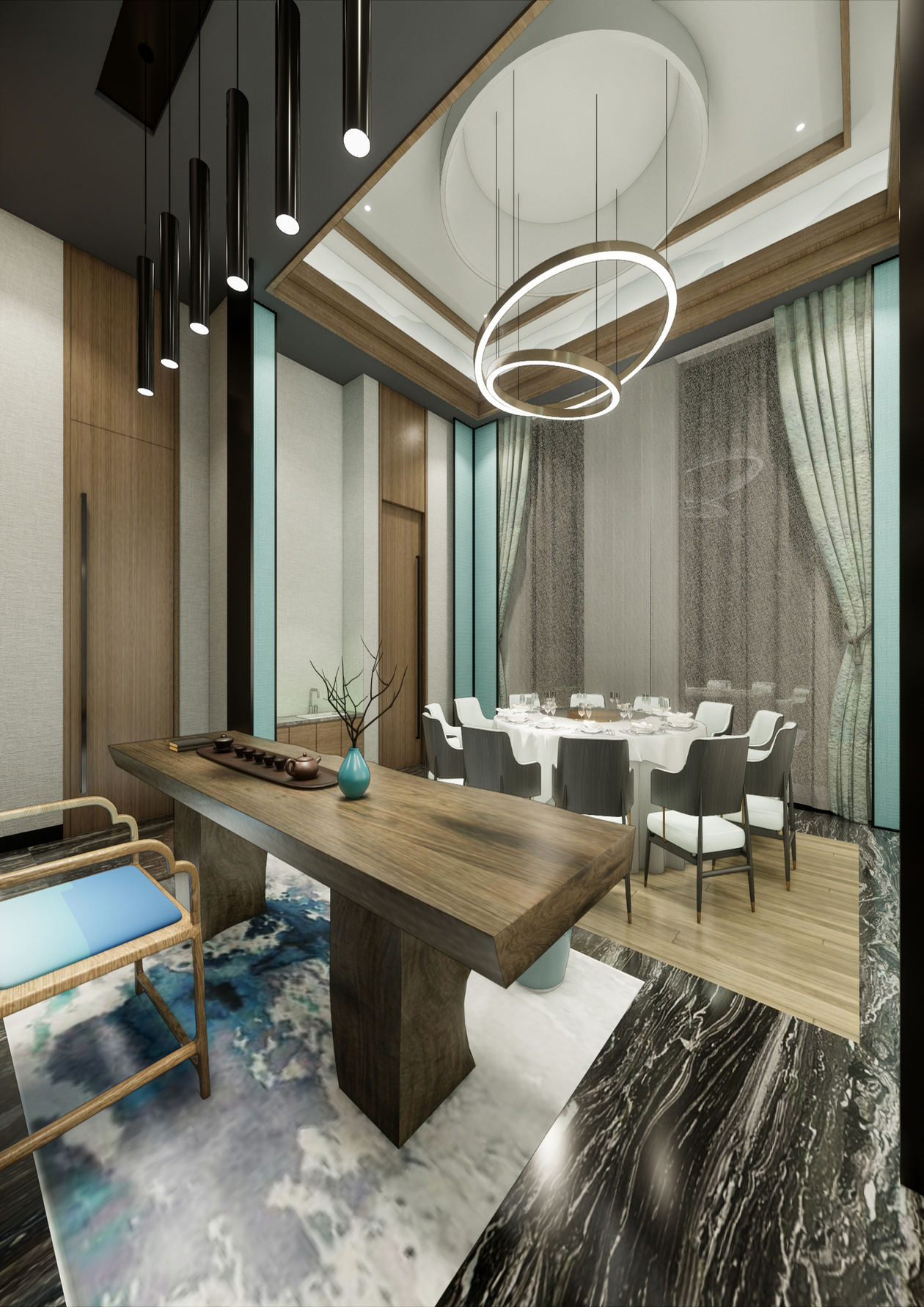 本项目位于江苏宜兴,作为建筑从业者的业主希望能以此作商业接待用途。设计师以建筑中最常用的几何体组合为思路,巧妙地界定出了各个功能区域。圆与椭圆元素融入设计的各个角落,逐步转化为空间的符号,给人以柔和及跃动感。楼梯处的格栅设计既保证了室内的自然采光和通风,同时阳光映照其上,投影于石纹地板,光影的流动营造出一种静谧的境界。大厅墙面石材原料采用半光半凸的处理手法,银杏叶雕刻饰以金箔,材质对比更彰显材料自身的特质,同时也能完美修饰大理石的拼接纹路。茶室墙面以金属材质为主,环绕木纹装饰凸显金属的质感,弧形的墙面设计使得光影在金属上的流转更具柔和感。金属墙面增加小鸟装饰,让单调的墙面添附了大自然的灵气,群鸟归巢,与窗外景致互相辉映。木石与几何元素的融合,营造回归自然质朴的意境,给人以返璞归真的惬意感。