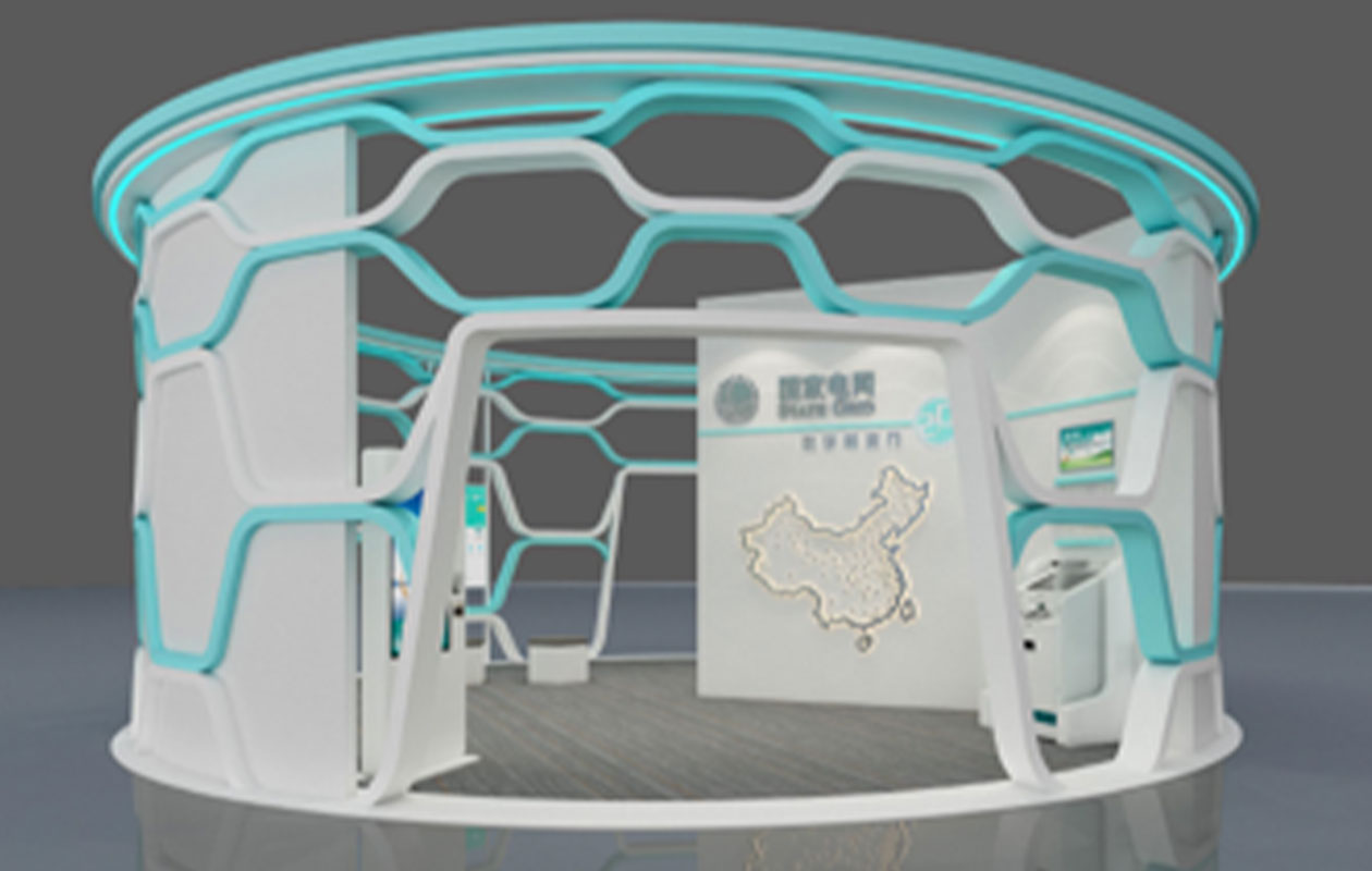 该方案是为国家电网江苏电力有限公司设计的营业厅展示厅,总面积 95 平方米,采用开放式的设计手法使得各部分空间交融,整体效果突出。展厅部署于江苏电力公司一楼圆形大厅中央位置,整体采用圆形设计,使造型与现场环境协调一致。