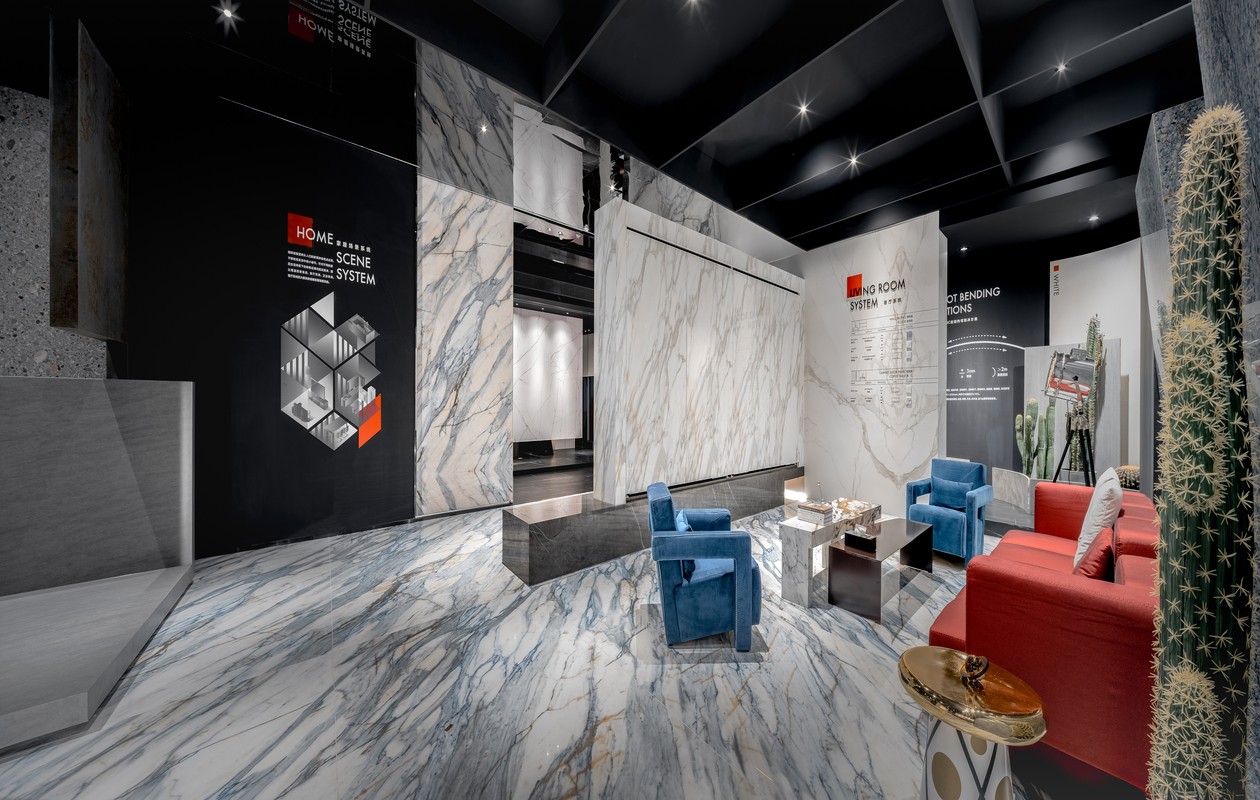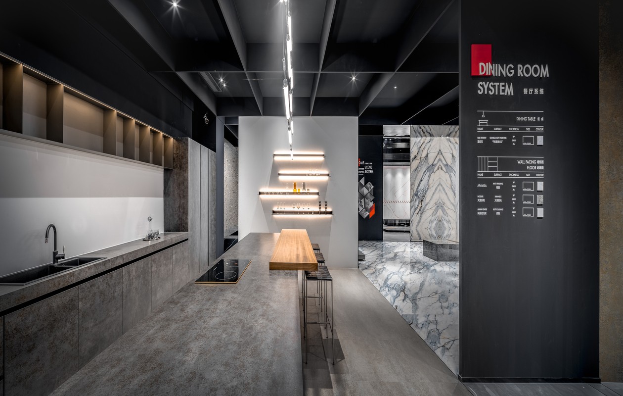 新物种、新材料,势必也带来新运用。岩板除了上墙、铺地之外,超薄尺寸可作为饰面板,创造出无限可能。设计团队首创式地引入意大利板材标准,对岩板产品的规格、面材、尺寸、适用场景等参数进行系统化梳理,并形成行之有效的可视性标识体系,让客户多维度地了解产品,填补了国内展厅设计在标识版块上的空白。