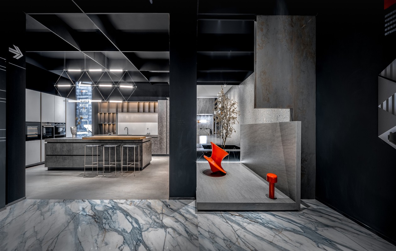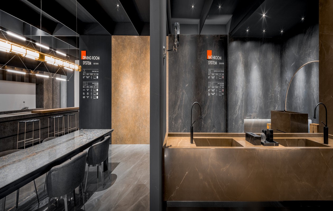一镜到底:场景体验与系统标识以电影中的长镜头手法解构空间,形塑明晰动线——不折返,一“镜”到底。墙及地面运用不同岩板,区隔出客厅、餐厅、厨房、卫浴、选材区、洽谈区的不同场域。客厅的对纹电动门、客餐区的小园景、餐卫的色调衔接……力求介入设计,将场景转换消弭于无形,让观者沉浸式地体验其中。