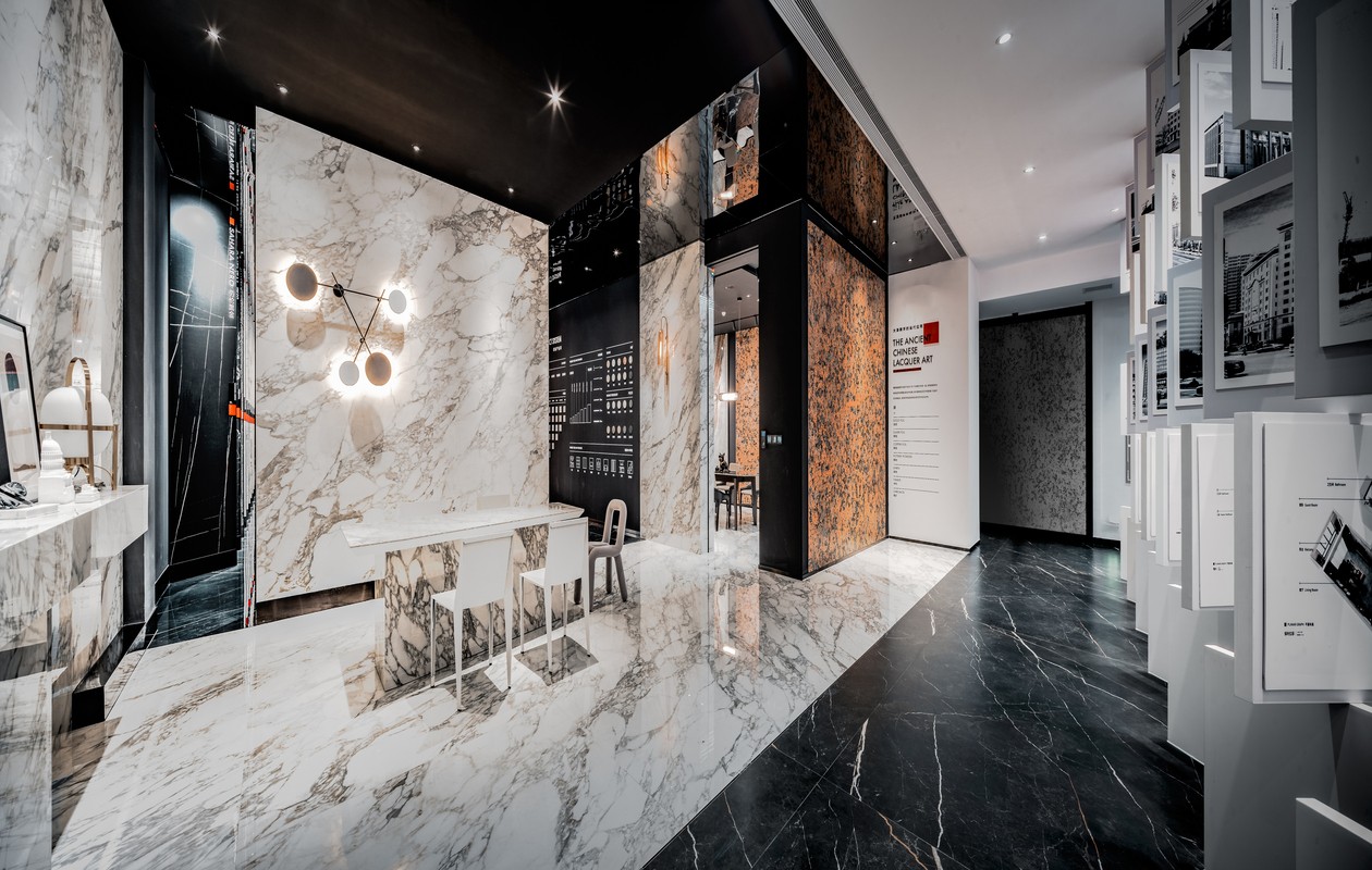 合了顺辉岩板“取法自然”的初心。游走大堂,庭院理水,堆山叠石,颇得中式园林欲藏于露的妙趣也。