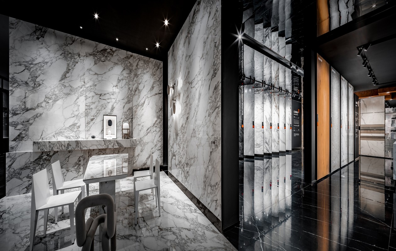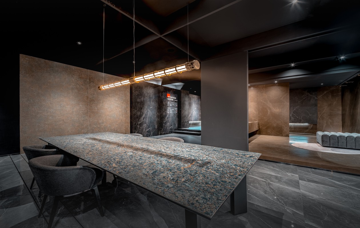《桃花源记》有云,“初极狭,才通人。复行数十步,豁然开朗。”顺辉岩板展厅入口平缓,进入大堂,有豁然开朗之感。层高7 米,天花饰以黑色不锈钢镜面,延拓空间,弱化其他材质的存在感。譬若国画所讲求的计白当黑——一纸笔落,留白三分,韵味悠长,以内敛空间凸显展陈效果。
