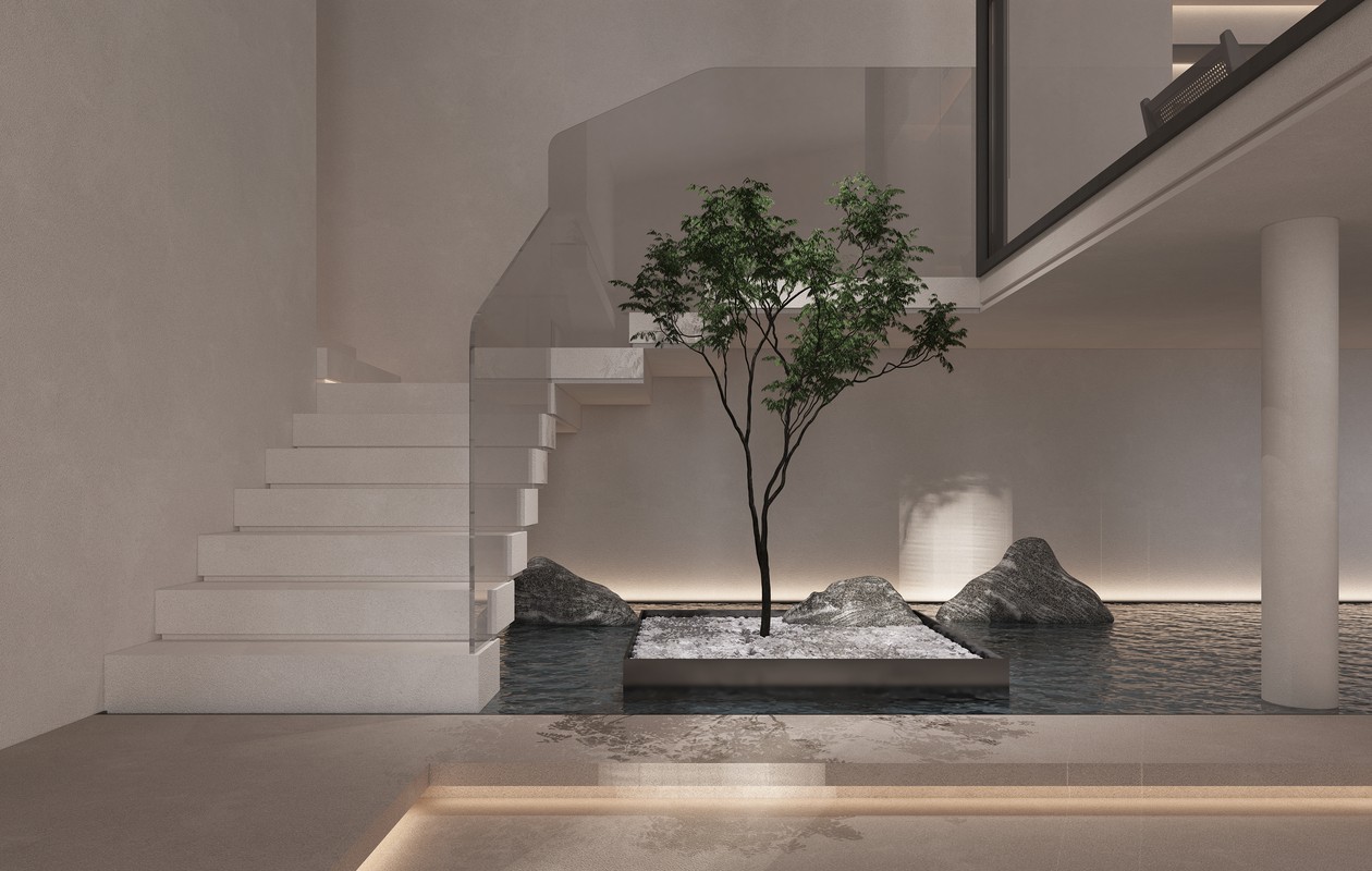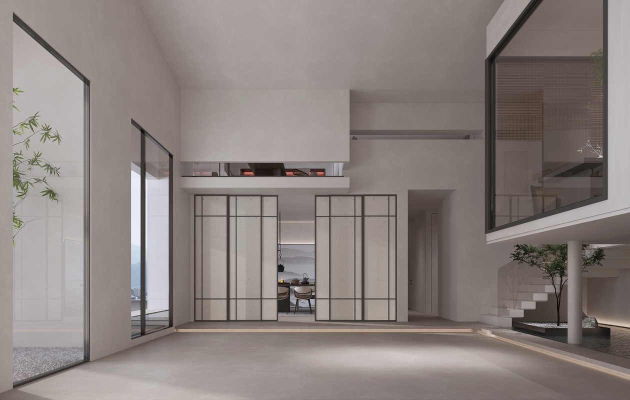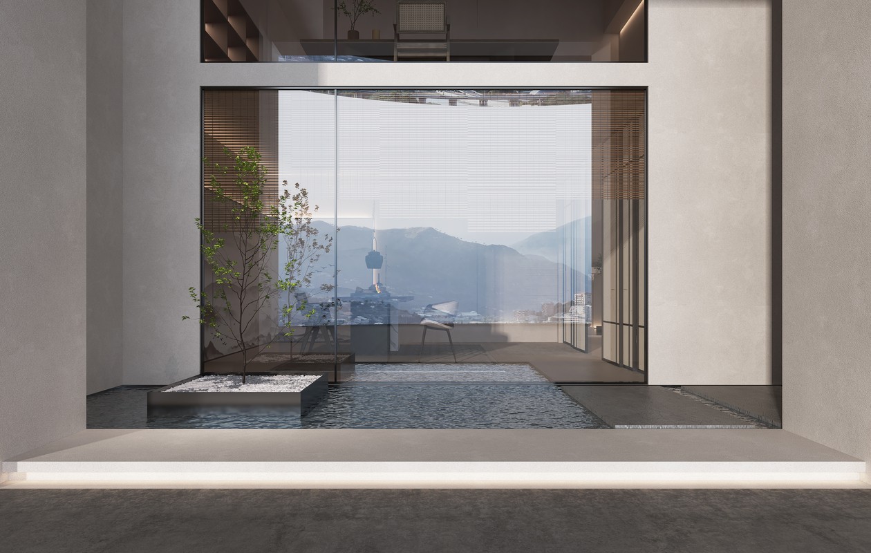 设计师在保护原有柱梁结构的基础上,为设计做了减法,采用大落地玻璃,浮空建筑本身的形体,围合成无形的界限,即将四周景色与室内空间相互打通,又增强了采光性与通透性。走入其中,有一种虚实之间的交错感,犹如“一切诸法悉皆如梦”的道法自然。值得一提的是,左右楼梯的设置,给人“柳暗花明又一村”的新鲜感,更是成就了东方之美的“琵琶遮面”的神秘含蓄与“明月大江”的从容宁静。