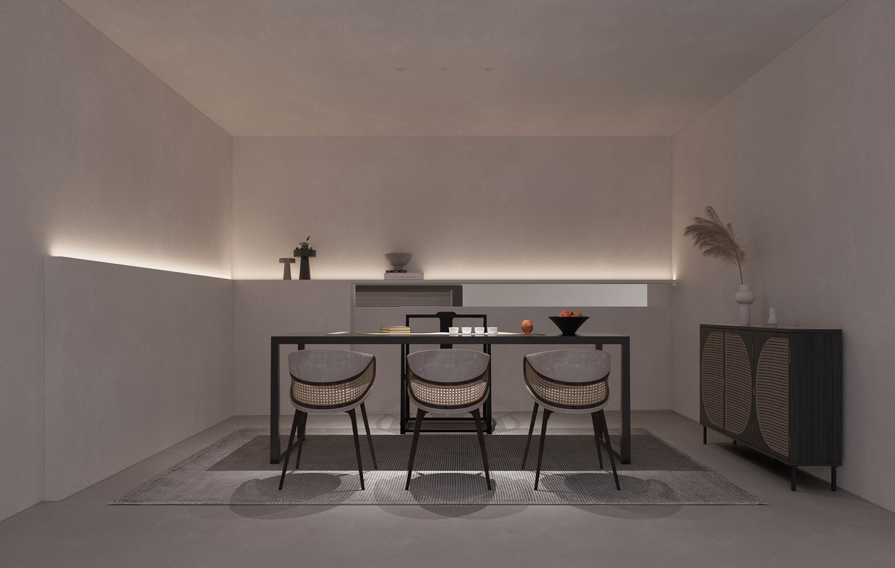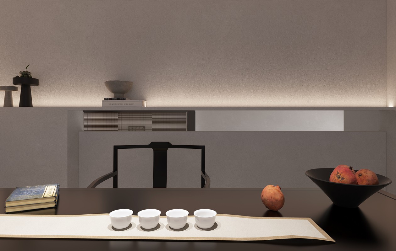 极具仪式感的、对称性的空间细节,在家具的布置、门窗的阵列中,开辟出一条充满“松弛有度”的姿态,以傲然的身姿伫立于每一个立面之上,相互陪伴与对衬,孤寂而生机盎然。在这里,每一位驻足者可以细数每一寸素雅的界面,在时光中蔓延的故事,可以肆意抒写恬静温暖空间的氛围,在无限延伸的期限里,心安气足的精神对话。正所谓,忘怀尤在此,心静见十方。静候,无界伴茶里的石谷香。