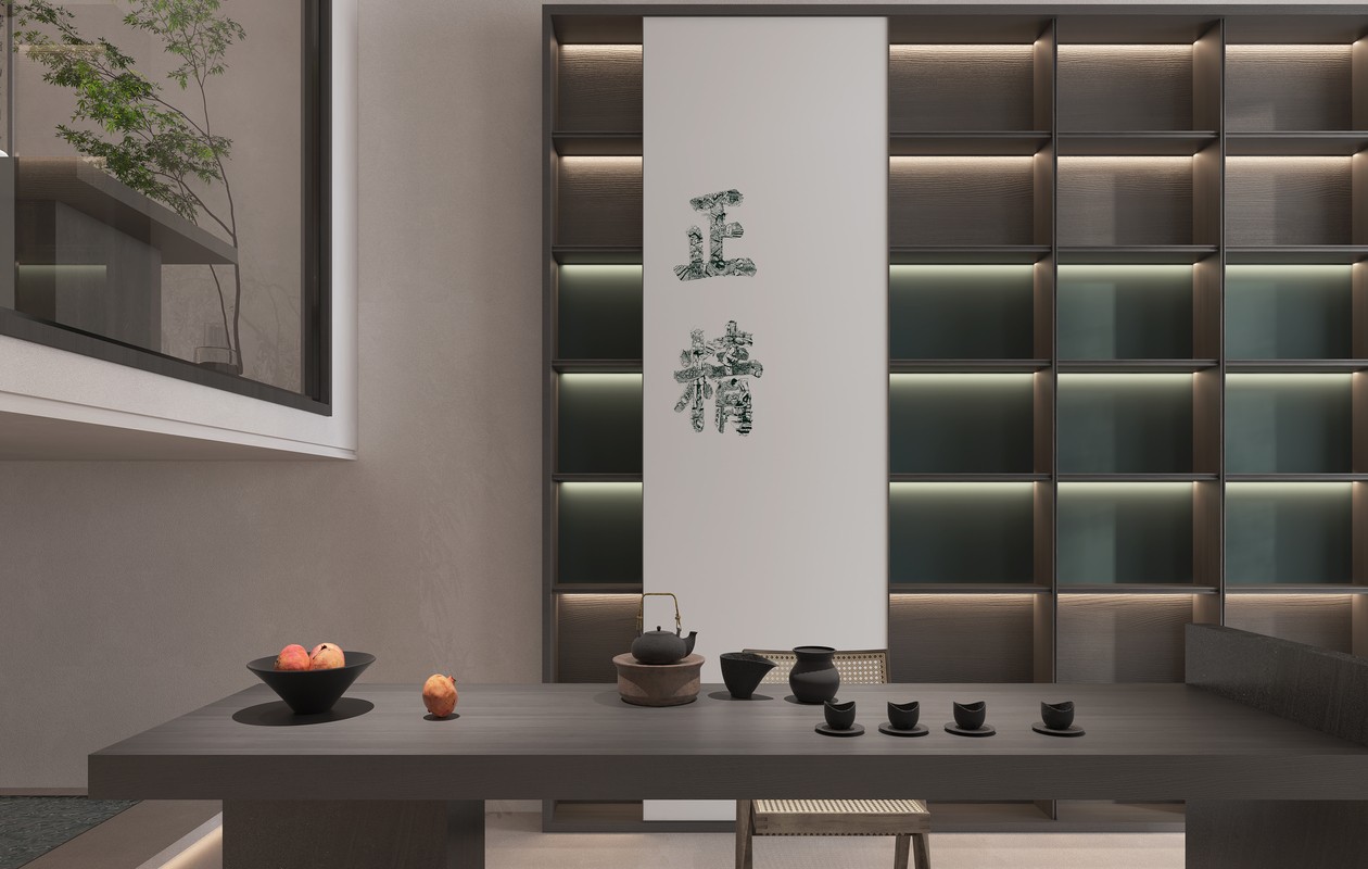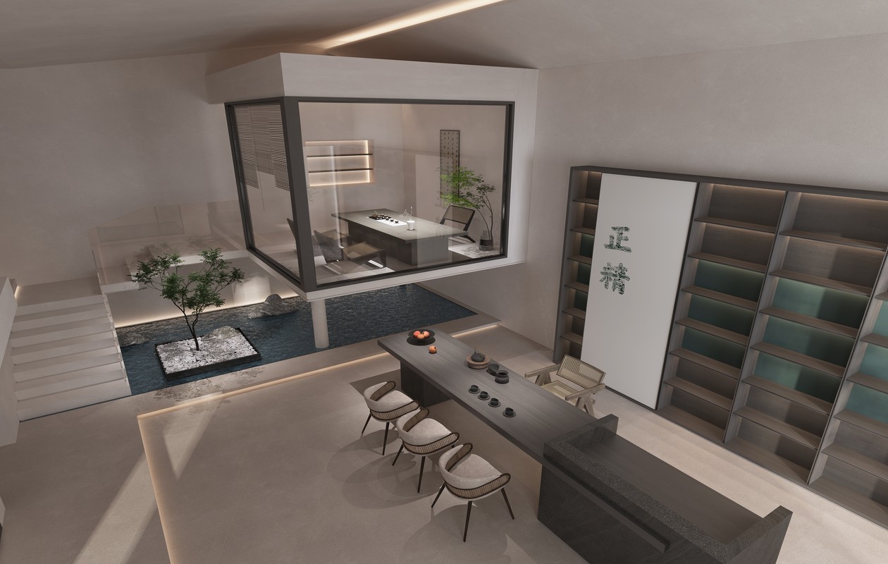 设计师用自身设计言语及设计修辞,向人们传达出对生活与美,内容与形式的态度和立场,即像是喃喃自语,又像是娓娓诉说着对茶的态度。“正”本溯源,“精”于一室藏,设计师将原门面内推,颠覆了传统中式茶室的浓厚度,而是将室内造景纳于其中,用石板、竹、树木、水、枯山水等元素“简”中求“精”,成就人与自然和谐的诗意状态。一草一木,一杯一盏,释然着包容,承载着空间本身的结构特点,体现出独特的精神气质。