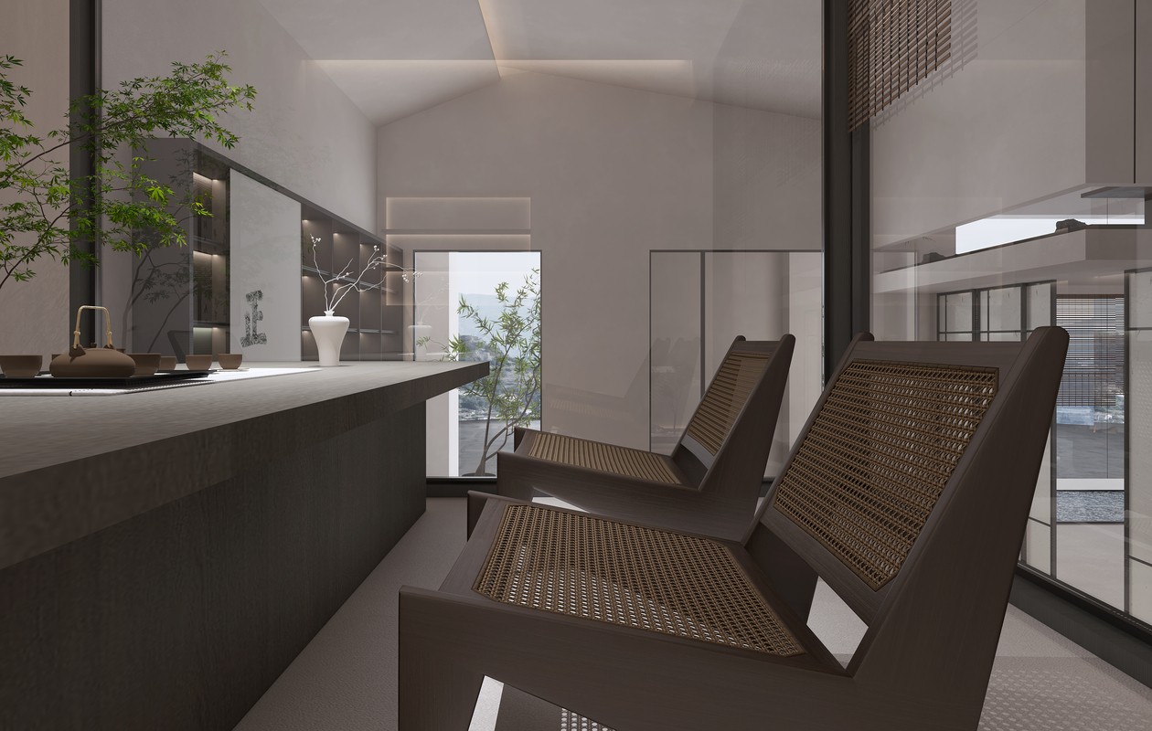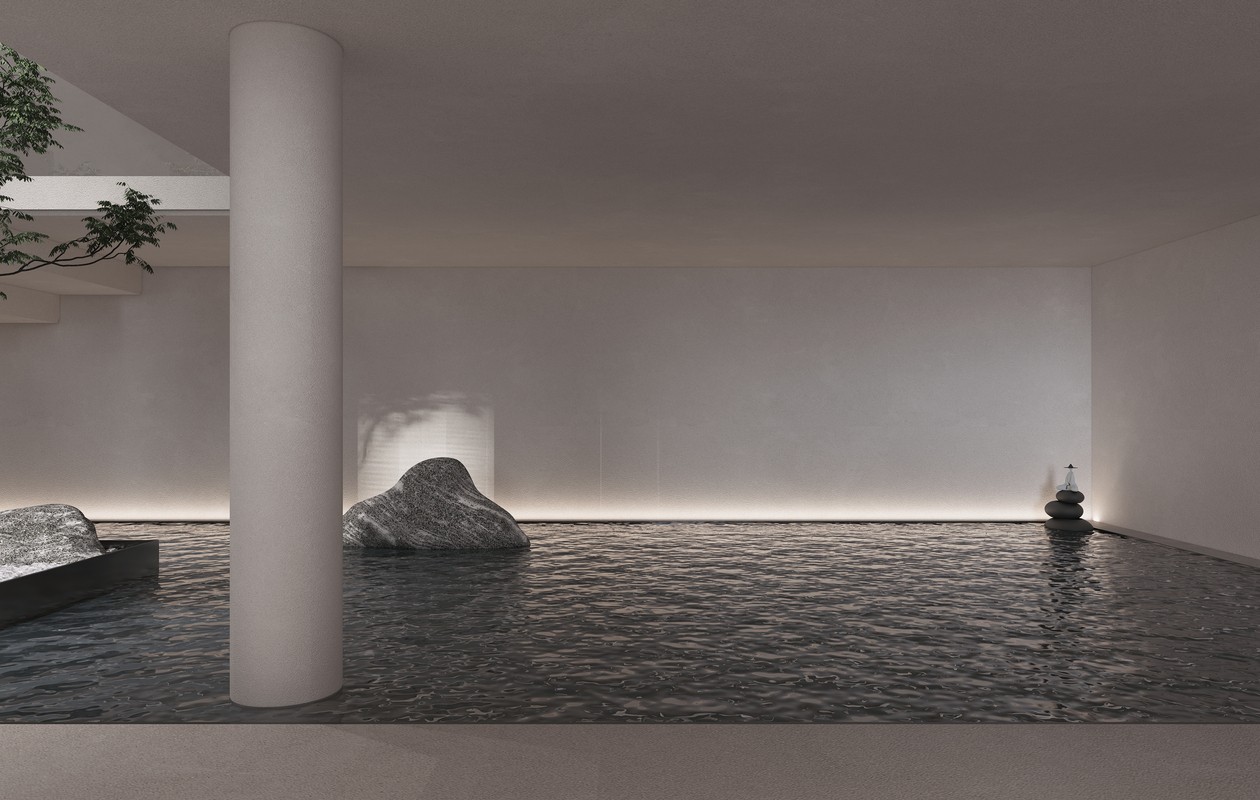 在茶室功能明确的前提下,为了达到文化与建筑共生的目的,设计师用“漂浮”和“枯山水”结合的方式,通过构建天然的设计手法,融入天地之间,删繁从简,让空间与空间的相互借景,去除浓墨重彩的色调,摒弃雕梁画栋的繁复,仅靠自然之美就散发出古雅而清新的现代简约之魅力所在,再现了一个宁静的、艺术化的“冥想空间”。