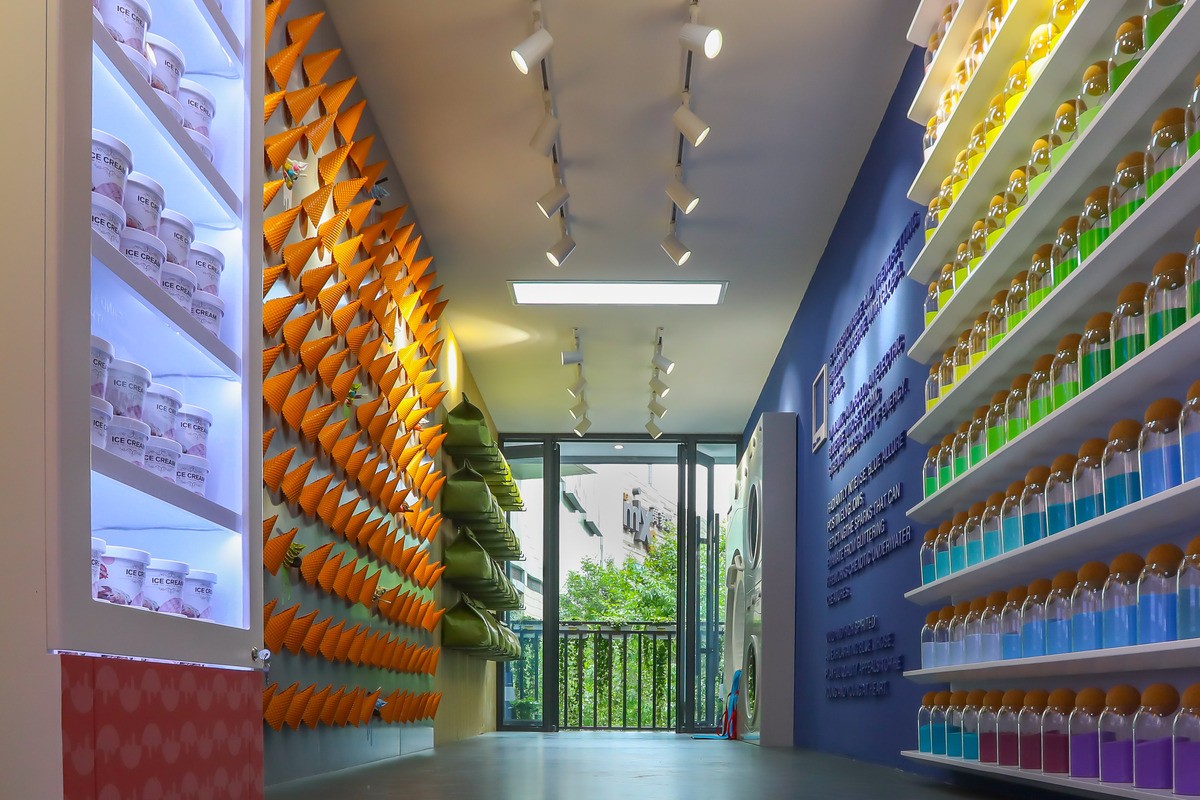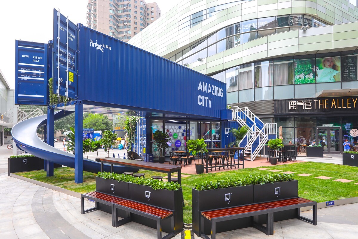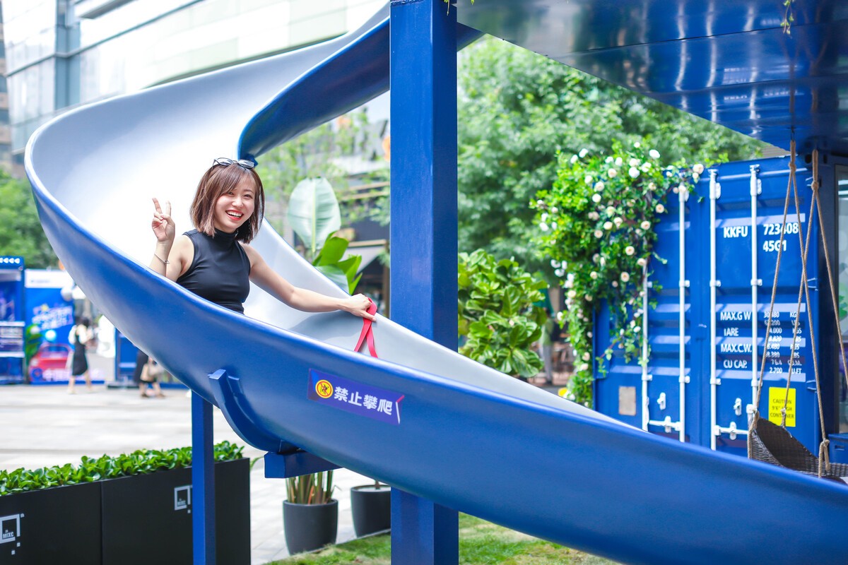 设计师以二手集装箱为载体,利用周围的开放空间与治愈的色彩弱化了集装箱的工业风格,在一层的布置上,设计师用整片墙面展示了PANTONE每年的流行色彩,墙面上的抽屉可以作为置物箱供城市居民进行礼物交换,设计师希望通过这个设计传递人与人之间的温情,治愈城市的伤怀。二层的集装箱被粉刷成不同的颜色区间,适合人们在里面拍照打卡,抑或是人们在这个喧嚣的城市里可以得到片刻安静和喘息的空间,二层和一层通过一个巨大的滑梯进行链接,滑梯的入口被设计成洗衣机造型,增添创意趣味性的同时提升用户的体验感。
