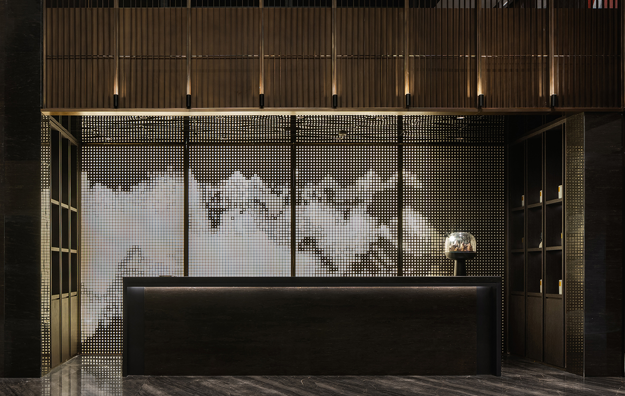 “新东方重构主义——传统东方美学与当代艺术的碰撞再融合。”外立面入口灵感来源于莱特的流水别墅,门庭镜水影池波光浮动,卵石如丘缀于其间,不锈钢结构与大面玻璃幕墙结合的现代东方建筑剪影倒映于池,竹影映清泉,泉水清如镜,水在石中绕,呈现一派清幽雅静意境,脱去一身尘嚣感受都市里的宁静。